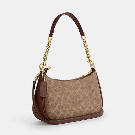 The Coach Teri Shoulder Bag in Signature Canvas combines iconic style with practical design. Crafted from durable signature canvas in a sophisticated blend of gold, tan, and brown tones, this bag offers both elegance and everyday functionality. Its structured silhouette and adjustable strap provide comfortable wear, while the spacious interior keeps essentials organized. Ideal for those seeking a timeless accessory that effortlessly complements any outfit with expert craftsmanship.