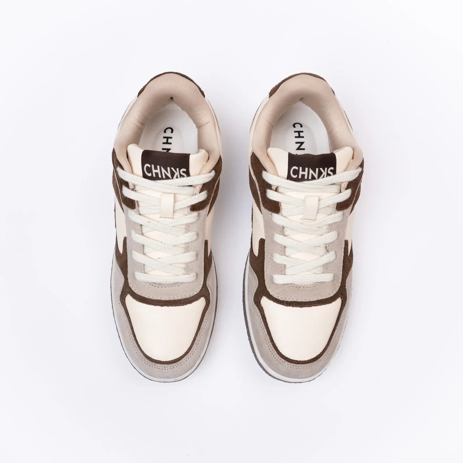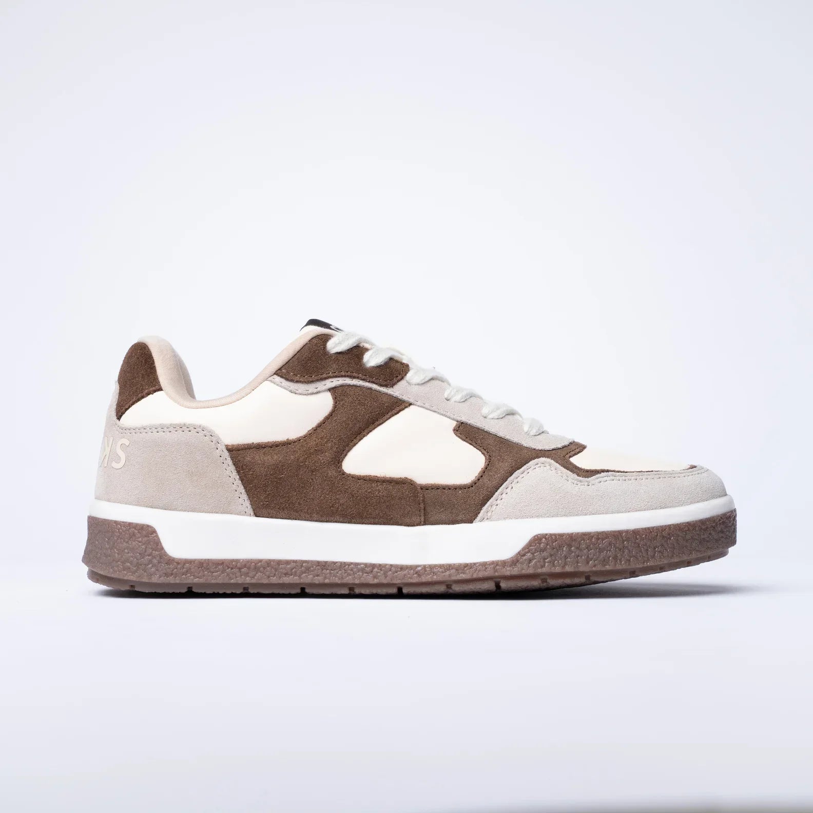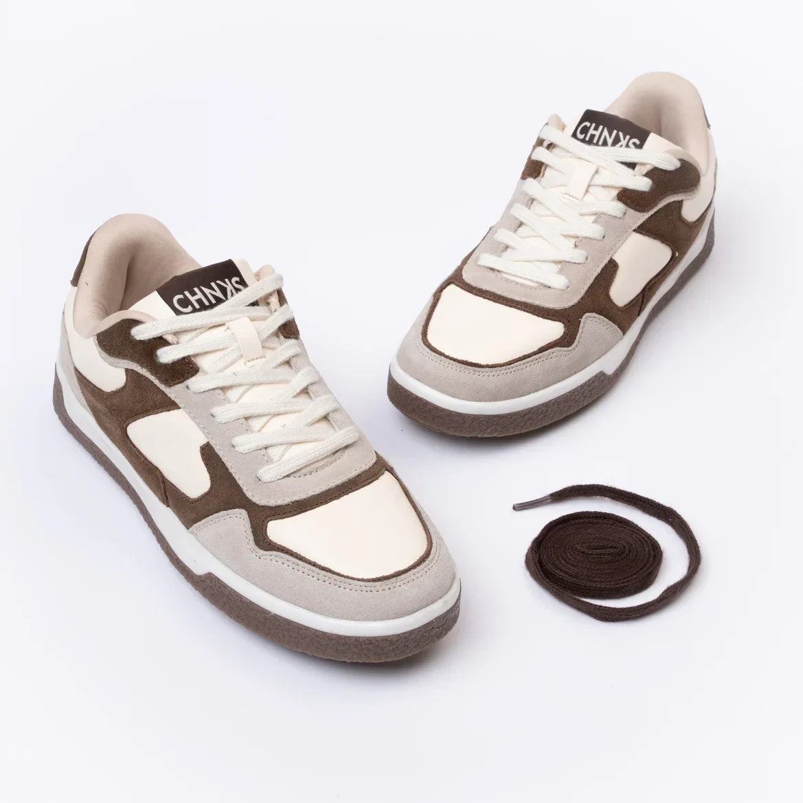 THE AFFOGATO CHNKS — a premium brown sneakers for men, perfect blend of bitter and sweet sophistication! The rich creamy white PU upper with subtle coffee brown suede leathers offer warmth and add depth to your effortless style. Revel in durability and comfort with the dual-toned TPR outsole, soft microfiber lining, and PU moulded insoles. Tie it all together with our flat cotton laces for a luscious look. The Affogato CHNKS is a delicious treat for your feet. Alternative lacing in brown colour available.