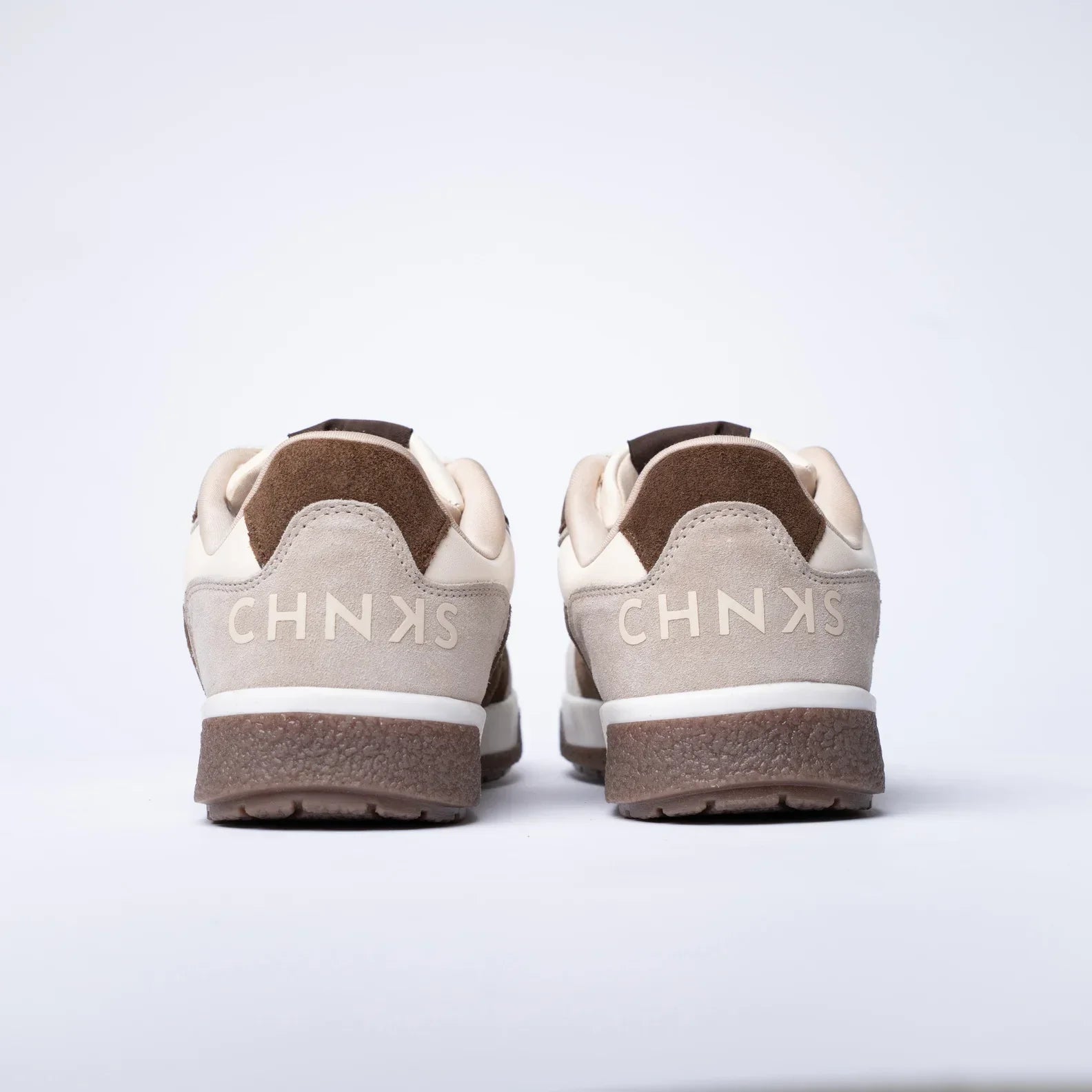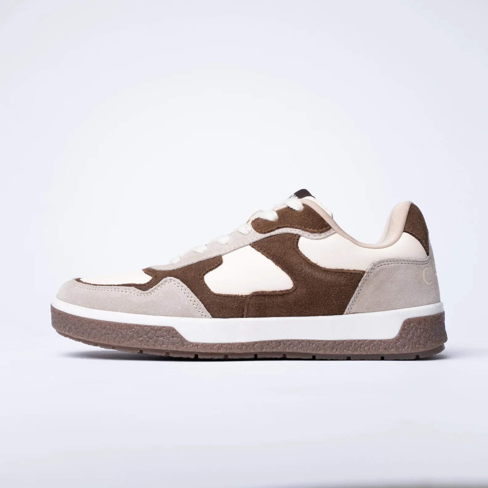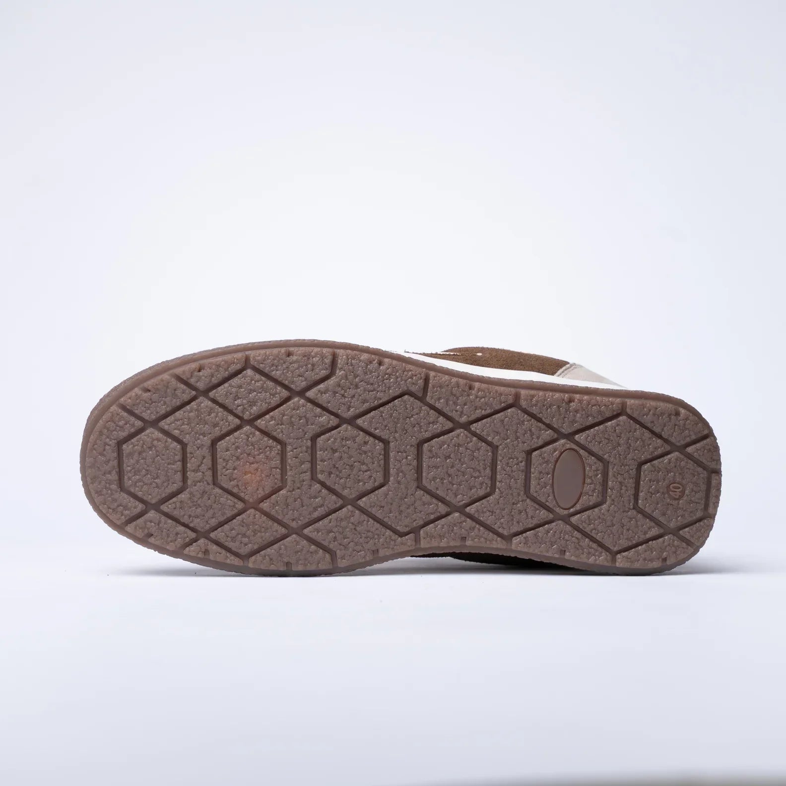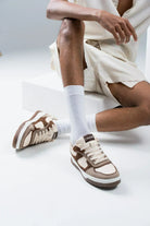 THE AFFOGATO CHNKS — a premium brown sneakers for men, perfect blend of bitter and sweet sophistication! The rich creamy white PU upper with subtle coffee brown suede leathers offer warmth and add depth to your effortless style. Revel in durability and comfort with the dual-toned TPR outsole, soft microfiber lining, and PU moulded insoles. Tie it all together with our flat cotton laces for a luscious look. The Affogato CHNKS is a delicious treat for your feet. Alternative lacing in brown colour available.