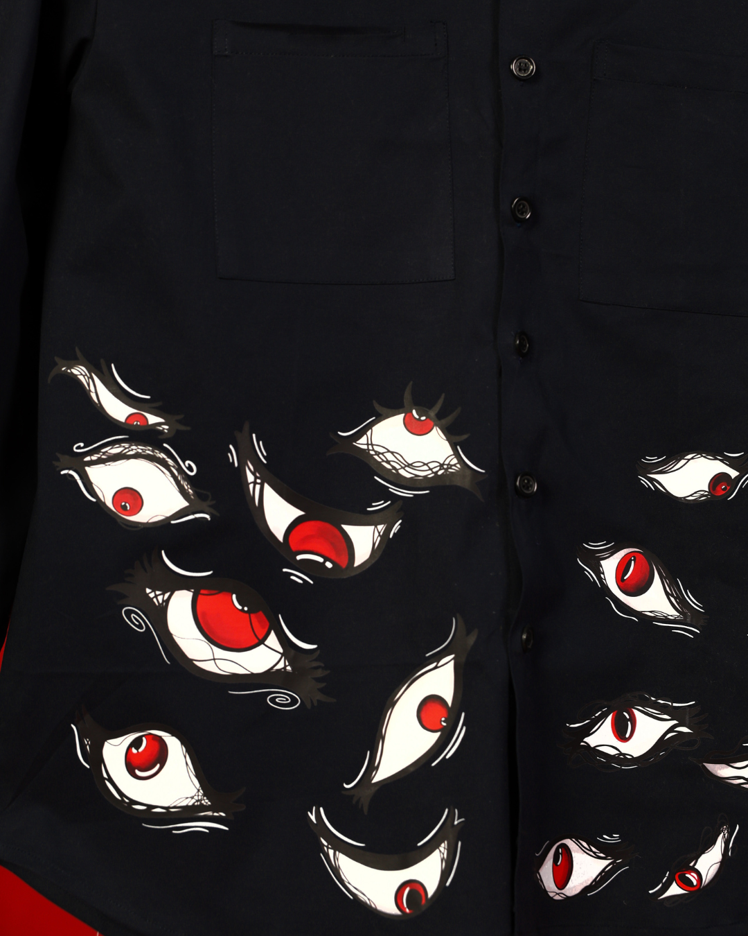 THE ALL-SEEING FEAR RELAXED SHIRT IS BUILT FOR THE PRESENCE THAT CANNOT BE IGNORED. PRINTED WITH DEMONIC, WATCHFUL EYES ALL OVER THE FRONT AND BACK, THIS PIECE TRANSFORMS THE WEARER INTO A SYMBOL OF AWARENESS // SOMEONE WHO SEES EVERYTHING, FROM EVERY ANGLE.