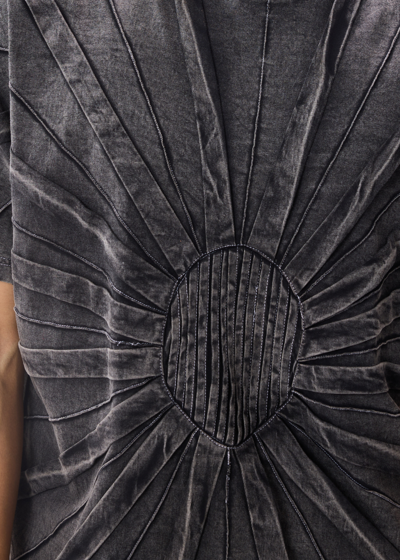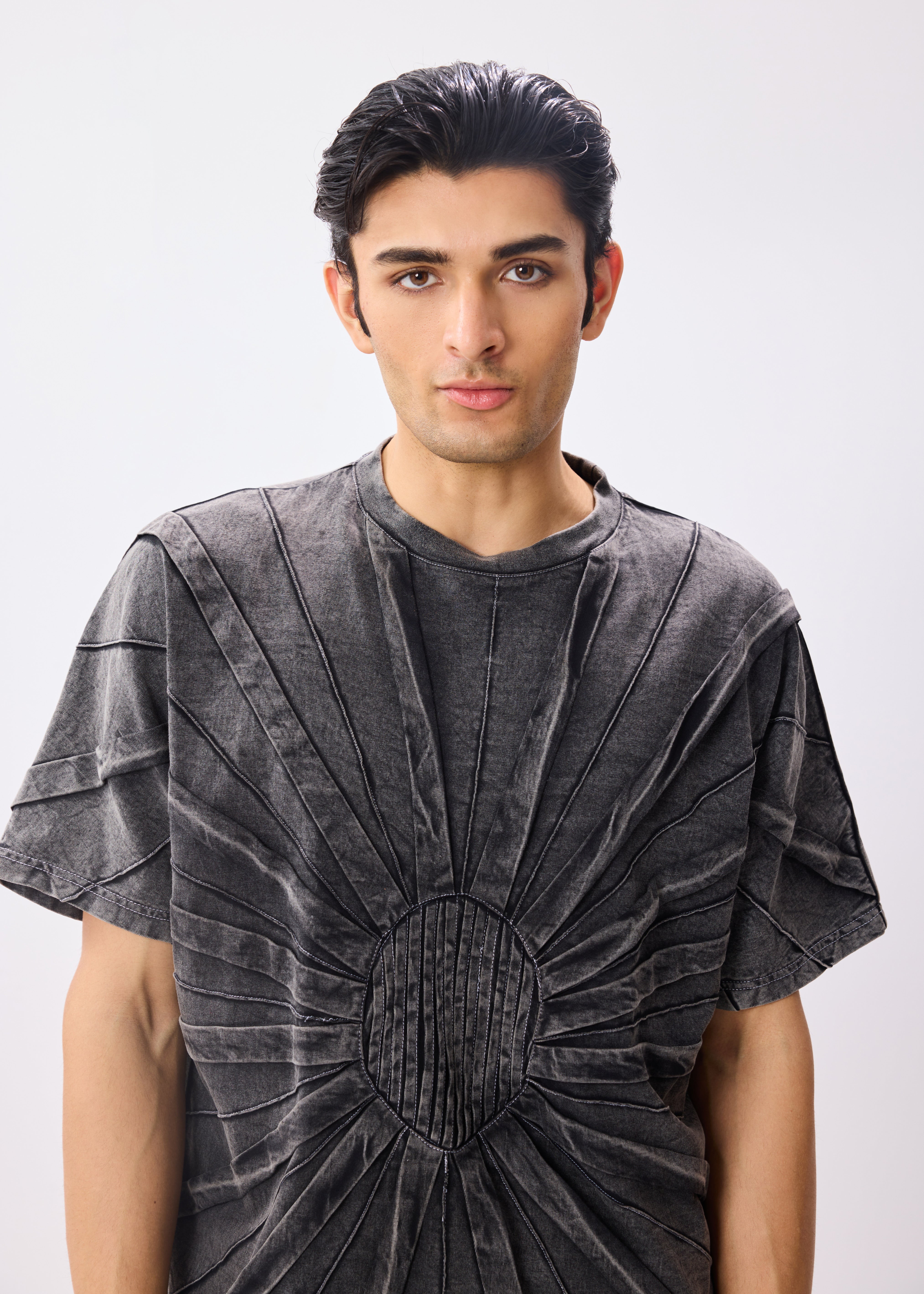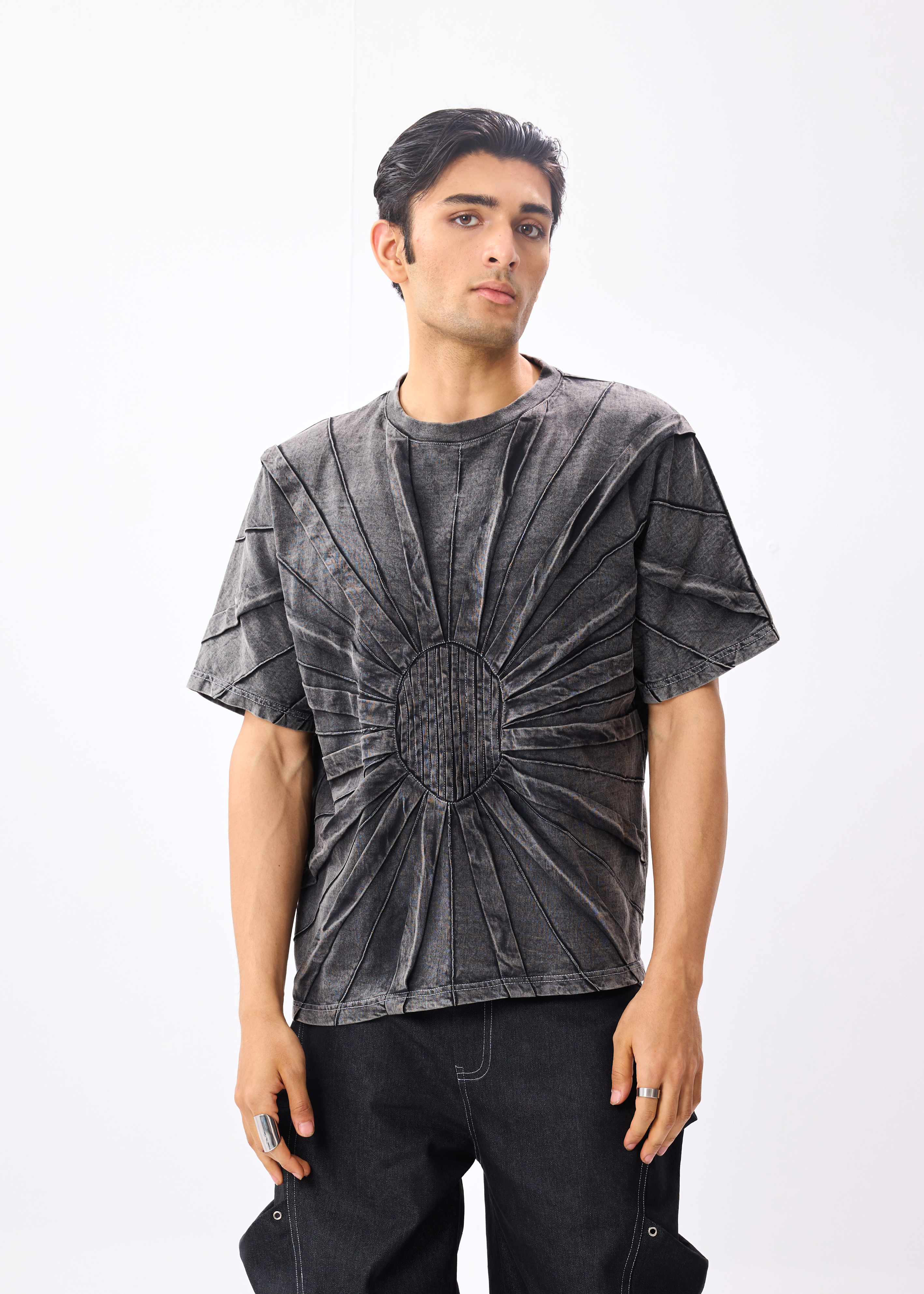 The Almighty Tee- our take on a classic tee, adding our very own manipulation techniques to make it “ALMIGHTY”. With a combination of pleats and pintucks, the shape and formation of this tee resembles a sun, it’s rays passing through your whole body when you put it on. Acid washed to highlight the details even more.