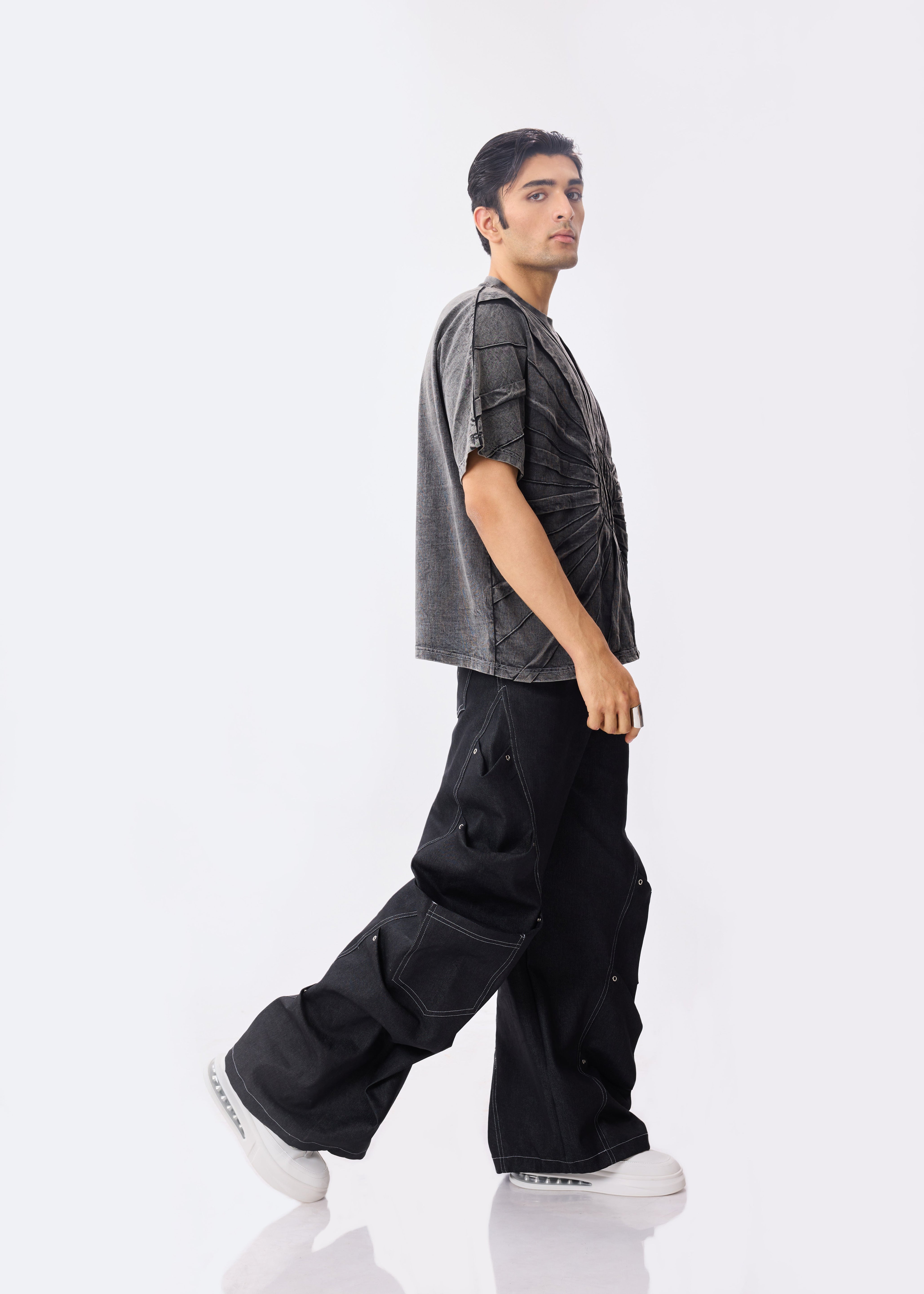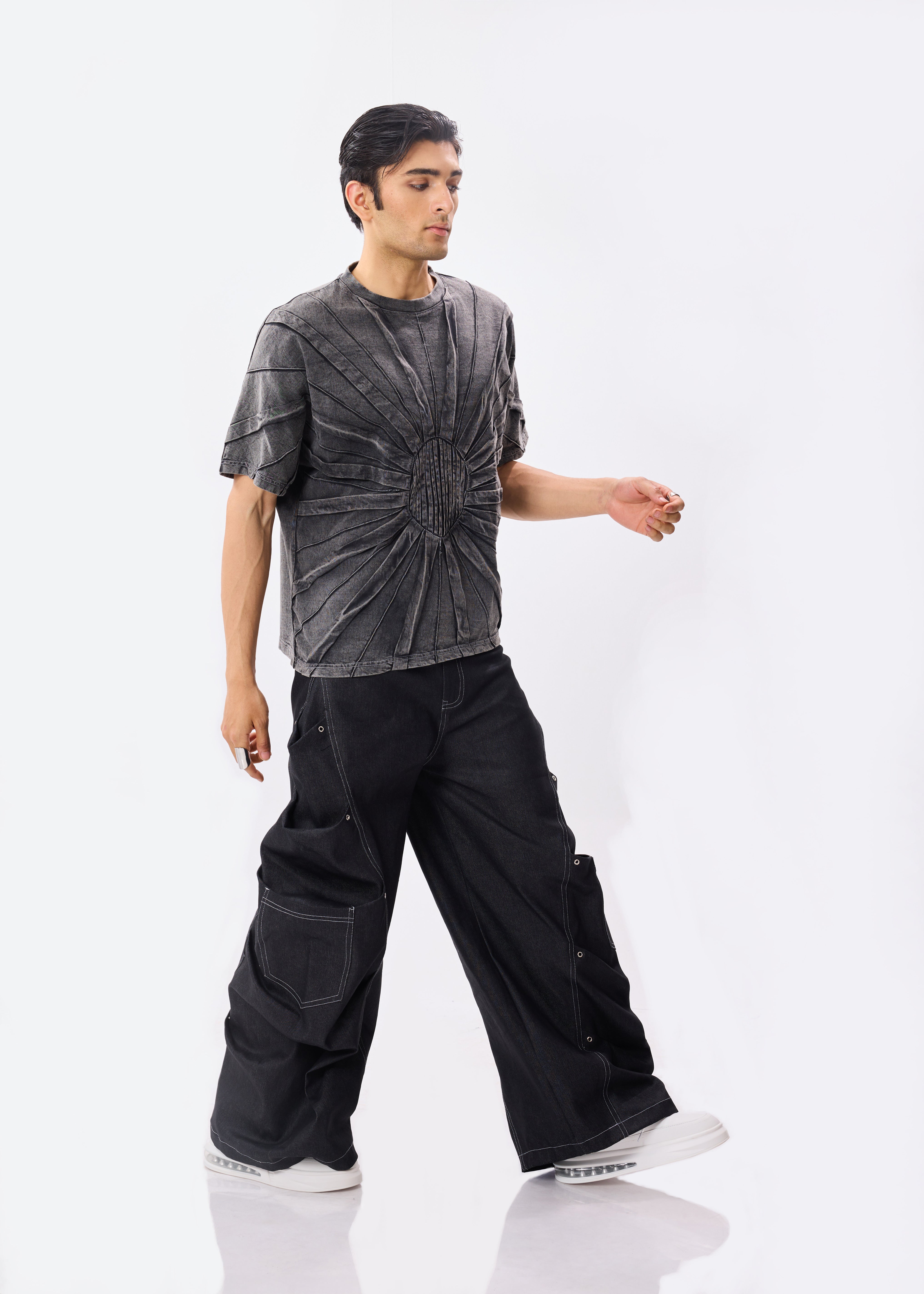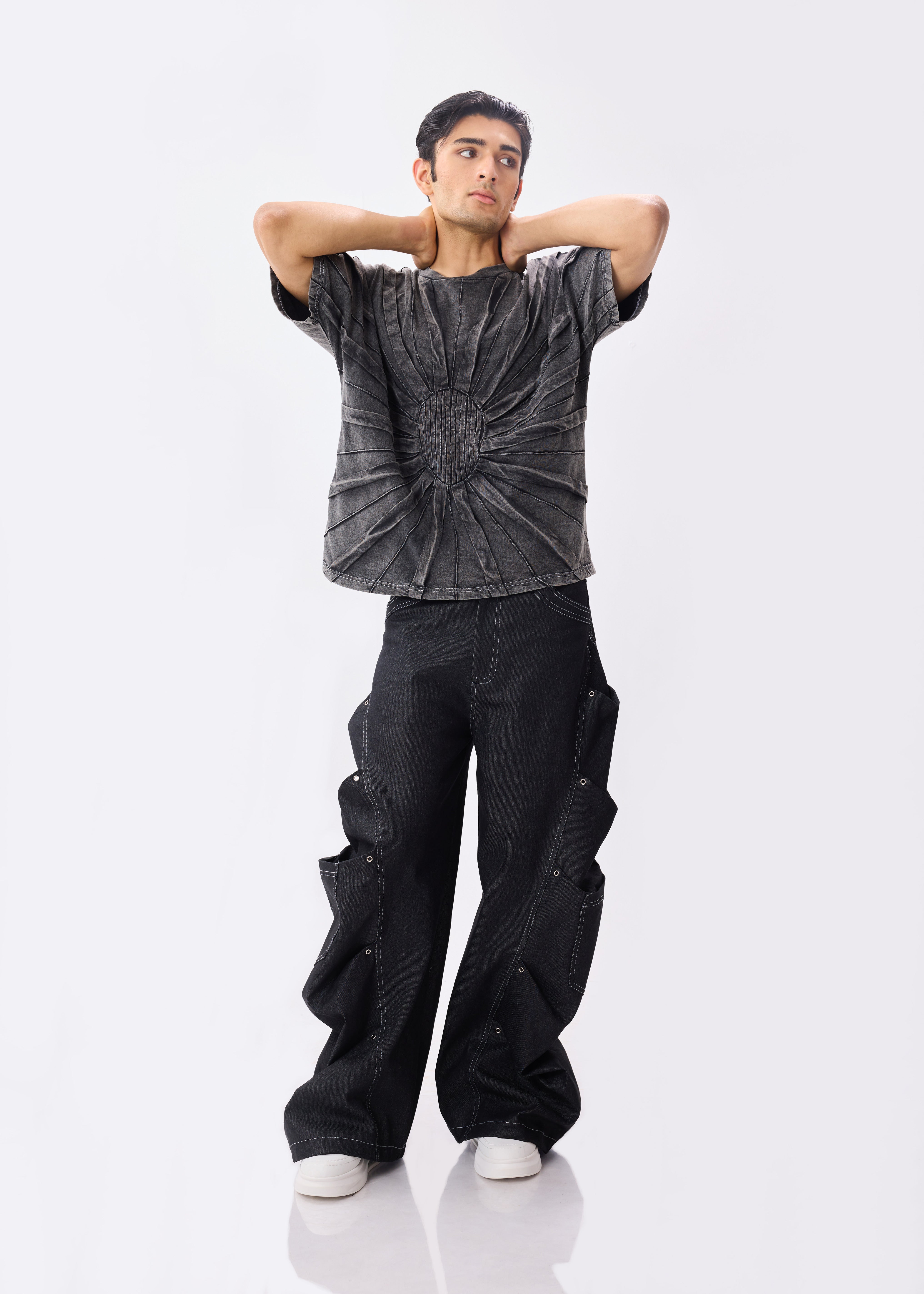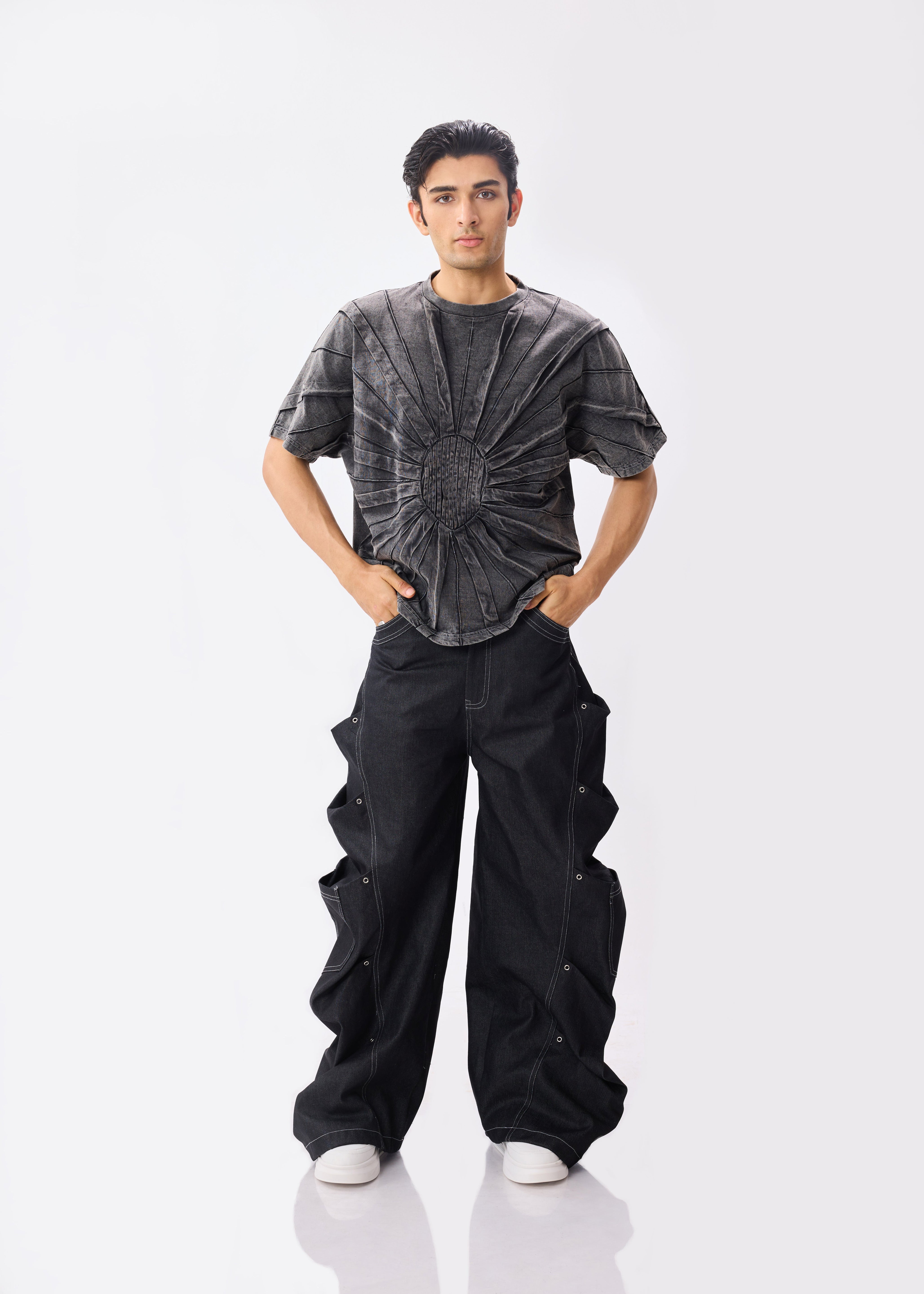 The Almighty Tee- our take on a classic tee, adding our very own manipulation techniques to make it “ALMIGHTY”. With a combination of pleats and pintucks, the shape and formation of this tee resembles a sun, it’s rays passing through your whole body when you put it on. Acid washed to highlight the details even more.