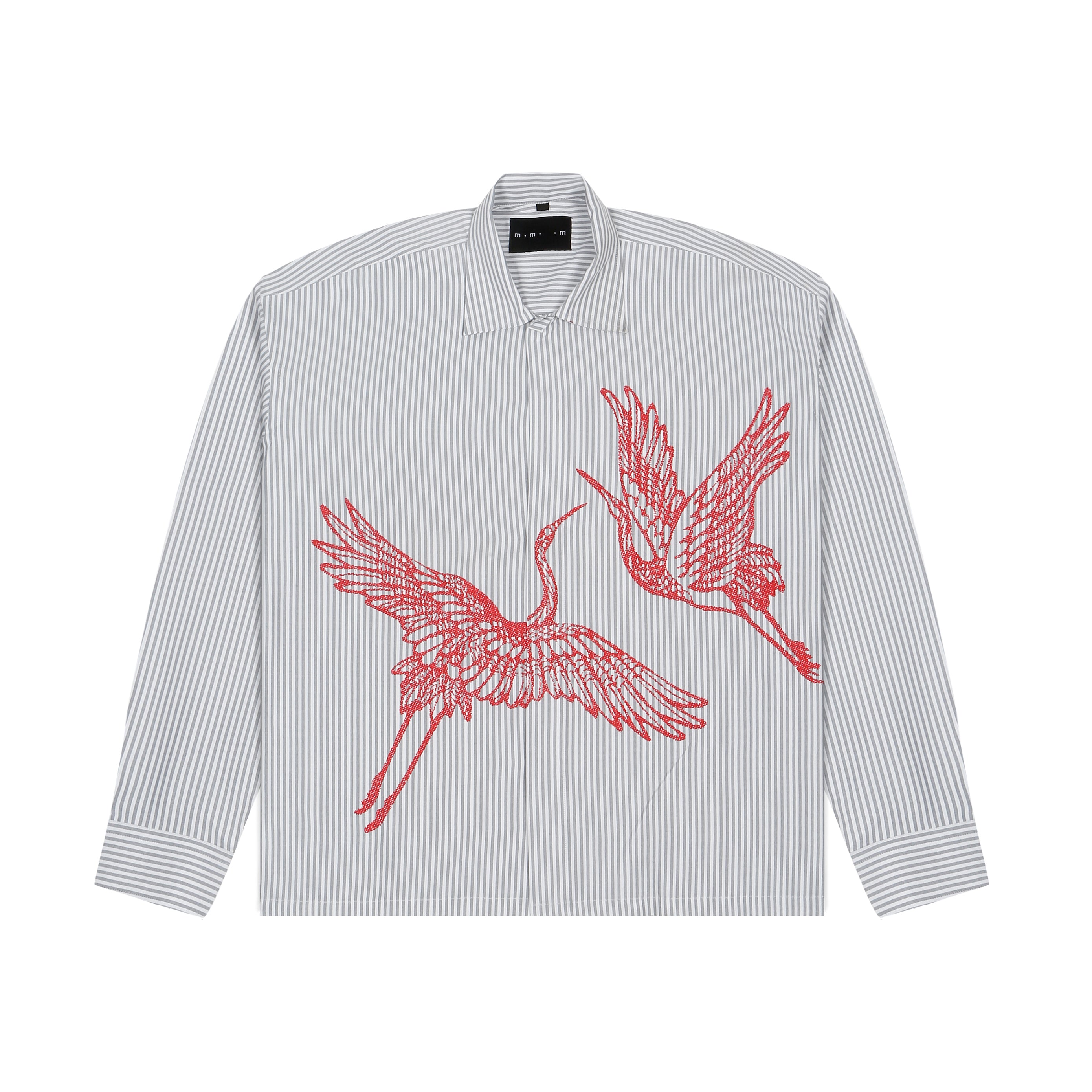 THIS OVERSIZED GRAY AND WHITE FULL-SLEEVE SHIRT FEATURES A STRIKING PRINT OF JAPANESE CRANES, SYMBOLIZING LONGEVITY, GOOD FORTUNE, AND STRENGTH. THE CRANES STAND OUT IN BOLD RED—ALSO THE PRIMARY COLOR OF THE BRAND—AGAINST THE NEUTRAL BASE. WITH A DROPPED YOKE LINE ON THE BACK ALONG WITH A SIGNATURE LABEL, THIS SHIRT COMBINES METICULOUS GLOBAL CRAFTSMANSHIP WITH MINIMALIST DESIGN. CONCEALED BUTTONS KEEP THE LOOK CLEAN AND UNDERSTATED, LETTING THE ARTFUL CRANE PRINT TAKE CENTER STAGE.