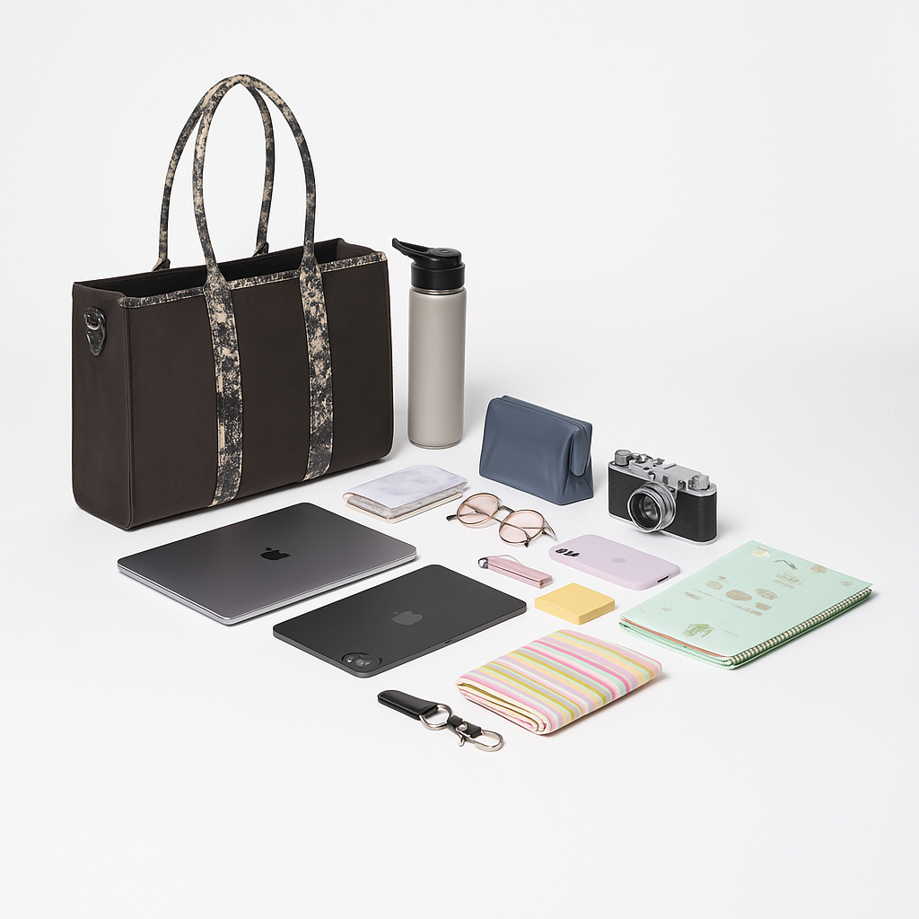For the ones who carry it all. The Large Tote is spacious enough to fit your laptop, chargers, files, a water bottle, and more – perfect for work, travel, or long days on the go.