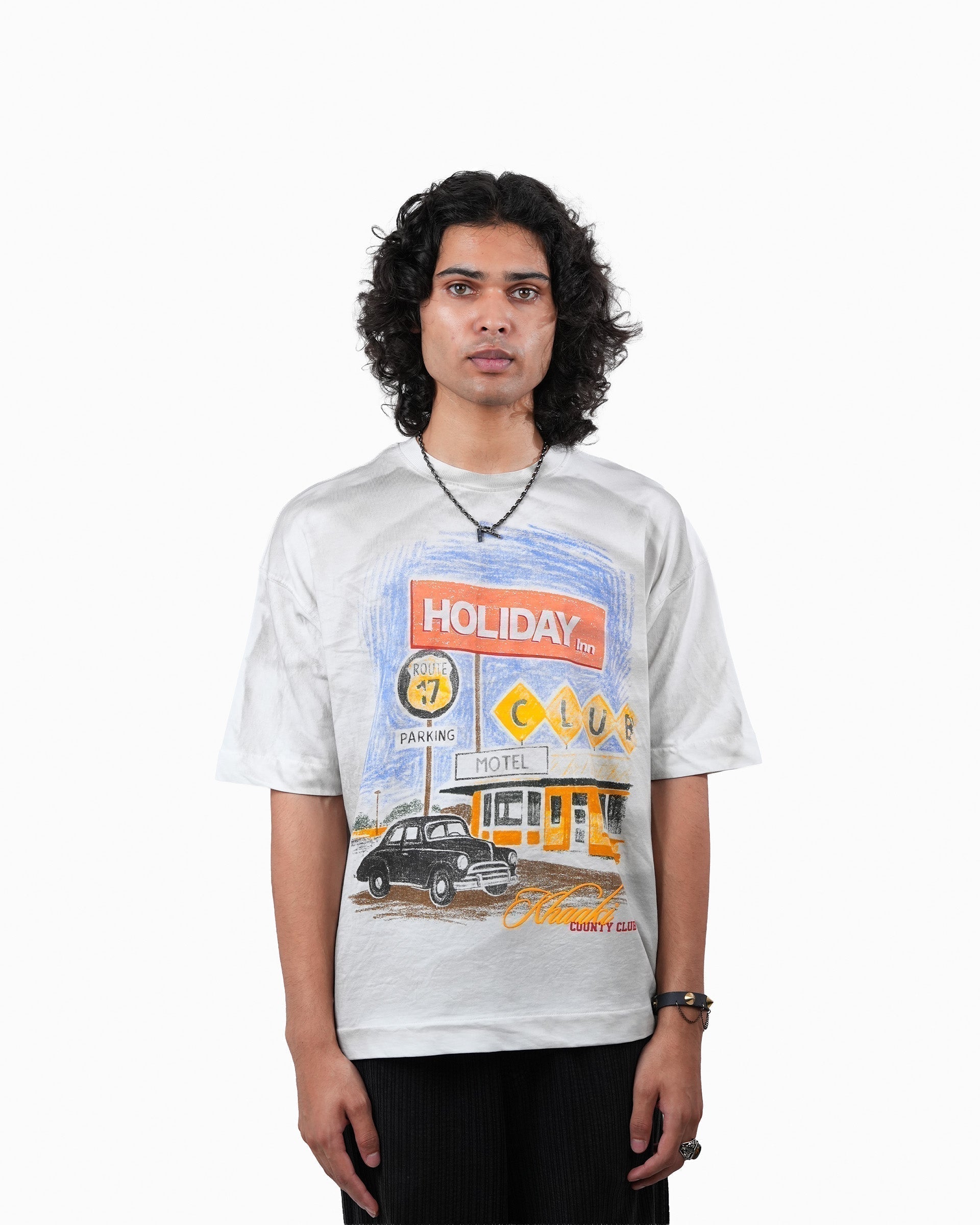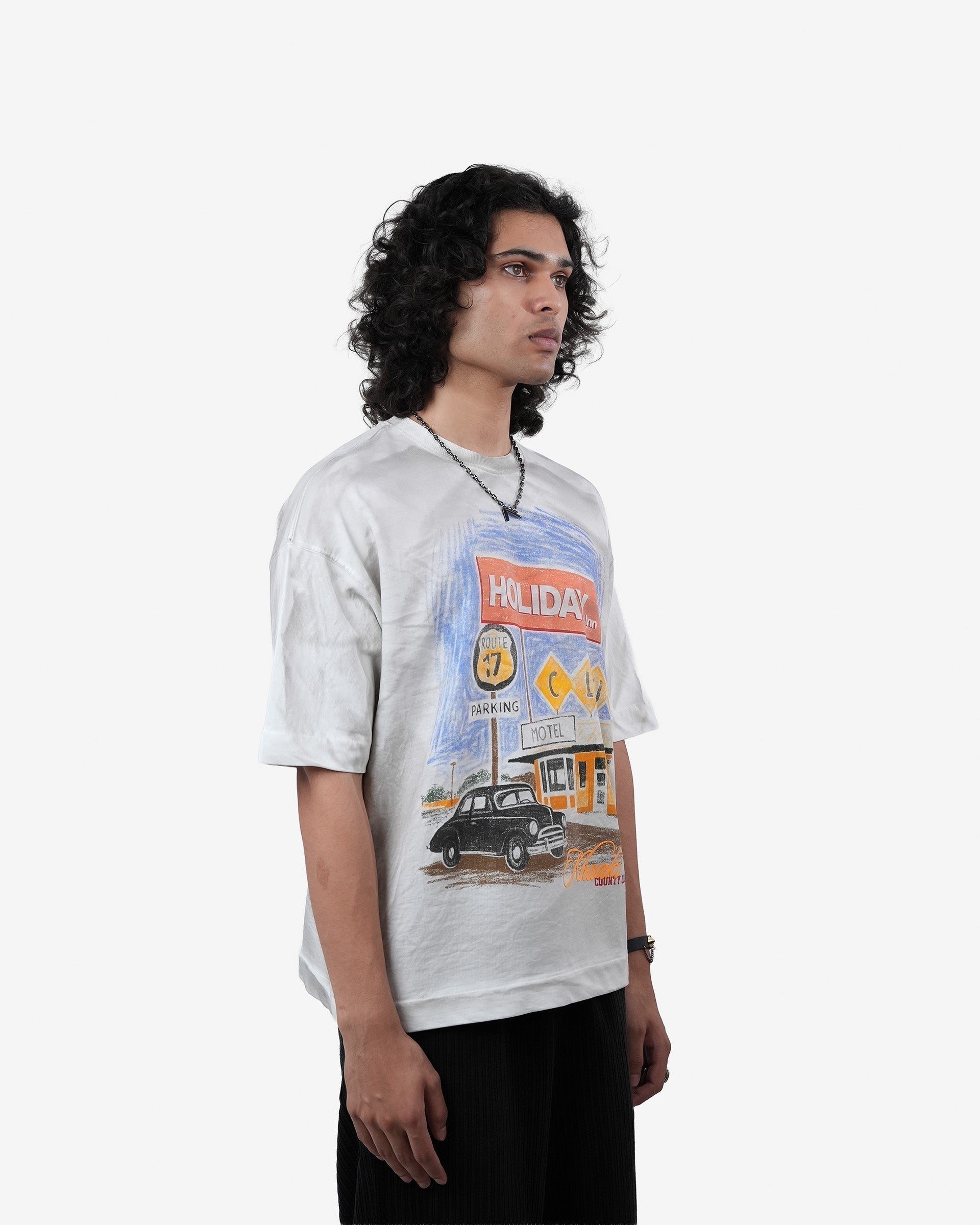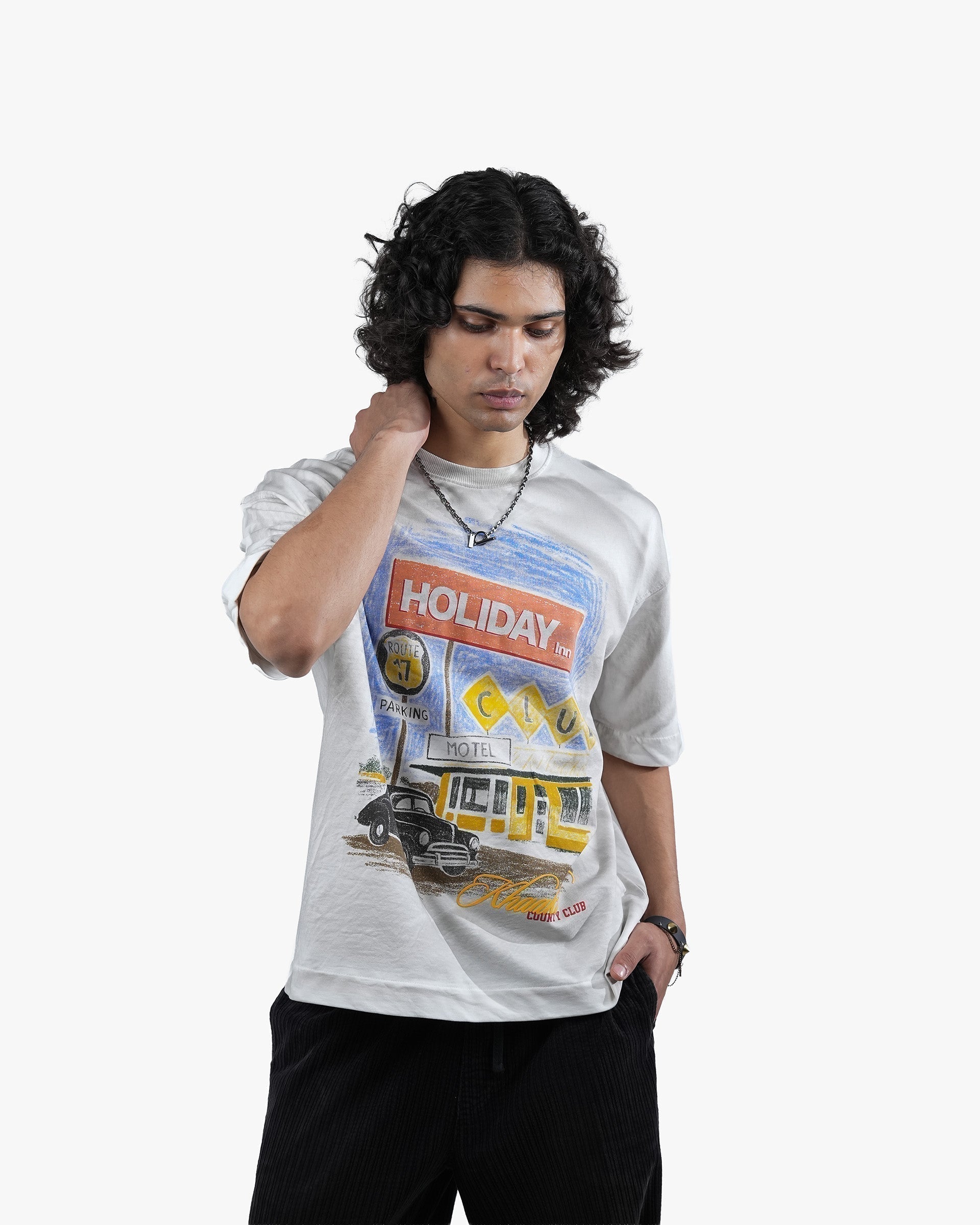 The Holiday Inn Tee is a vintage-inspired piece that showcases classic Americana and retro motel charm. Featuring a pigment screen print and washed finish, it captures the faded nostalgia of the open road.