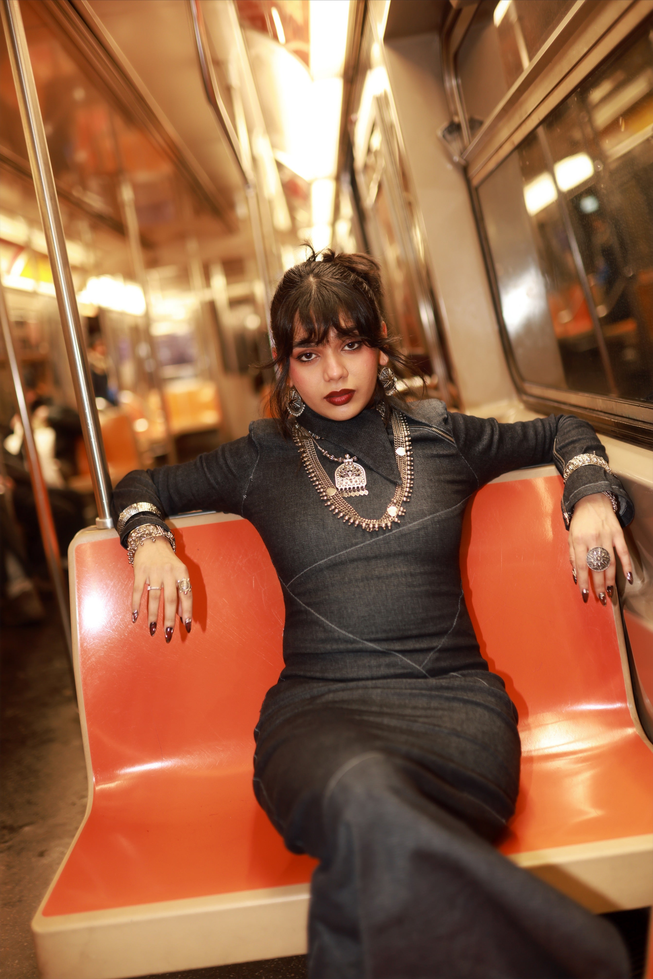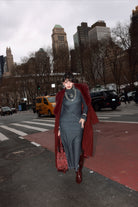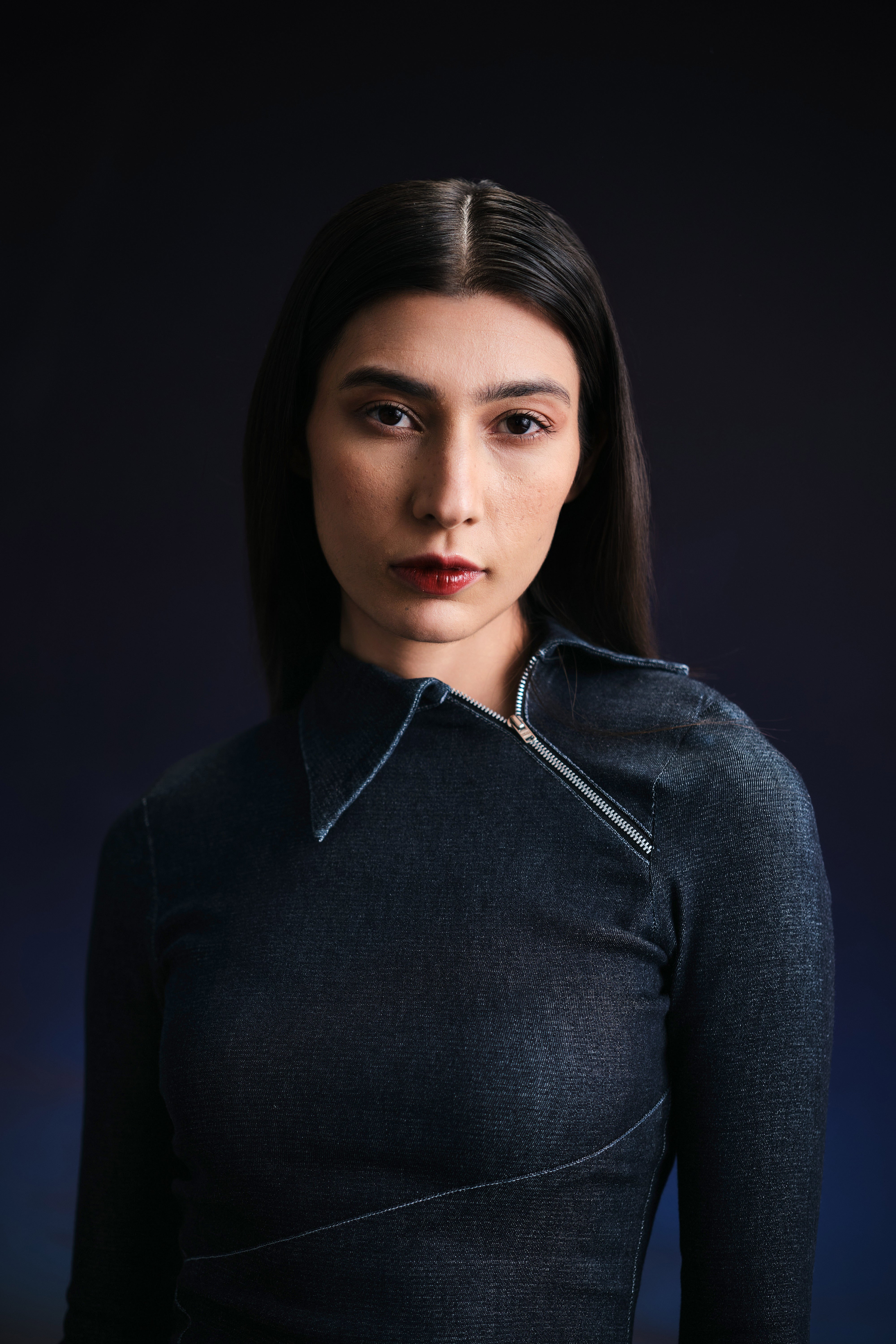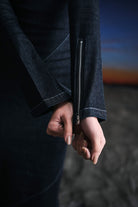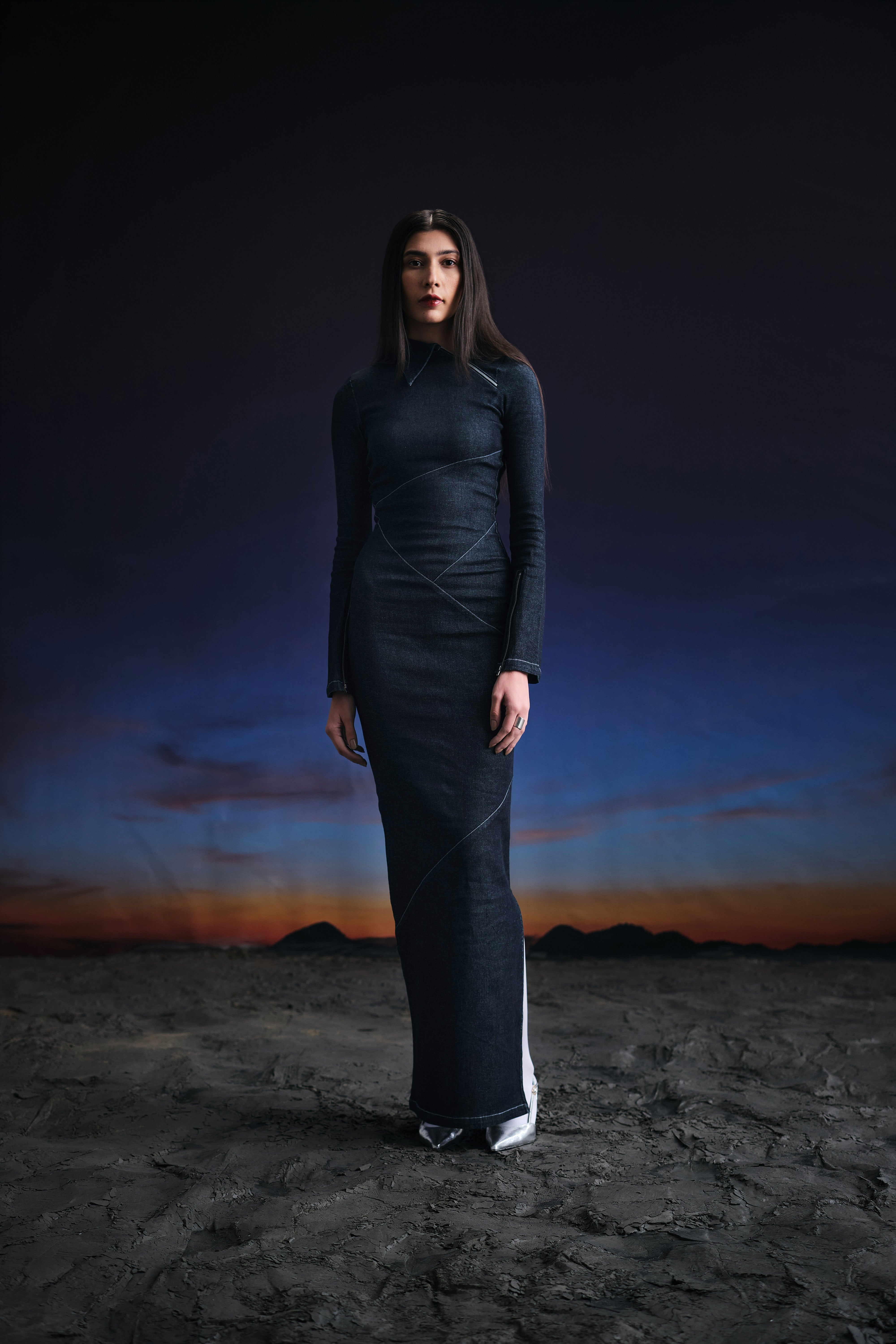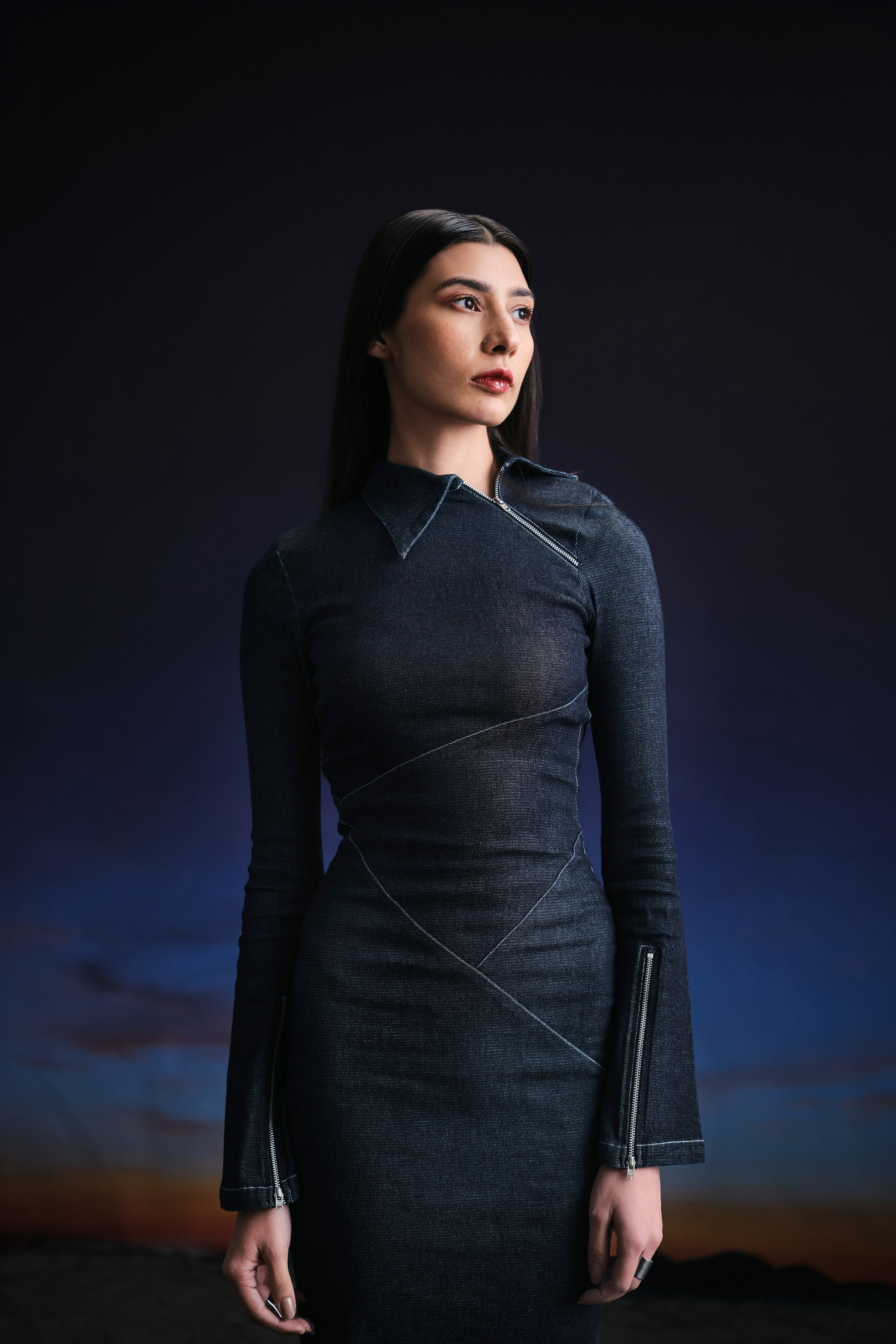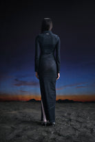 Precisely crafted floor length body con dress featuring assymetrical panels intelligently placed on the body, highlighting the natural curves. An edged asymmetric collar detail, along with padded shoulders for structure.A metallic zipper extending from the collar to the armhole ads to the charm of the dress. Fit and flare sleeves with zippers at end enhance the overall look. Made in a highly stretchable denim fabric, acid washed while maintaining the dark blue colour, highlighted through contrast stitches. Finished with a zipper on the side and a side slit for comfort.