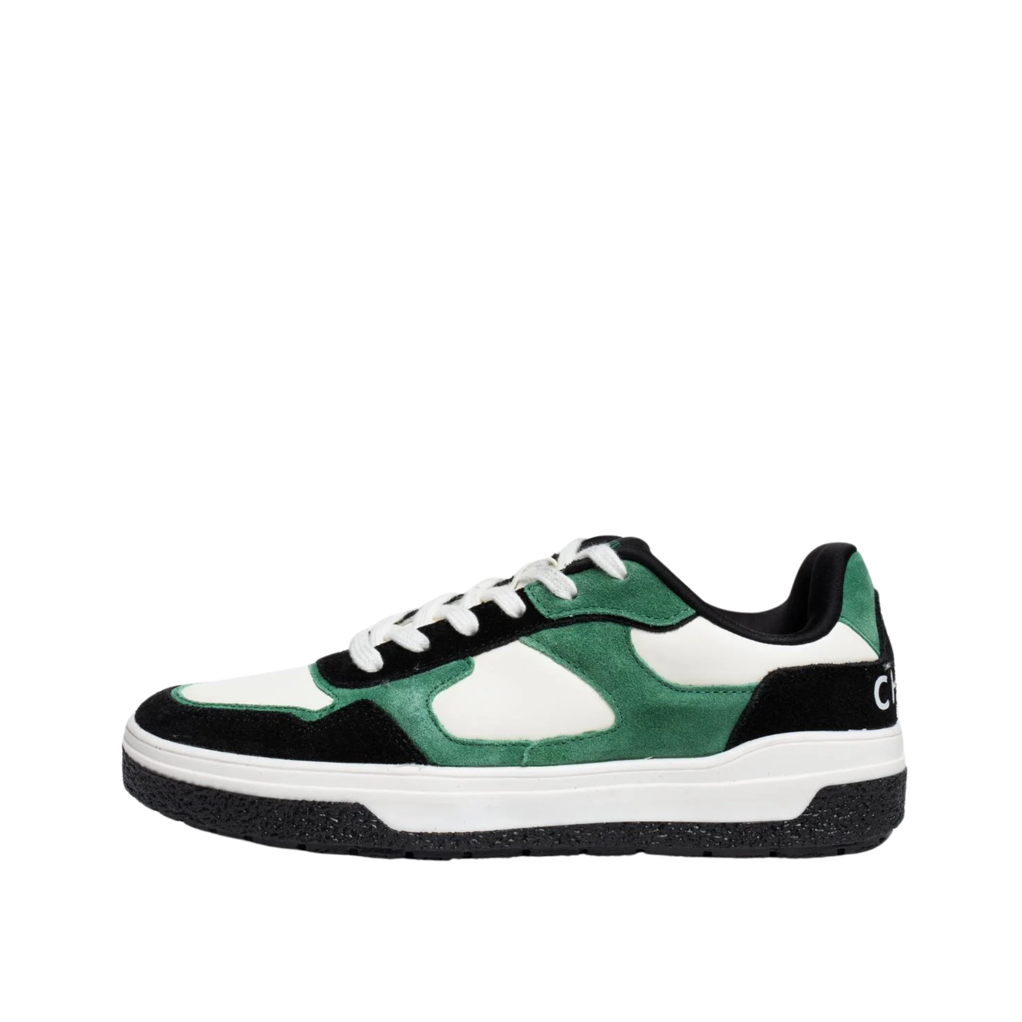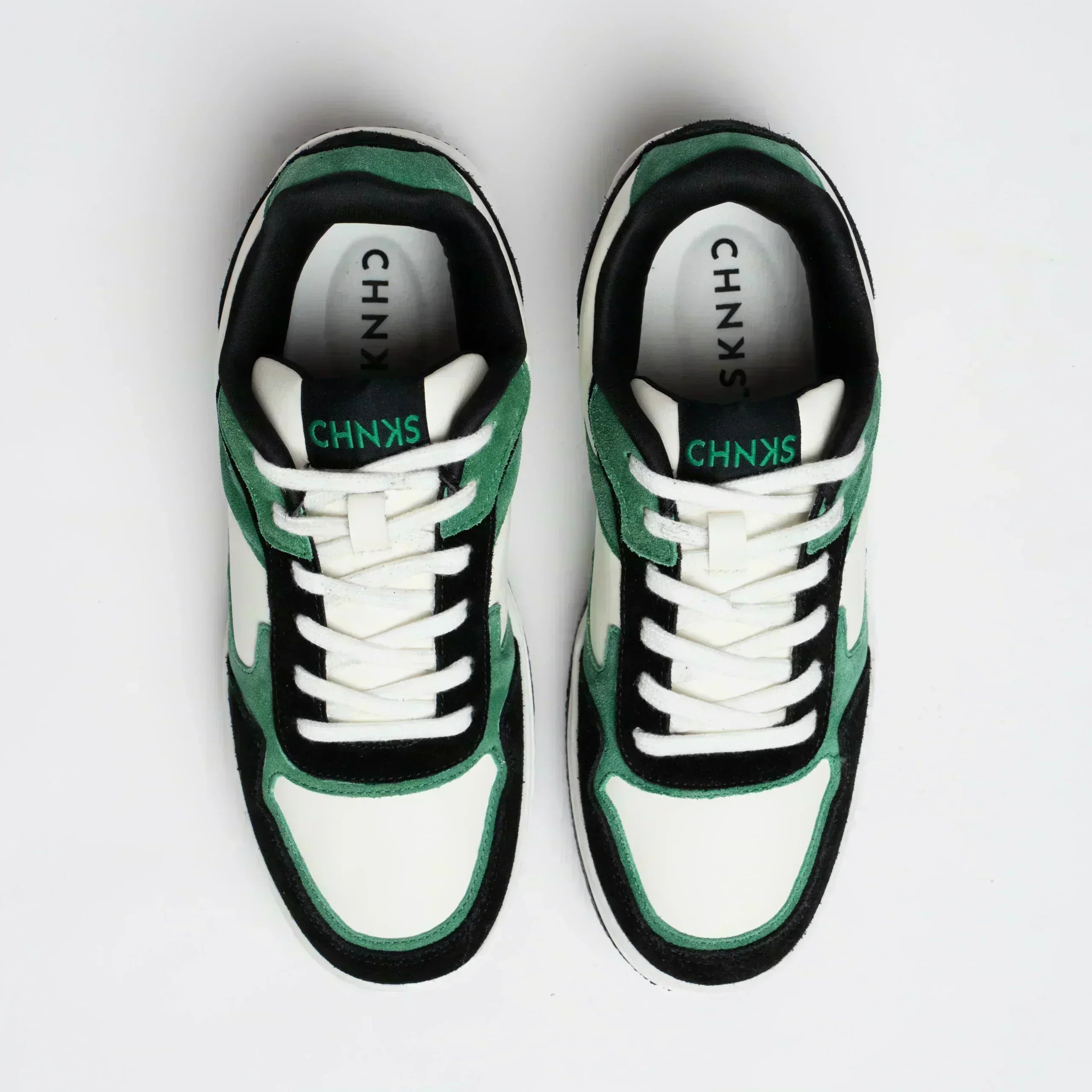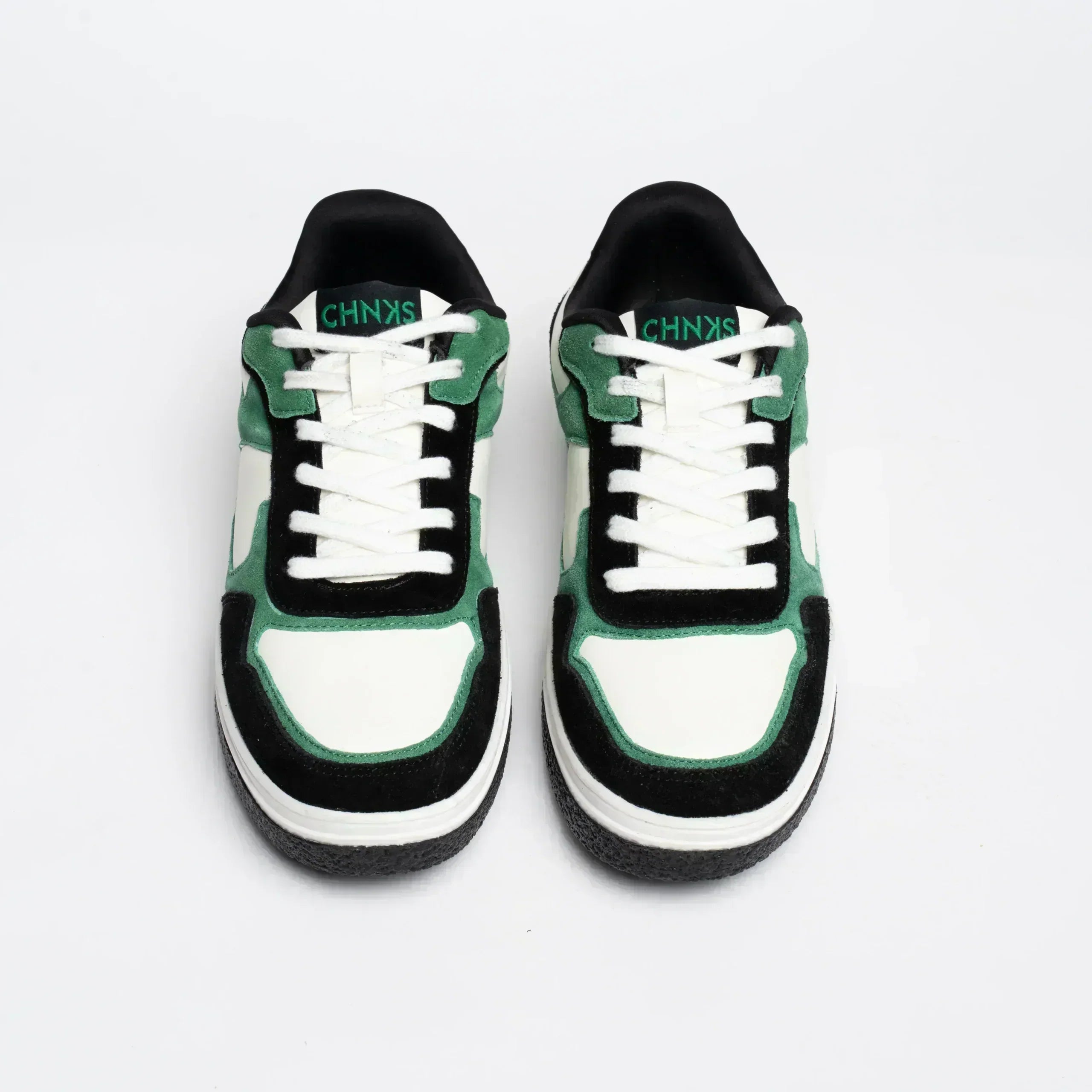 THE MATRIX CHNKS -Green Sneakers for Men – your passport to a carefree style! Dive into a world of comfort and flair with its white PU upper, adorned with fern green and jet black suede leather. The dual-toned TPR outsole ensures a solid step, while the soft microfiber lining and PU moulded insoles cradle your feet. Fasten them up with flat cotton laces for a perfect fit. With The Matrix CHNKS green sneakers for men you are ready for a carefree stride! Alternative lacing in black colour available.