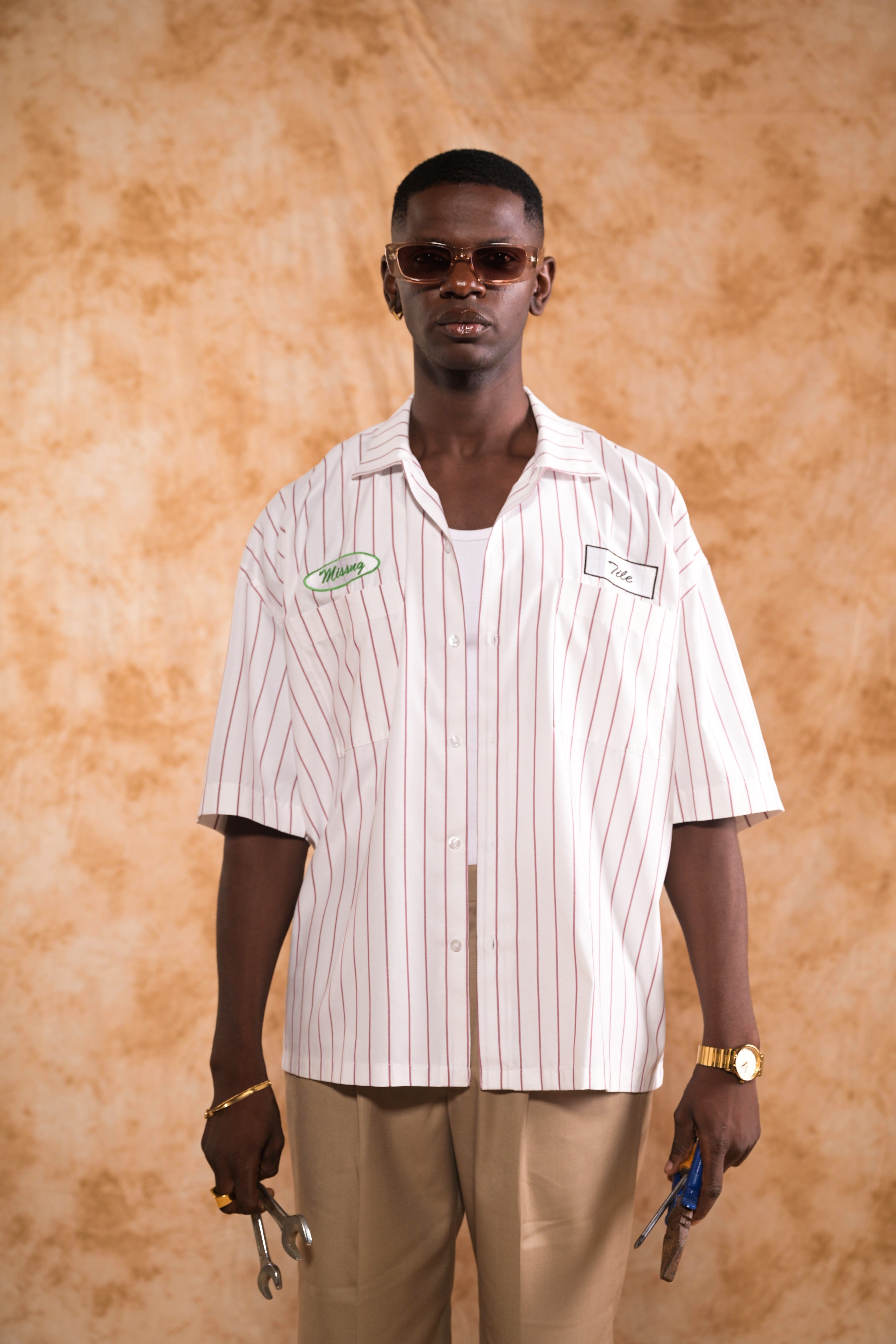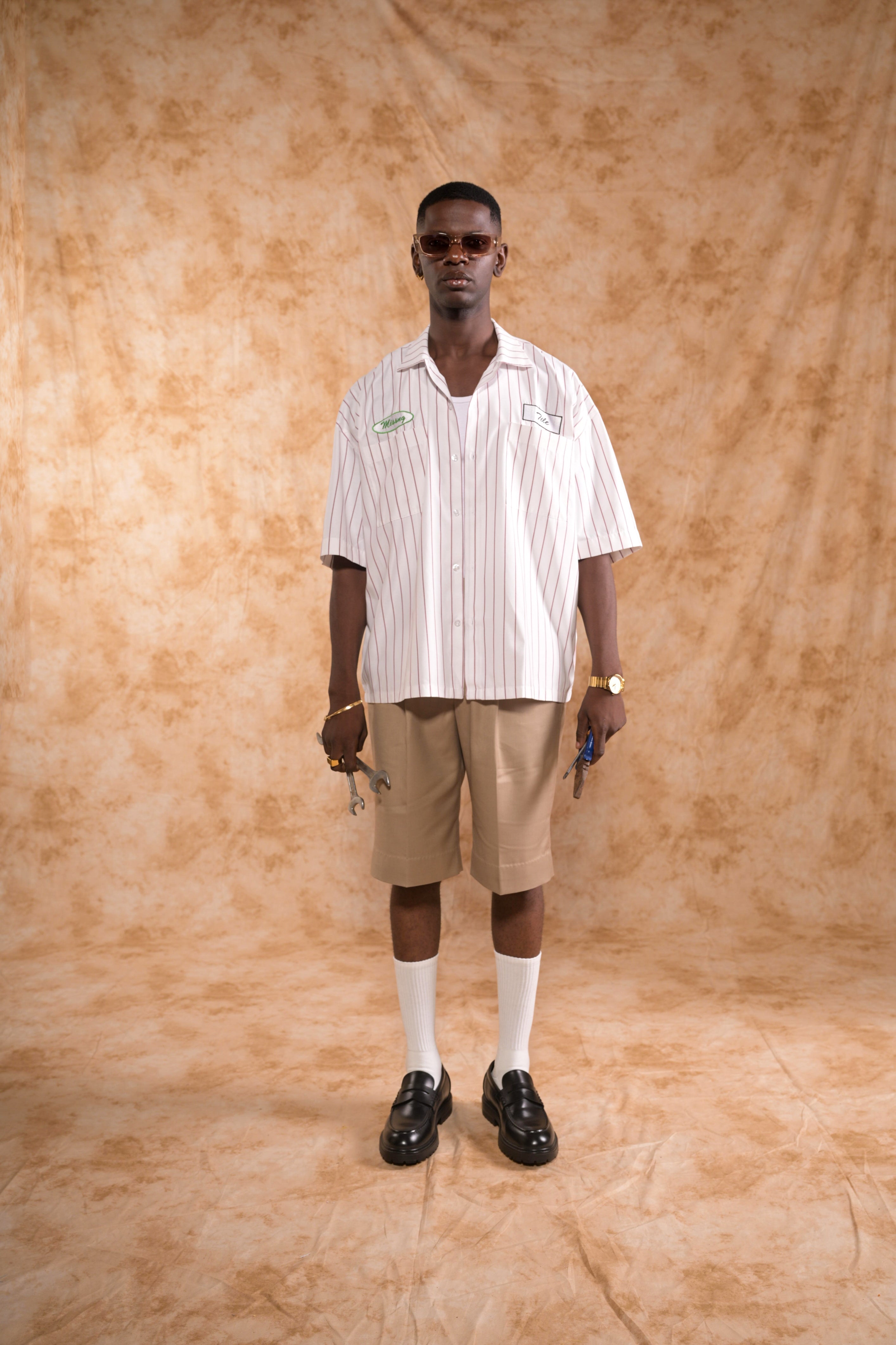 THE MECHANIC, A NOD TO CLASSIC NY BASEBALL UNIFORMS FUSED WITH THE RAW, NO-NONSENSE AESTHETIC OF A MECHANIC’S WORKWEAR. THIS CRISP WHITE SHIRT FEATURES SHARP NY PINSTRIPES, OFFERING A CLEAN CANVAS FOR THE BOLD EMBROIDERED BADGES. A SLEEK PARAKEET GREEN BRANDING CONTRASTS BEAUTIFULLY AGAINST THE MONOCHROME TILE BADGE, MAKING IT A STANDOUT DETAIL THAT’S IMPOSSIBLE TO MISS. THE MACHINE-EMBROIDERED CHEST BADGES BRING THE MECHANIC'S UNIFORM AESTHETIC TO LIFE, BLENDING WORKWEAR RUGGEDNESS WITH STREETSTYLE.
