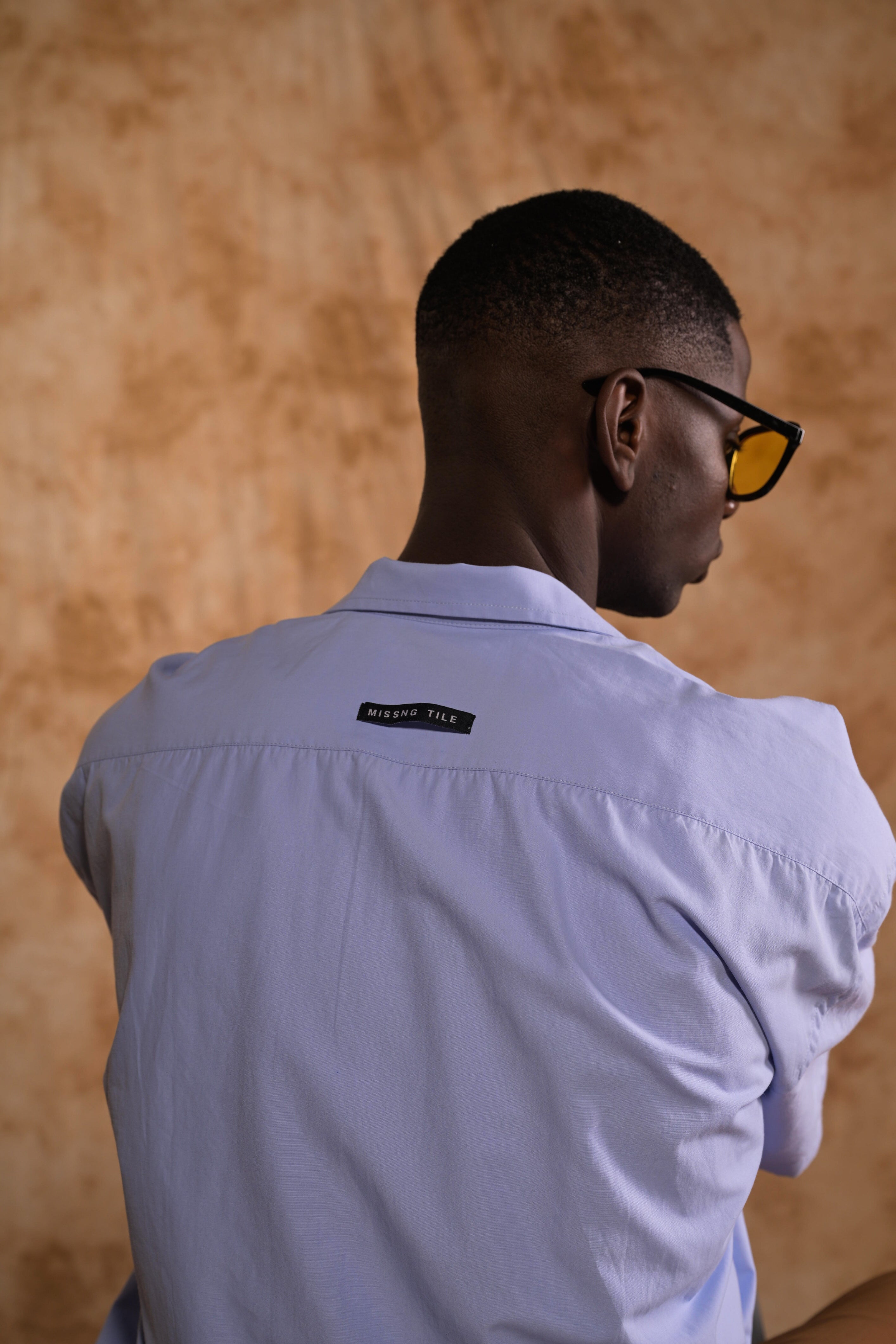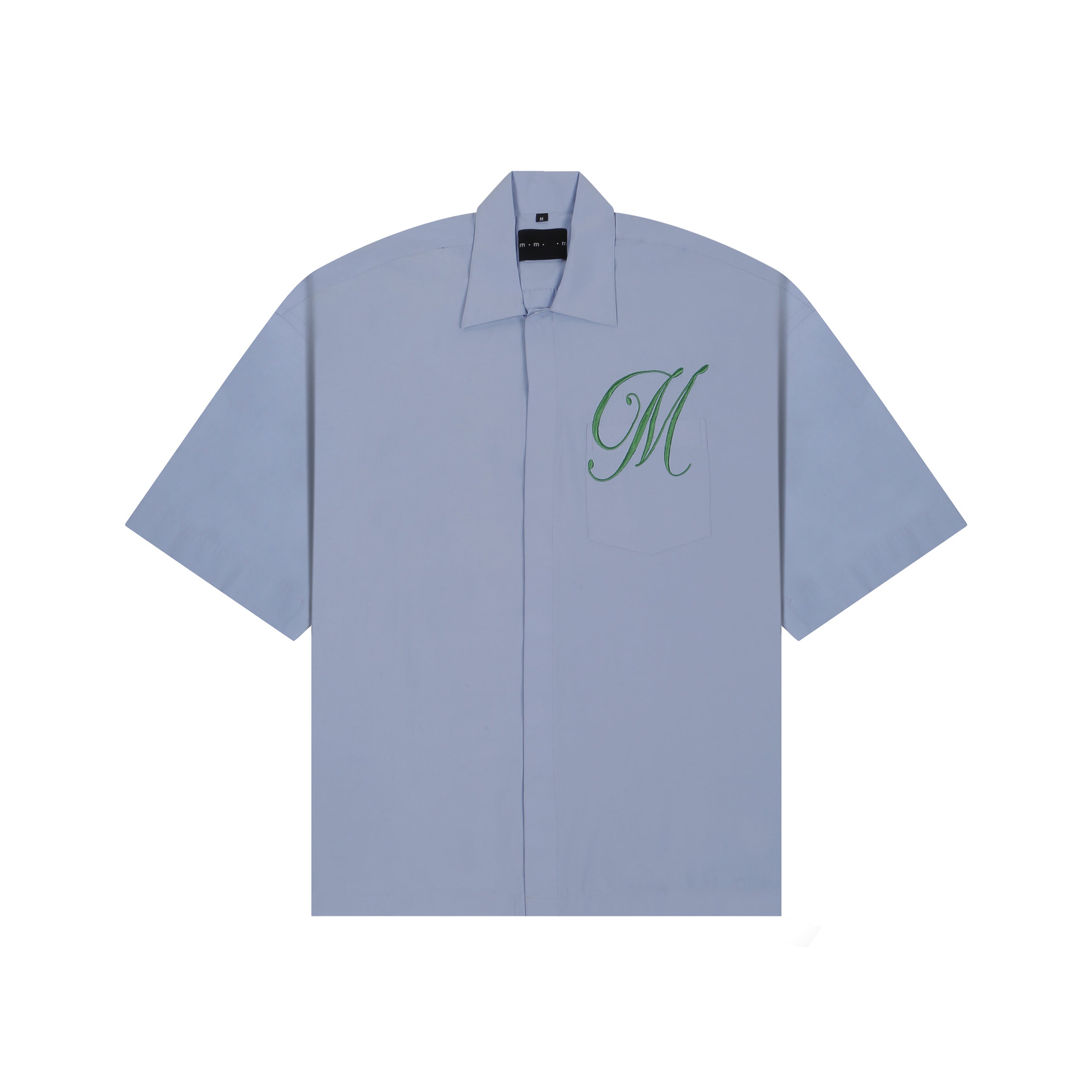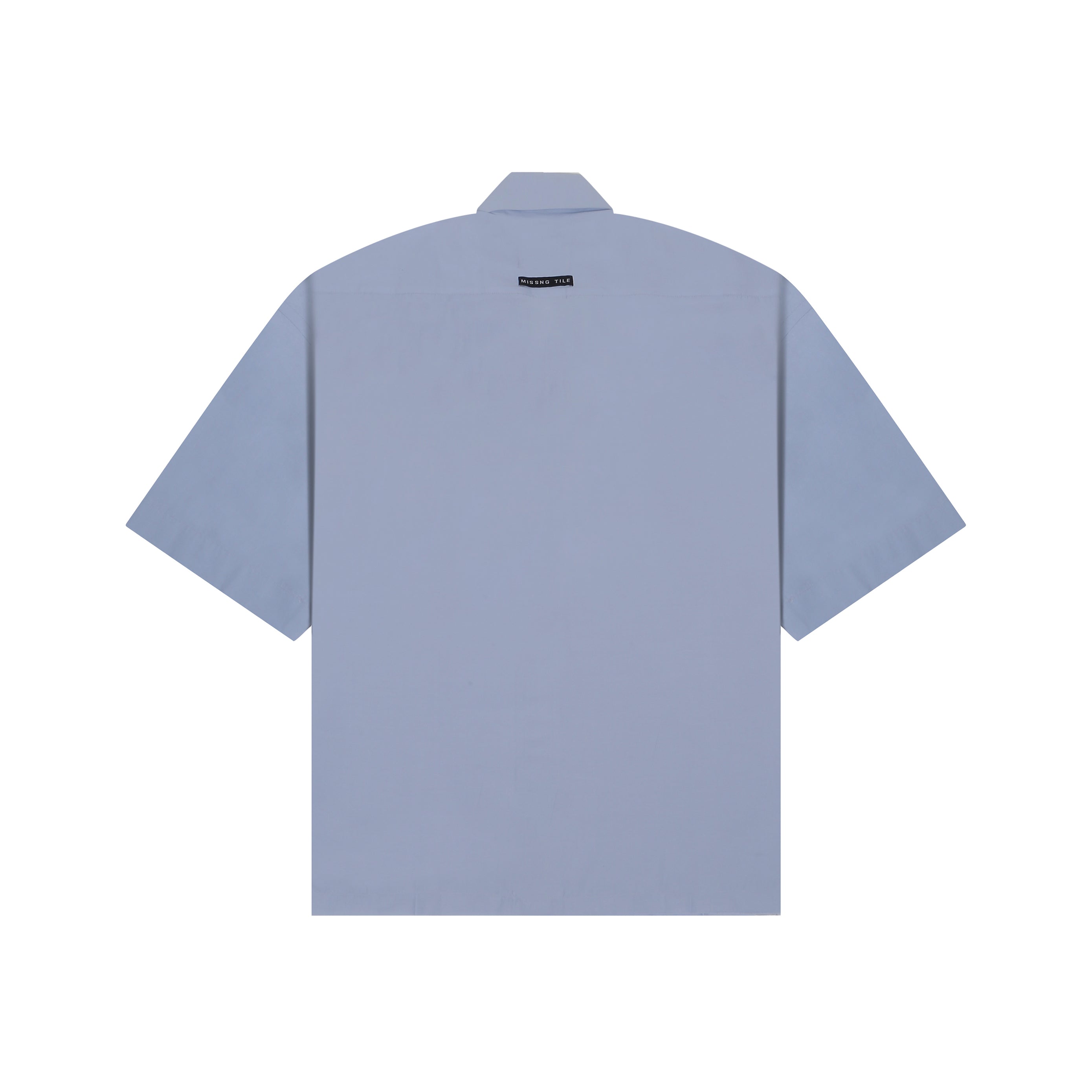 INSPIRED BY THE HUMBLE SCHOOL PEON—THE BACKBONE OF EVERY INSTITUTION WHO WORKS TIRELESSLY BEHIND THE SCENES—THIS OVERSIZED, HALF-SLEEVE BOXY SHIRT IN FADED CORNFLOWER BLUE HONORS THEIR EVERYDAY GRIT. THE SIGNATURE 'M' LOGO IN PARAKEET GREEN STANDS OUT AGAINST THE POCKET. FRAYED EDGES AT THE BOTTOM SPEAK TO THE WEAR AND TEAR OF A WELL-WORN UNIFORM, REFLECTING HARD WORK AND PERSEVERANCE. A "MISSNG TILE" LABEL IS ATTACHED ON THE BACK FOR A DISTINCTIVE TOUCH. CONCEALED BUTTONS KEEP IT MINIMAL, LETTING THE DETAILS TAKE THE SPOTLIGHT.