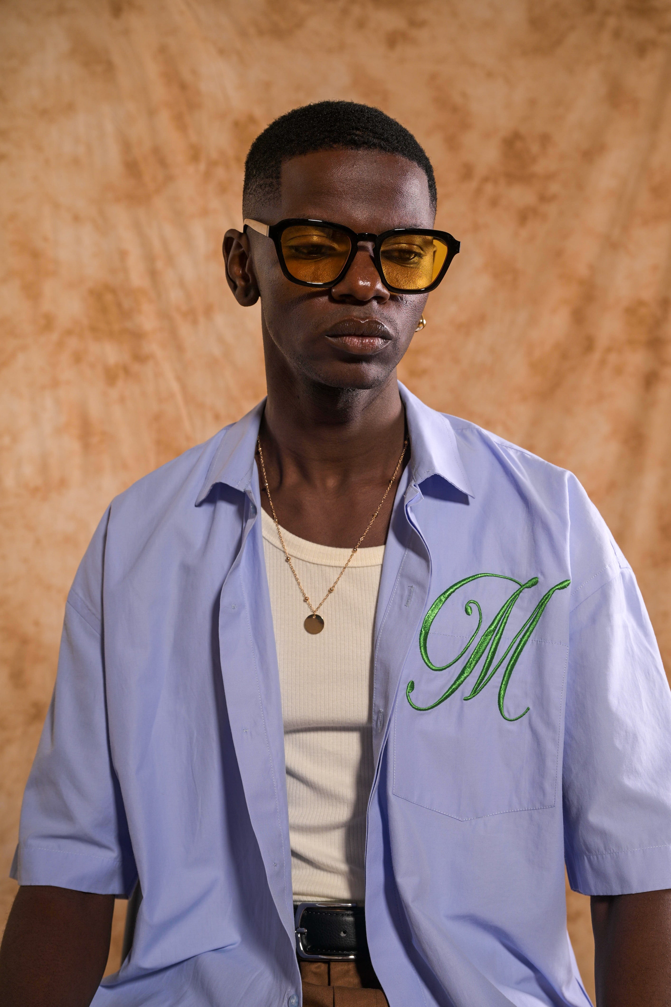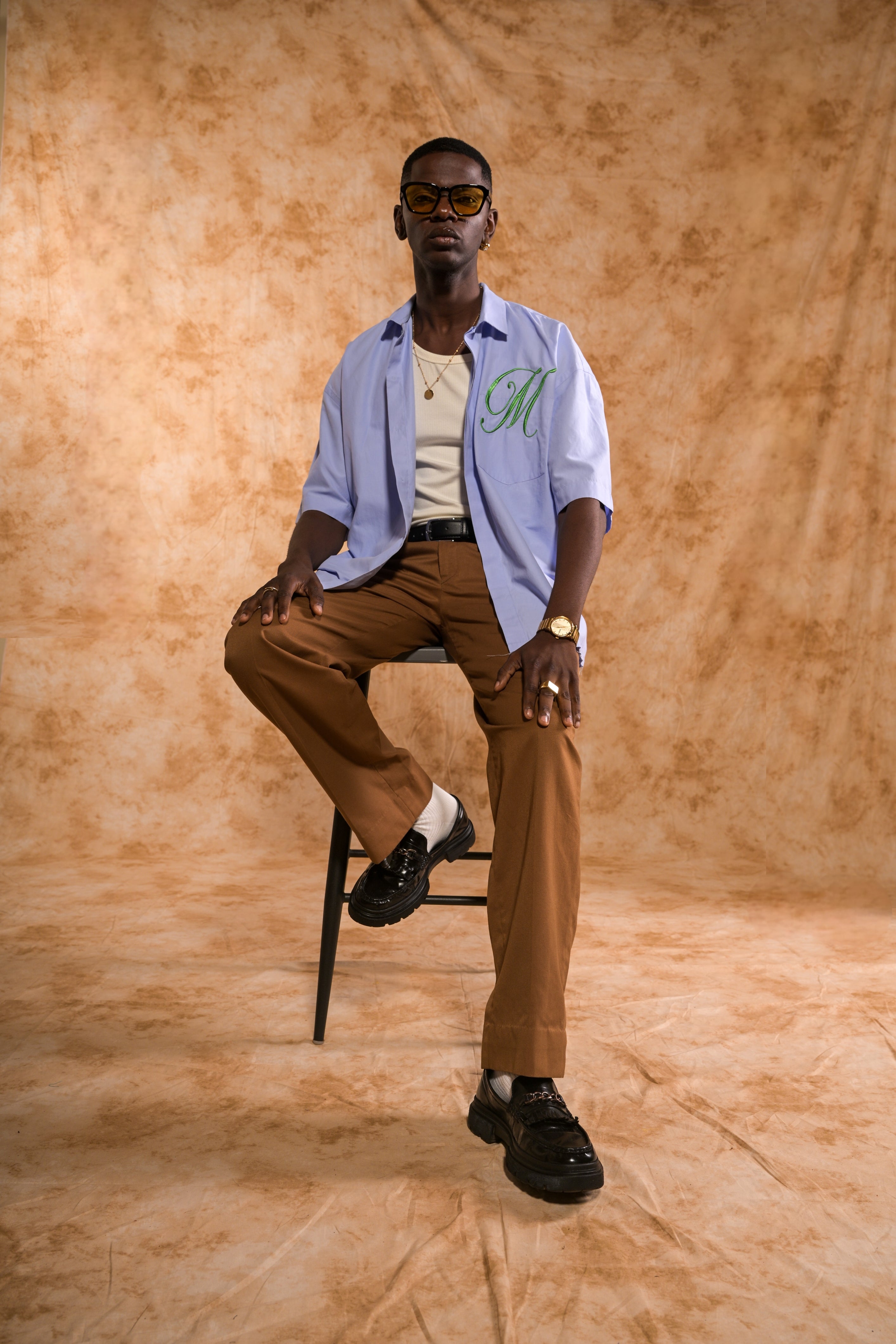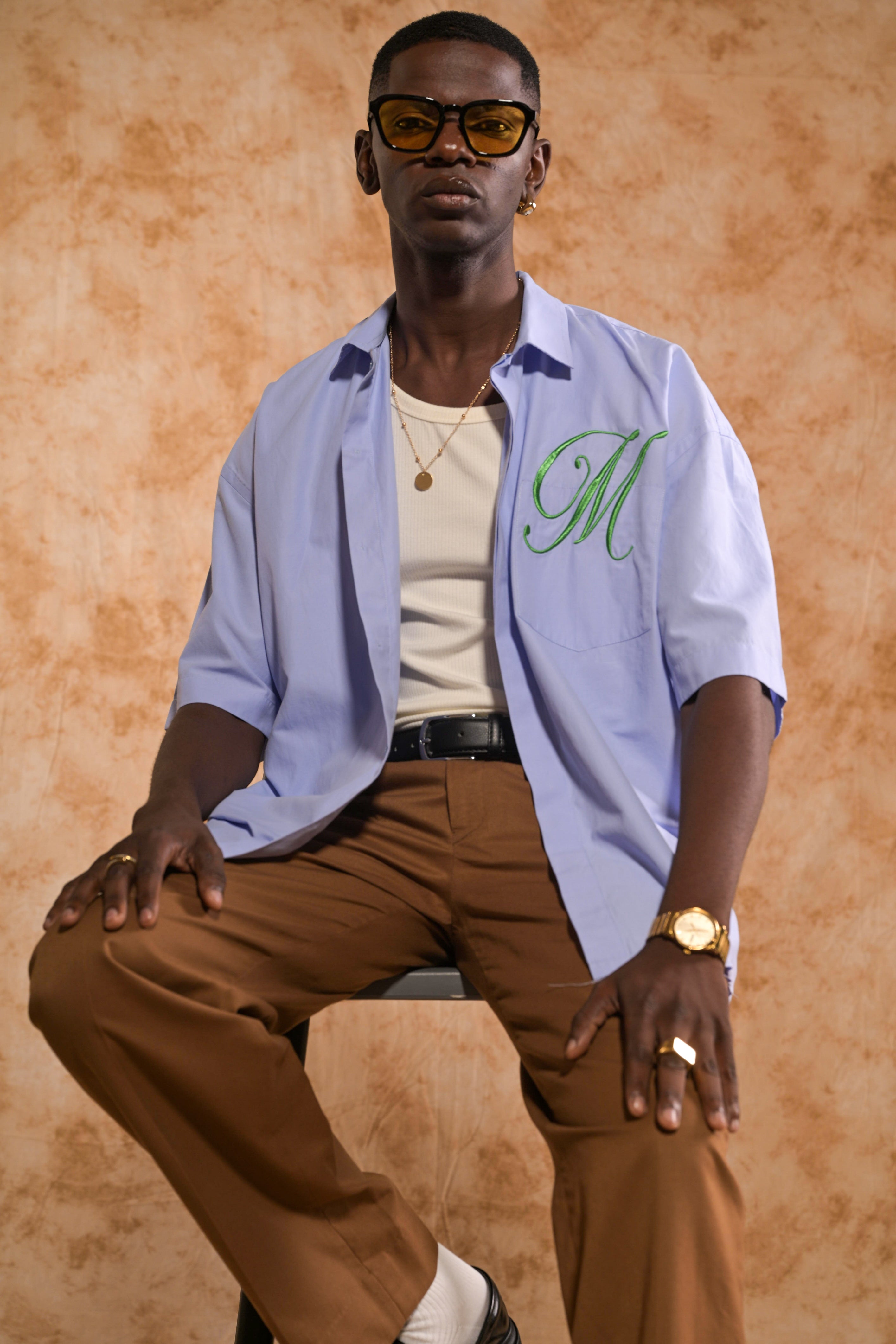 INSPIRED BY THE HUMBLE SCHOOL PEON—THE BACKBONE OF EVERY INSTITUTION WHO WORKS TIRELESSLY BEHIND THE SCENES—THIS OVERSIZED, HALF-SLEEVE BOXY SHIRT IN FADED CORNFLOWER BLUE HONORS THEIR EVERYDAY GRIT. THE SIGNATURE 'M' LOGO IN PARAKEET GREEN STANDS OUT AGAINST THE POCKET. FRAYED EDGES AT THE BOTTOM SPEAK TO THE WEAR AND TEAR OF A WELL-WORN UNIFORM, REFLECTING HARD WORK AND PERSEVERANCE. A "MISSNG TILE" LABEL IS ATTACHED ON THE BACK FOR A DISTINCTIVE TOUCH. CONCEALED BUTTONS KEEP IT MINIMAL, LETTING THE DETAILS TAKE THE SPOTLIGHT.
