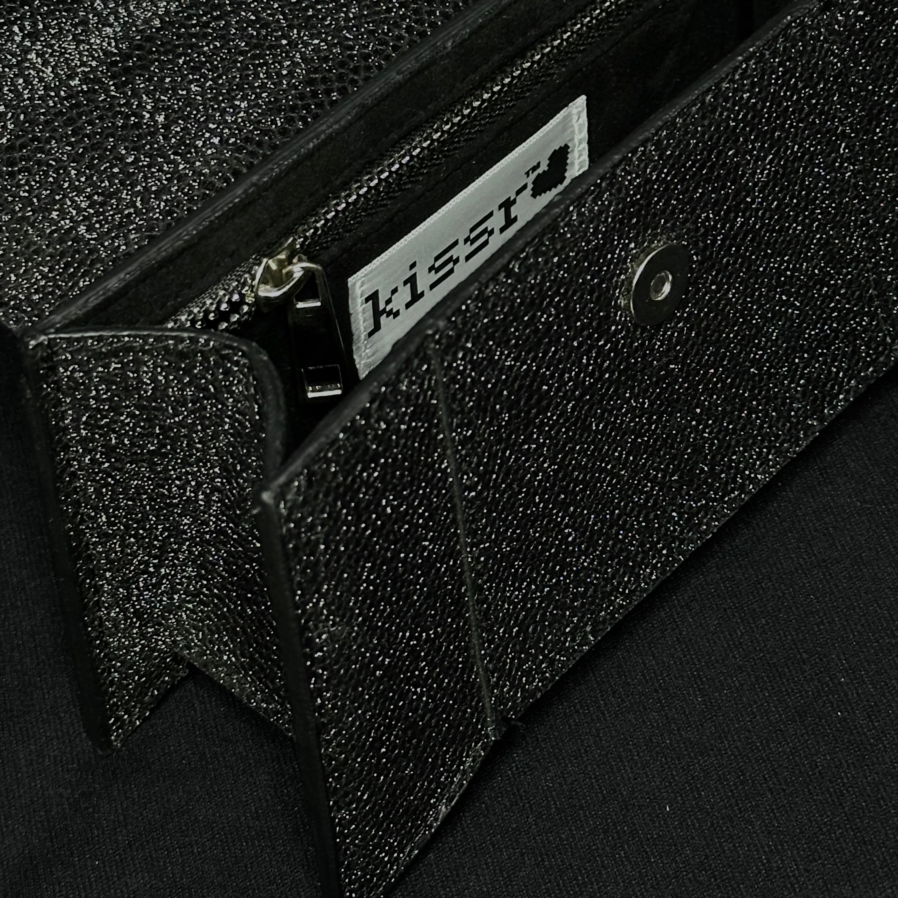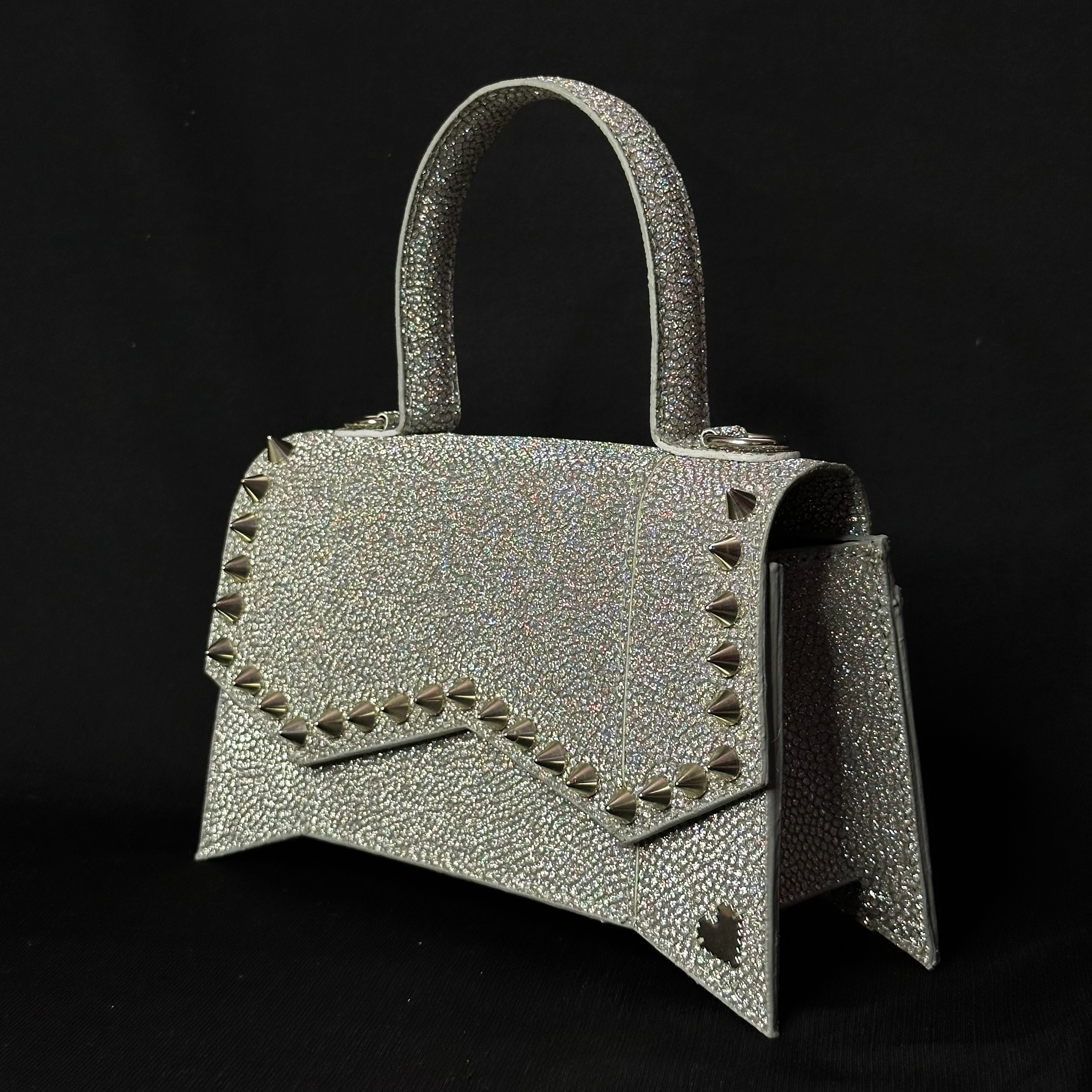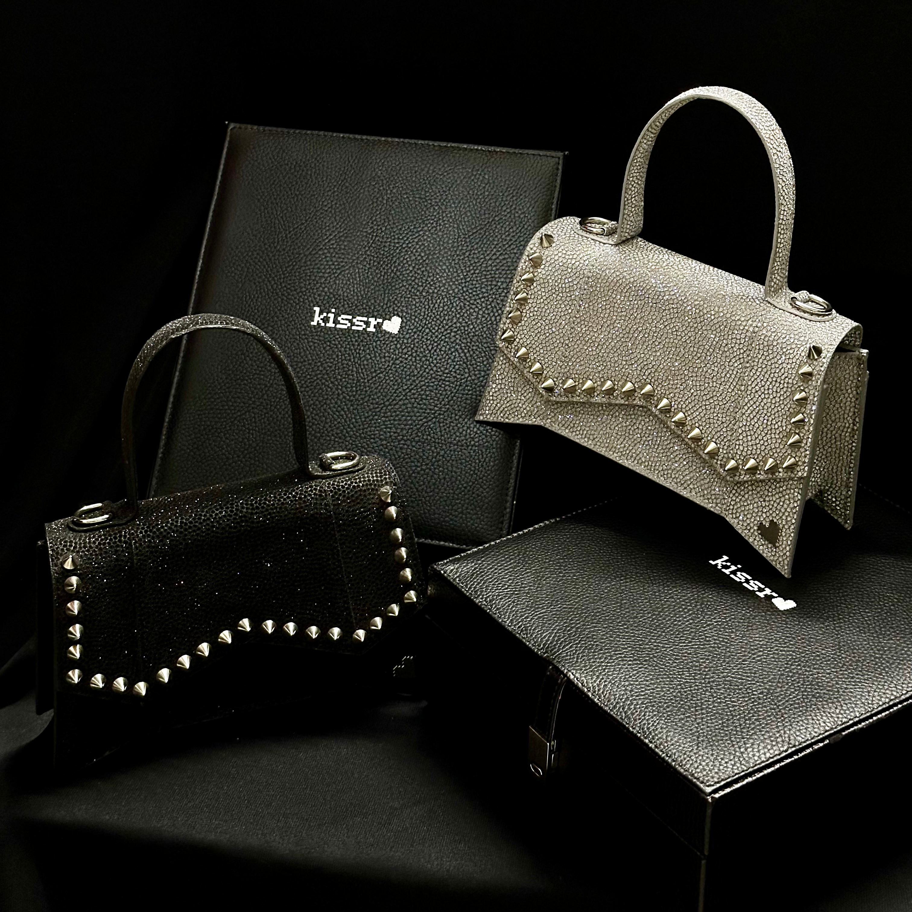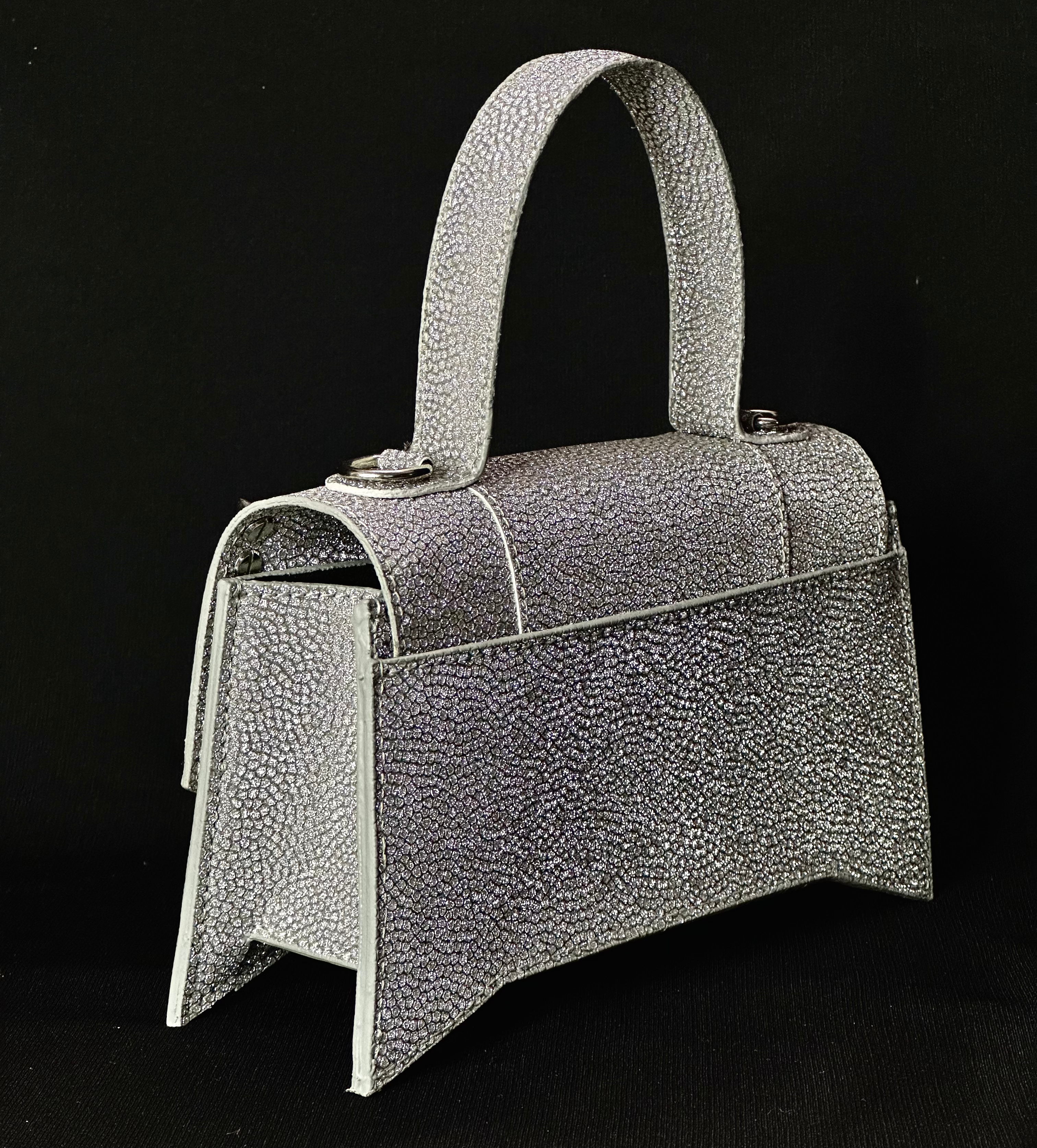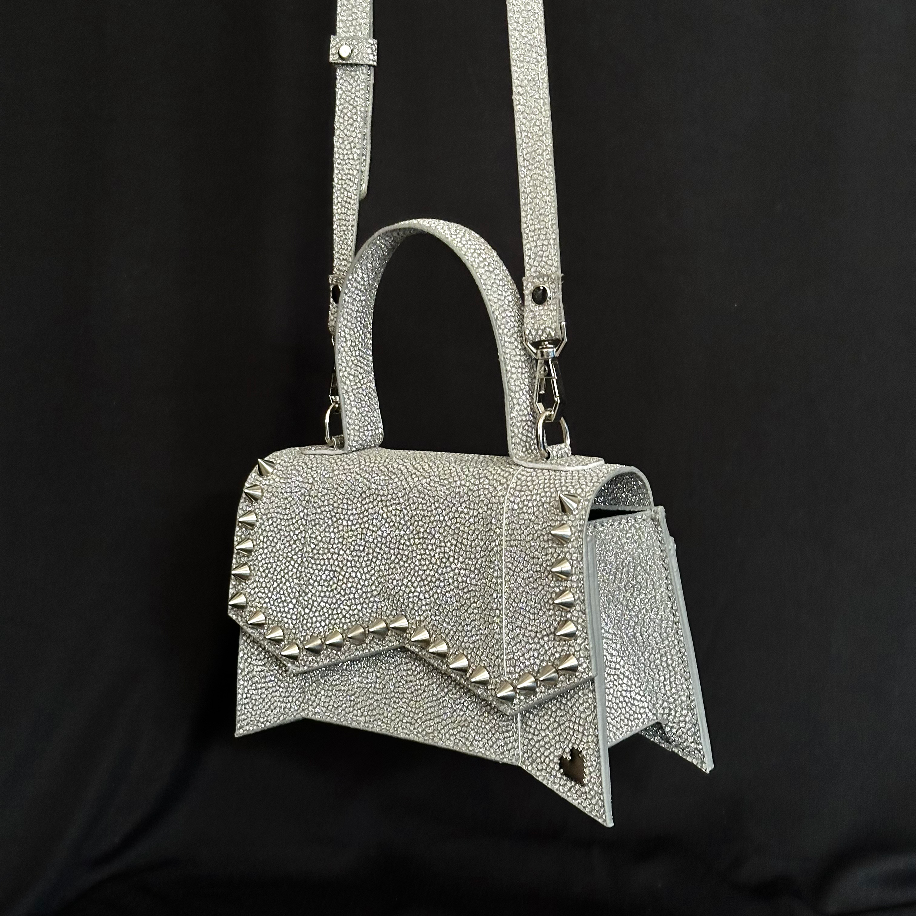 Kissr presents The Scarlett, the mini handbag that's anything but demure. This statement piece is perfect for the woman who isn't afraid to shine, its glittery black or silver exterior catching the light with every step.