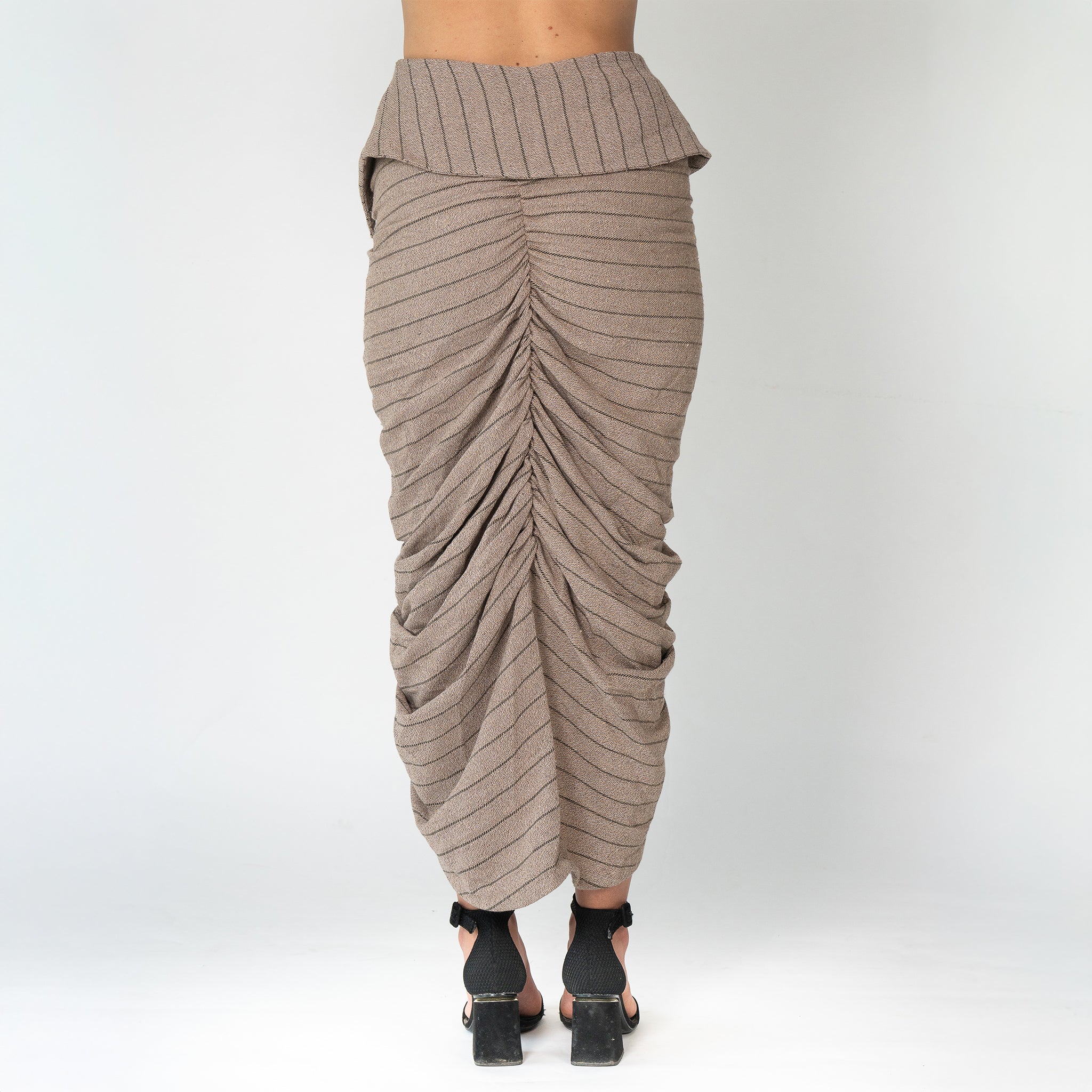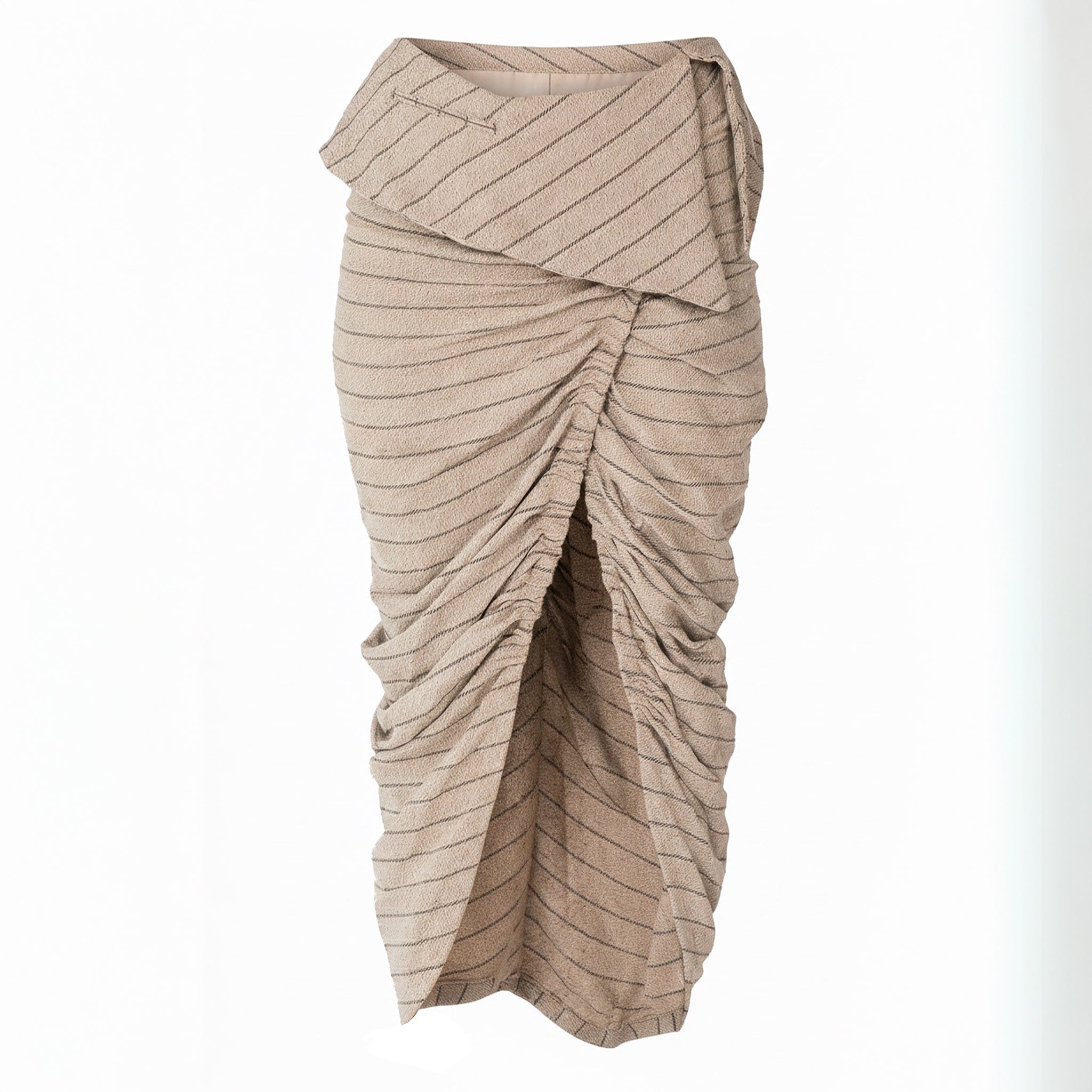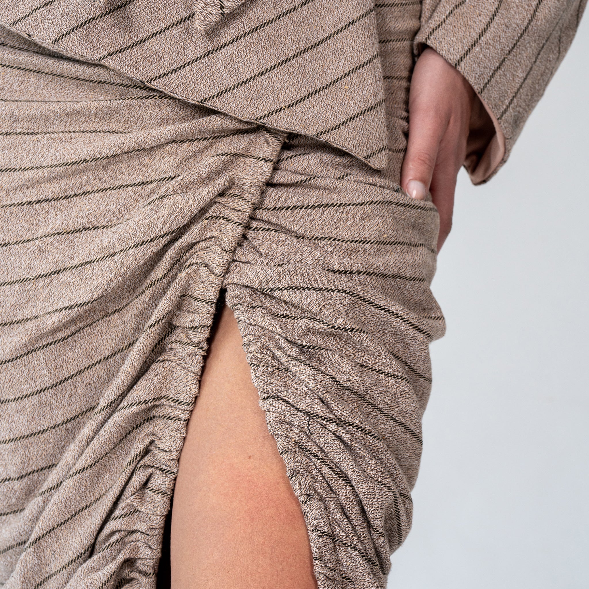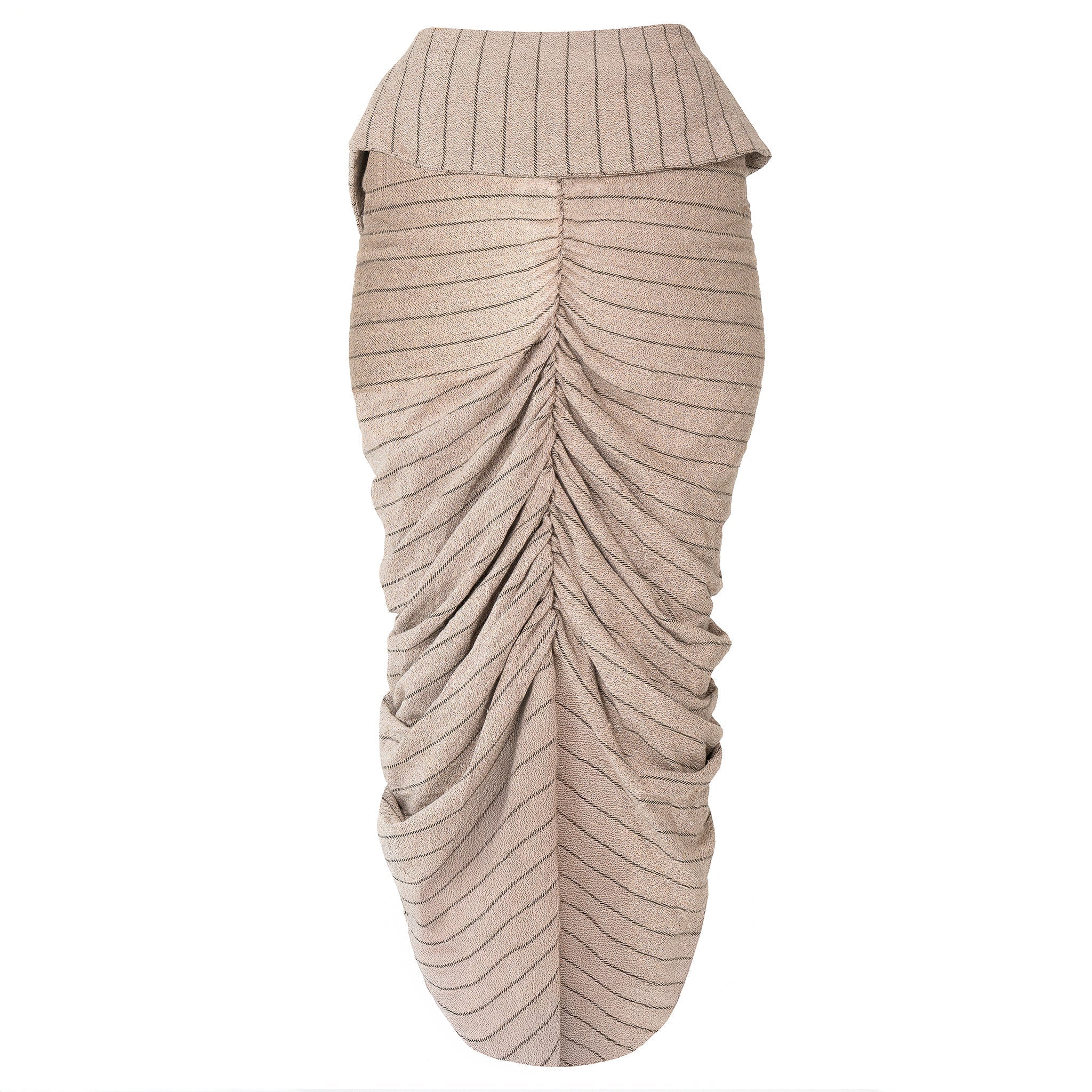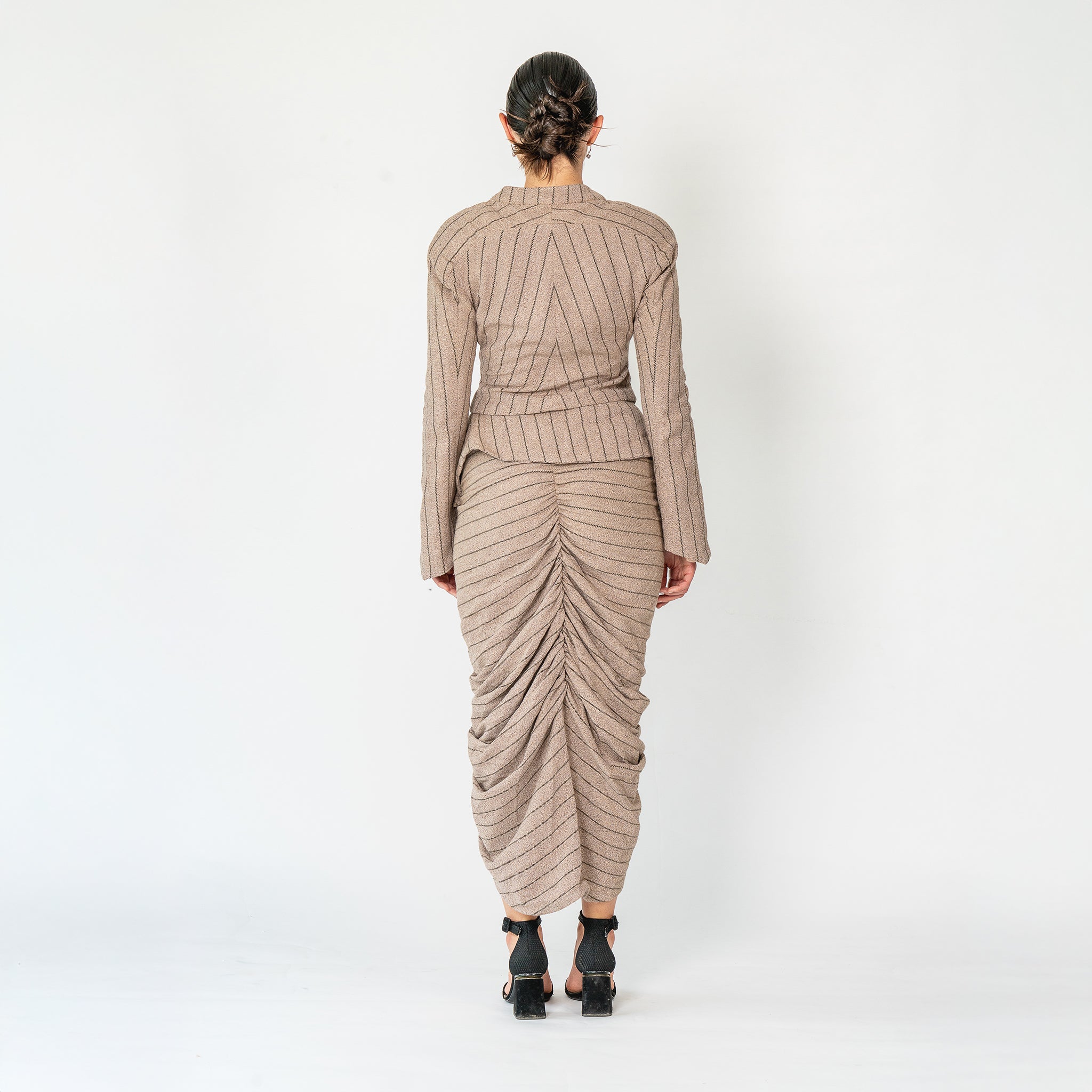 Tailored in soft brushed cotton, this coat features a corset-inspired finish that sculpts the waist and defines the silhouette. Flared sleeves add movement, while structured shoulder pads introduce a bold, power-dressing edge. Paired with a matching skirt cut to