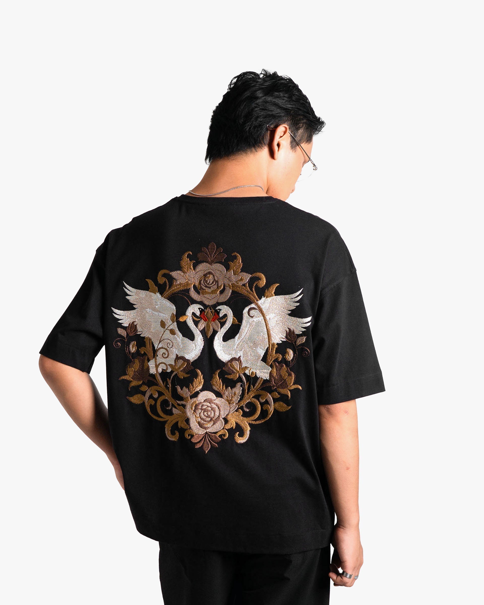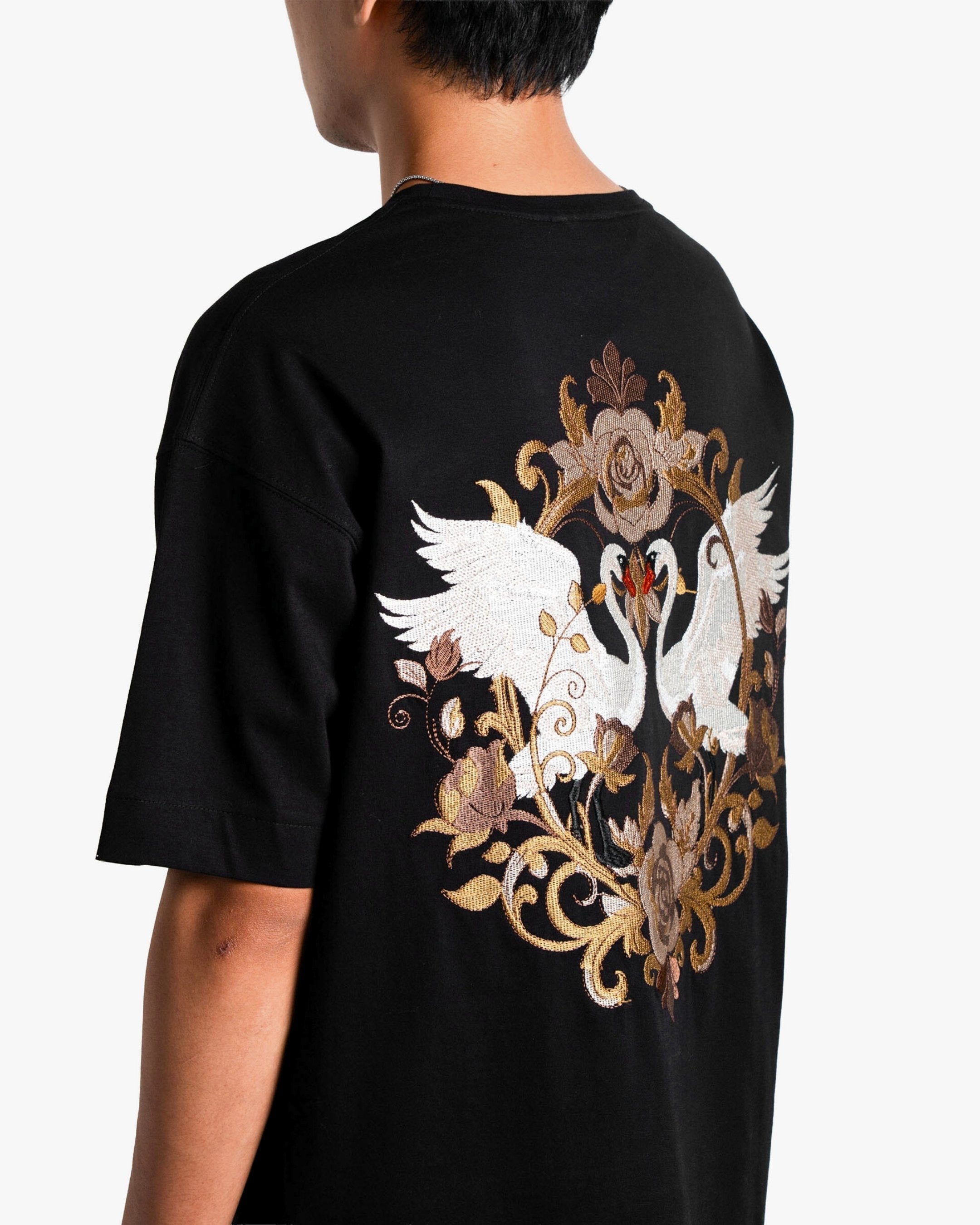 The Swan Opera — a premium oversized unisex t-shirt in Black, adorned with an intricate full-back and front embroidery that commands attention.