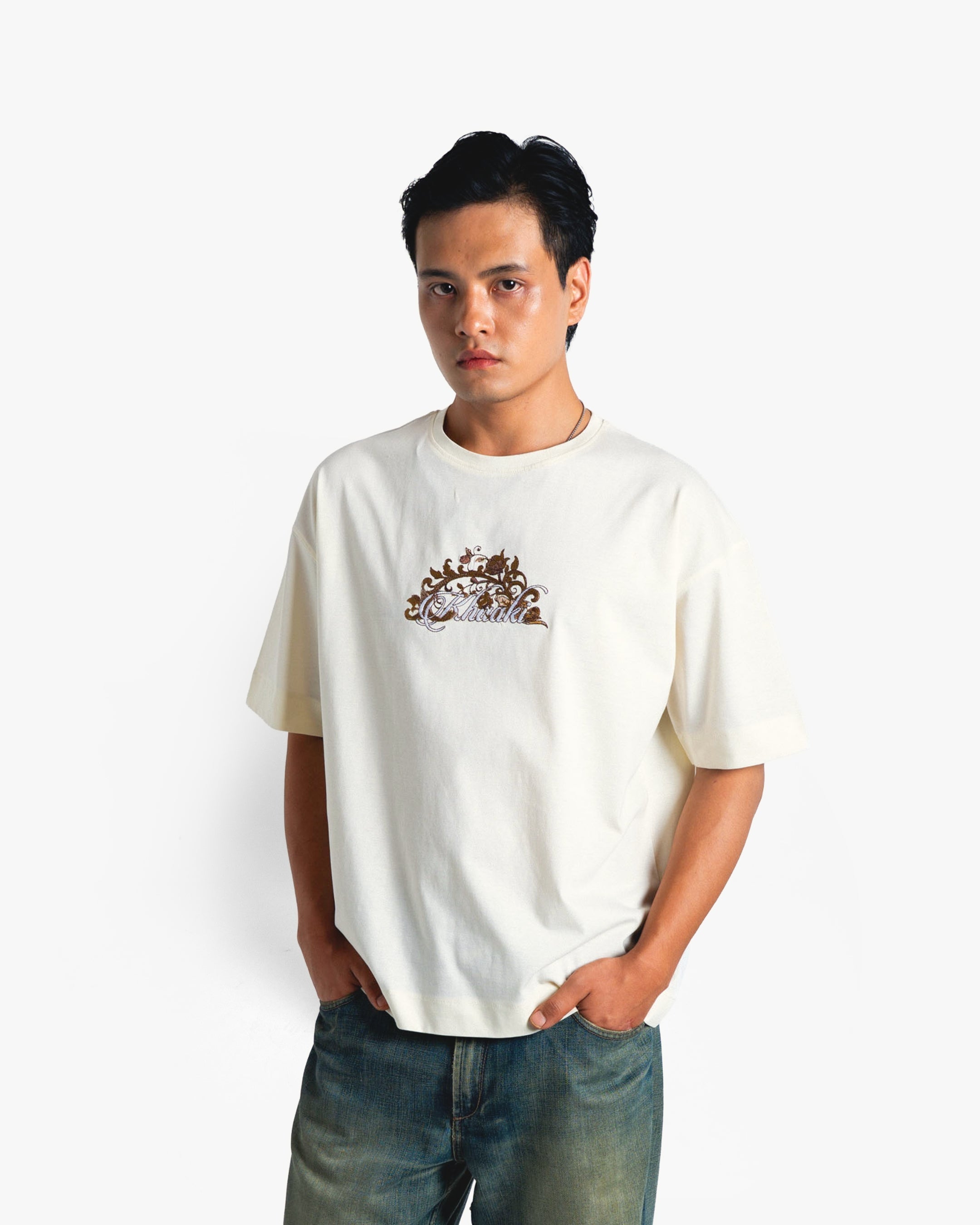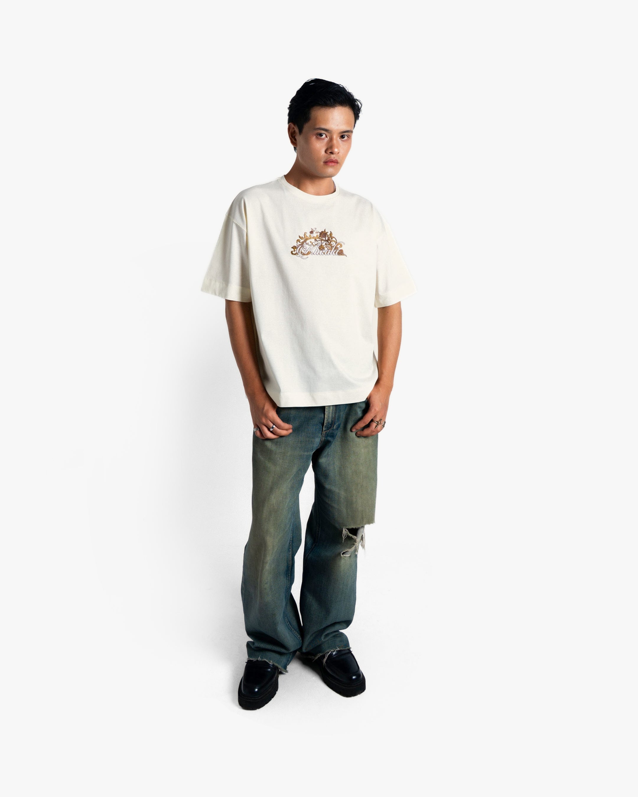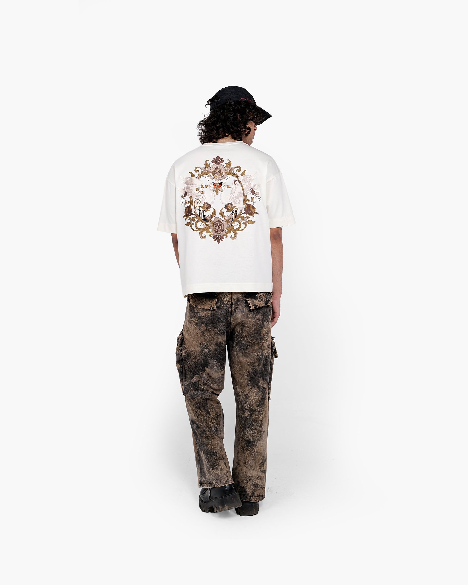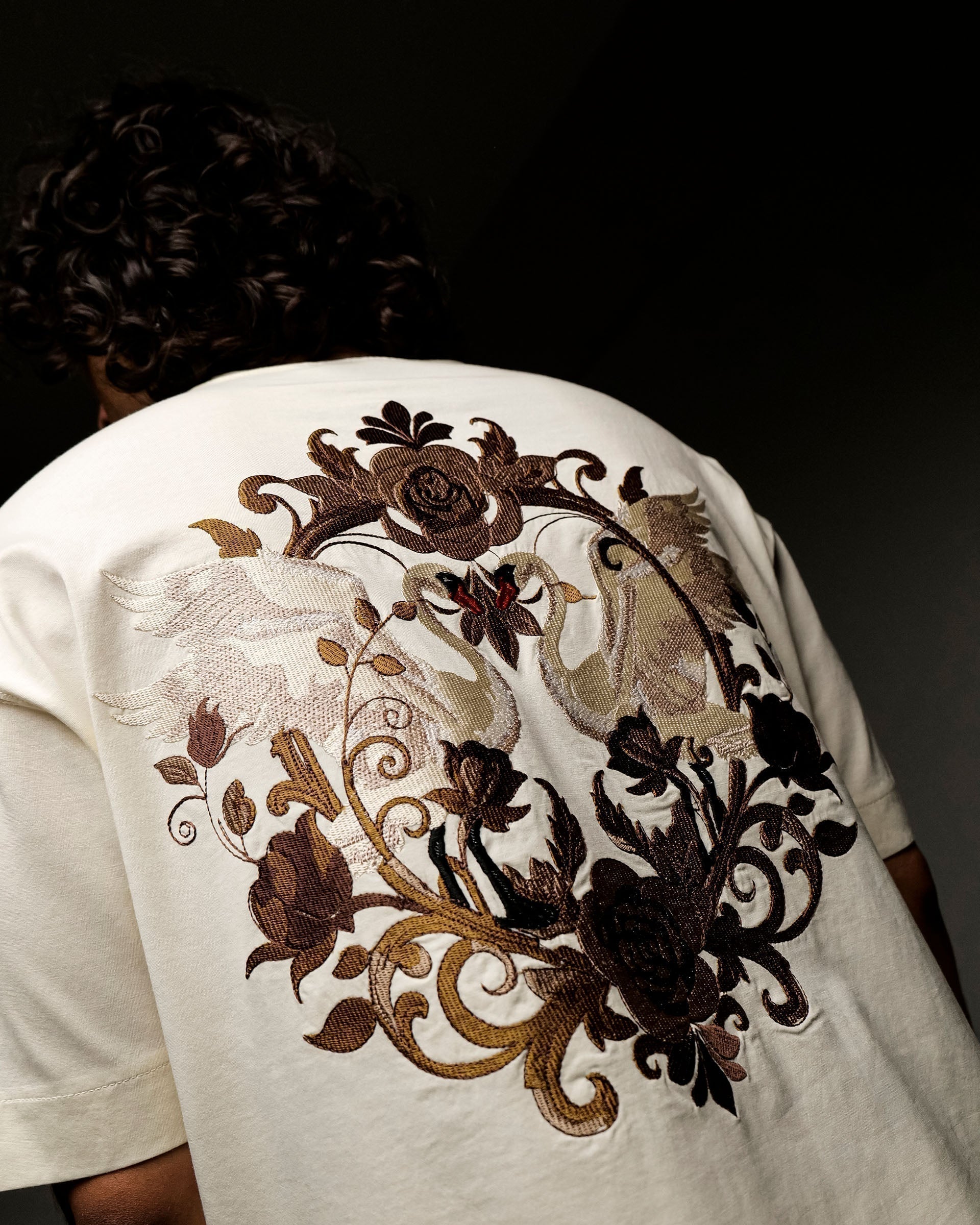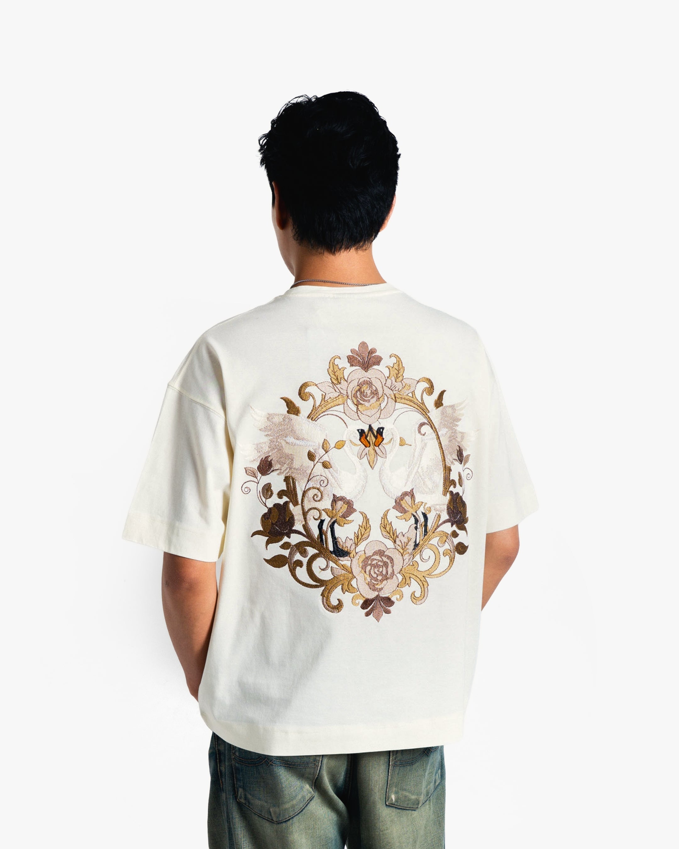 Crafted from heavyweight 100% mercerized cotton and finished with a luxurious double silicone wash, this piece showcases nearly 3 lakh embroidery stitches in earthy tones, weaving a regal scene of swans, roses, and vintage baroque flourishes. The detailed embroidery on the chest adds a refined contrast, perfectly tying in with the majestic full-back artwork.