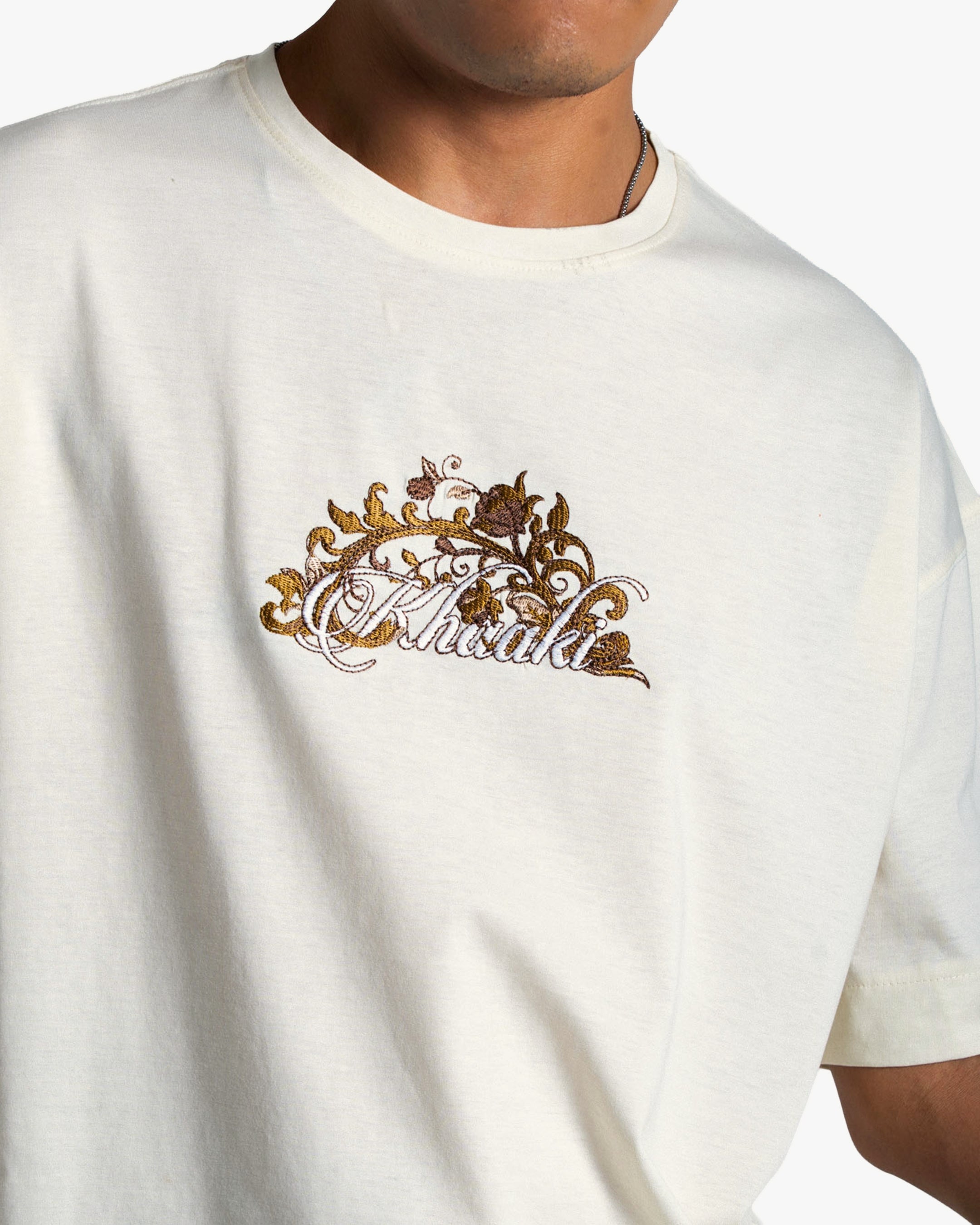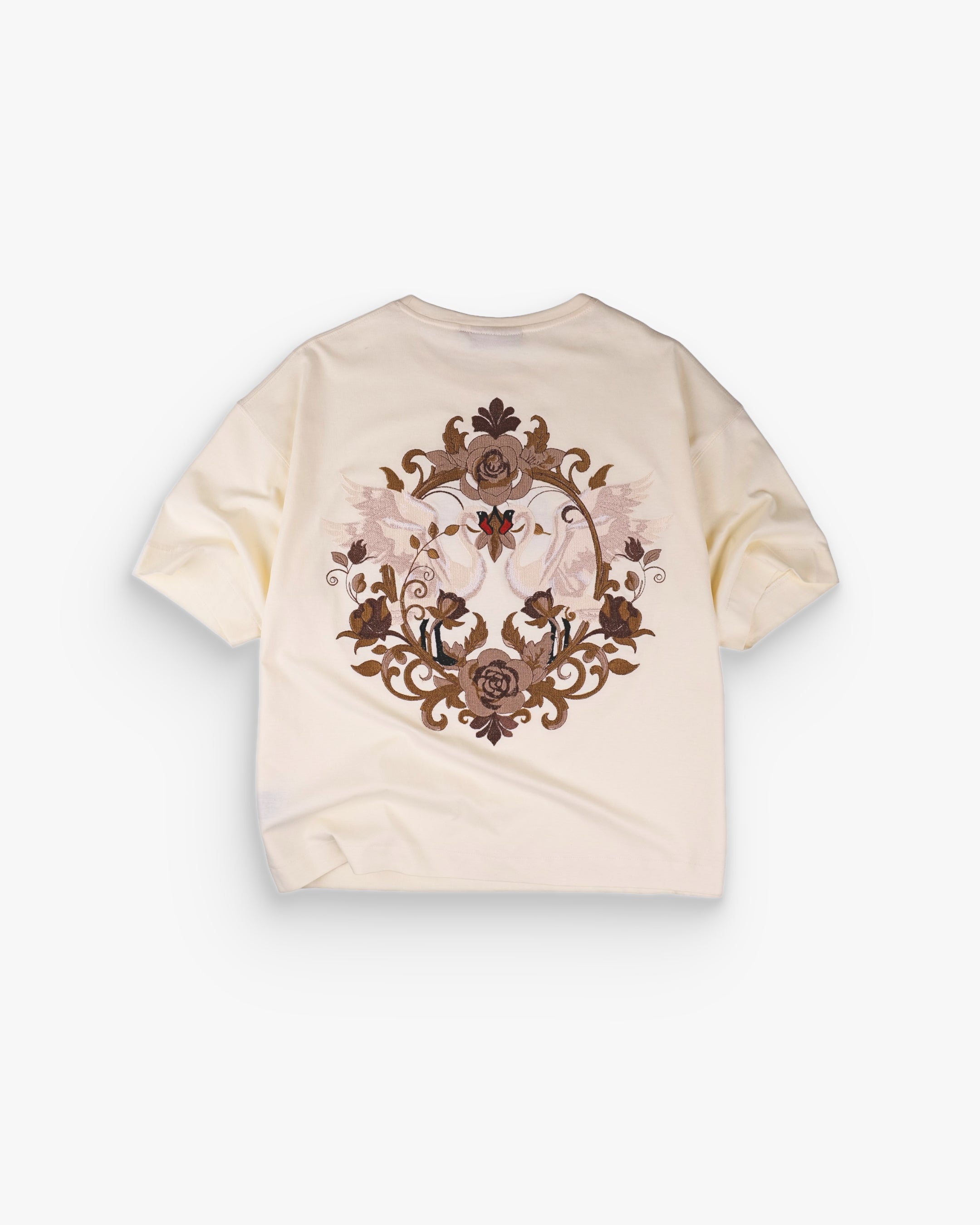 The Swan Opera — a premium oversized unisex t-shirt in Off White, adorned with an intricate full-back and front embroidery that commands attention.