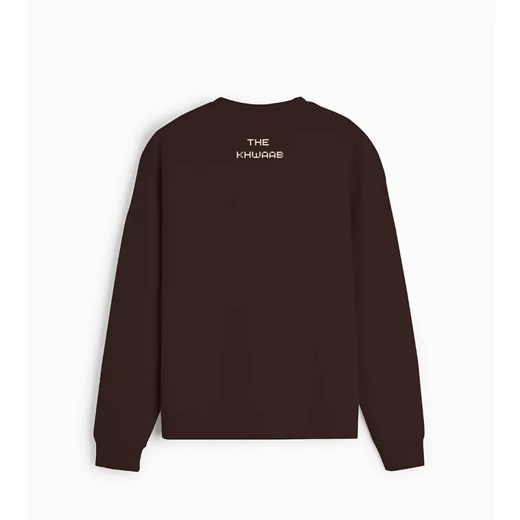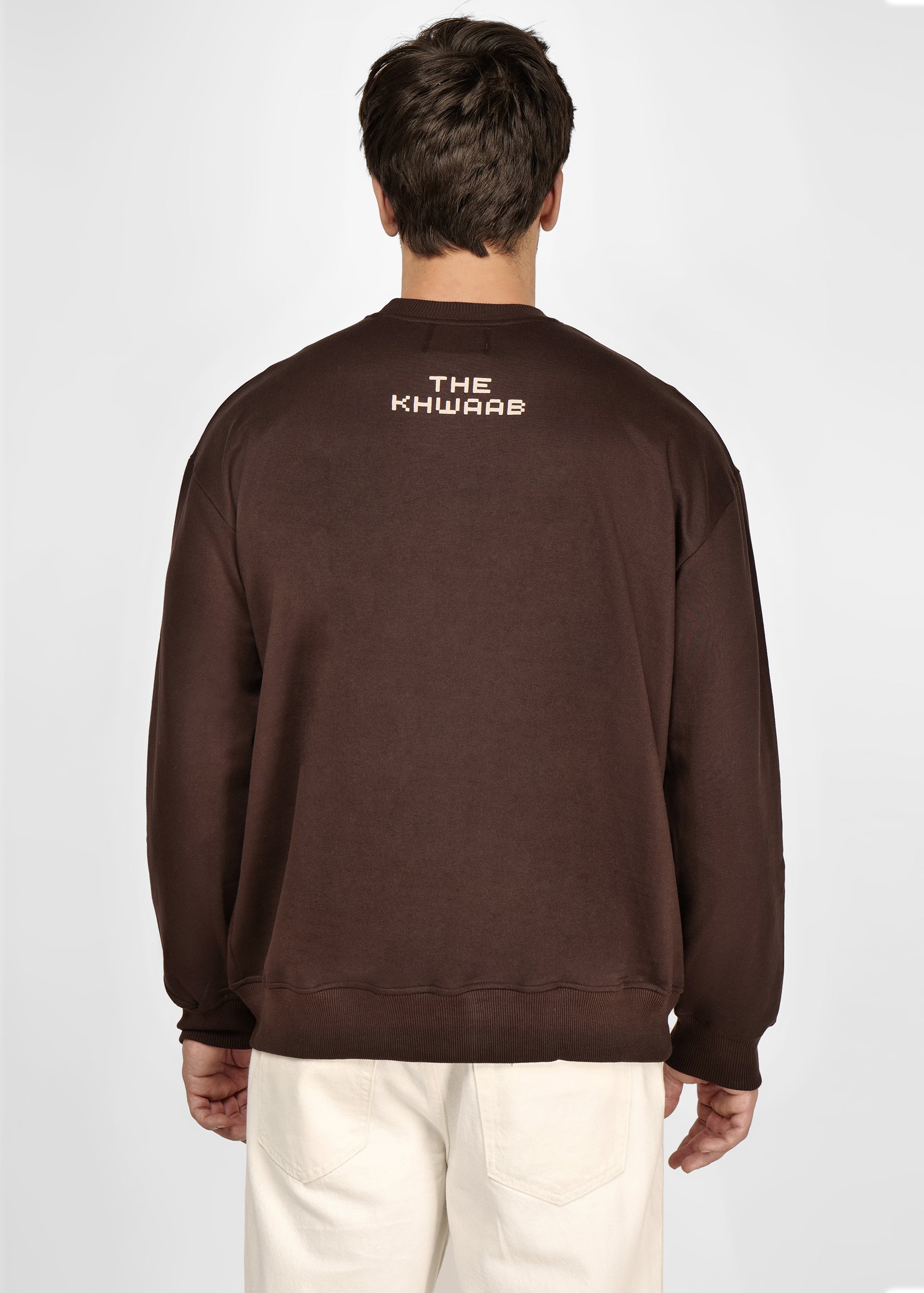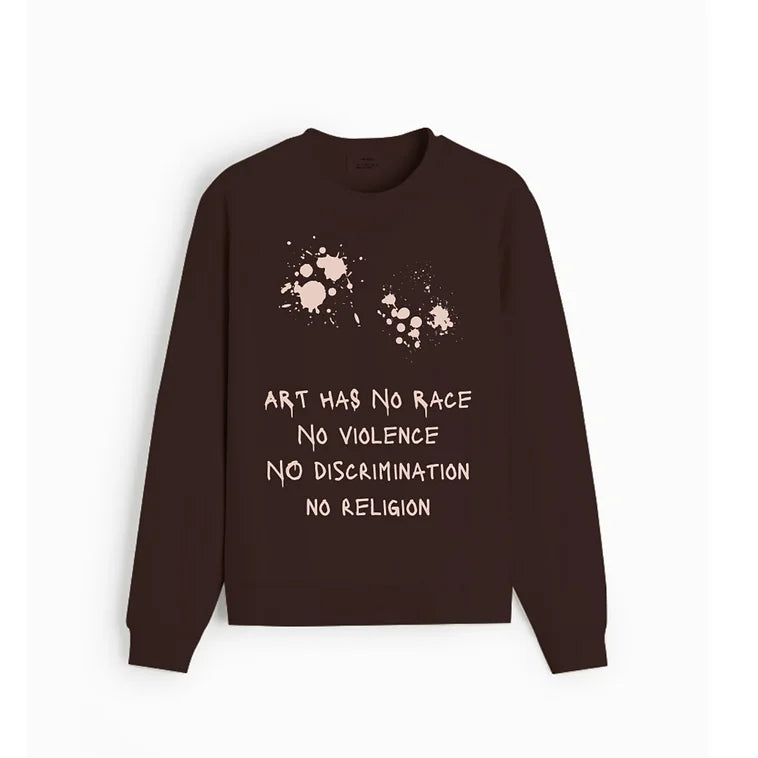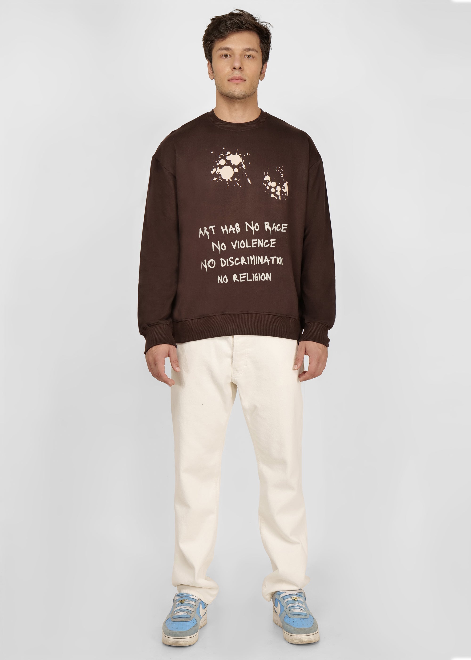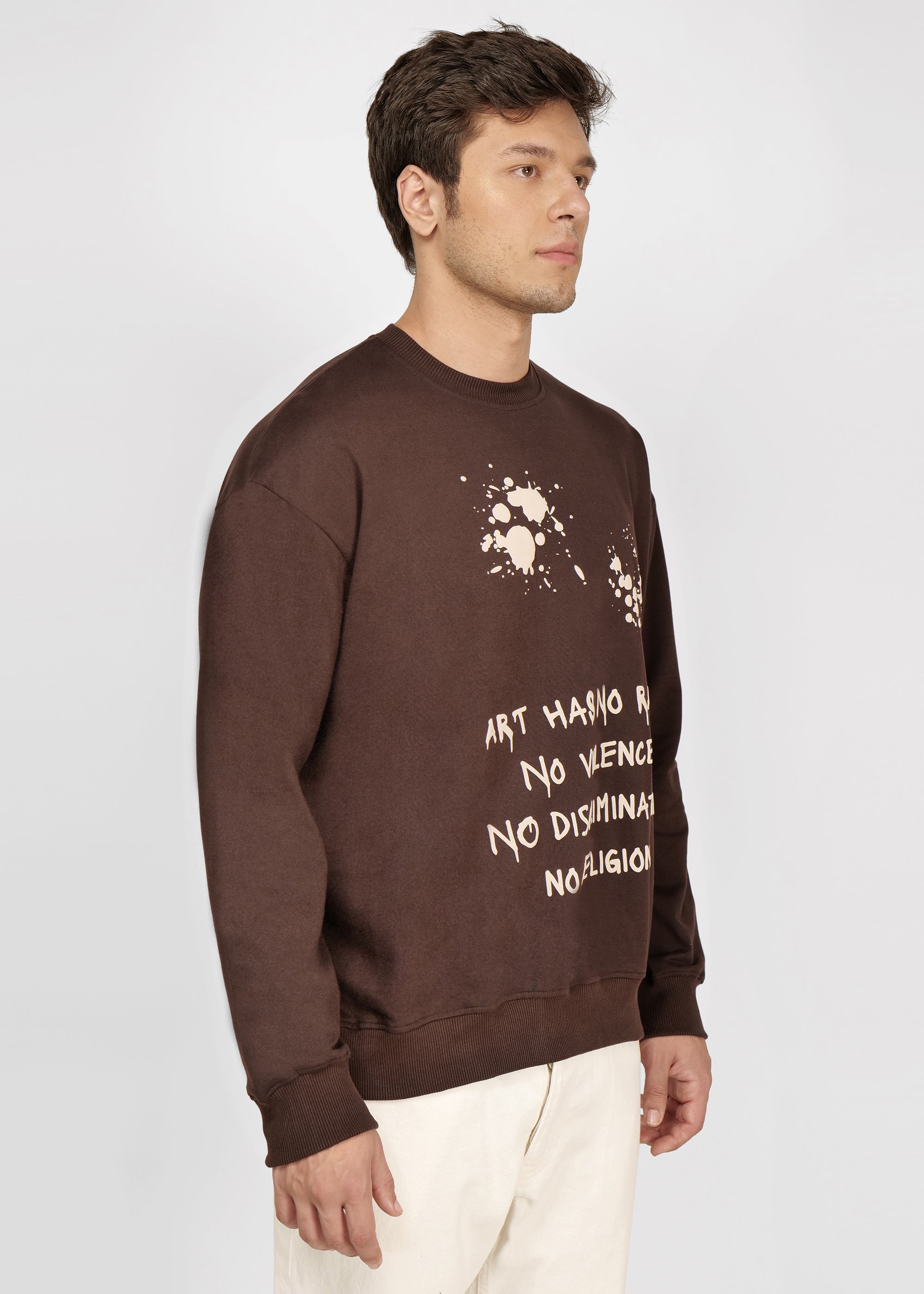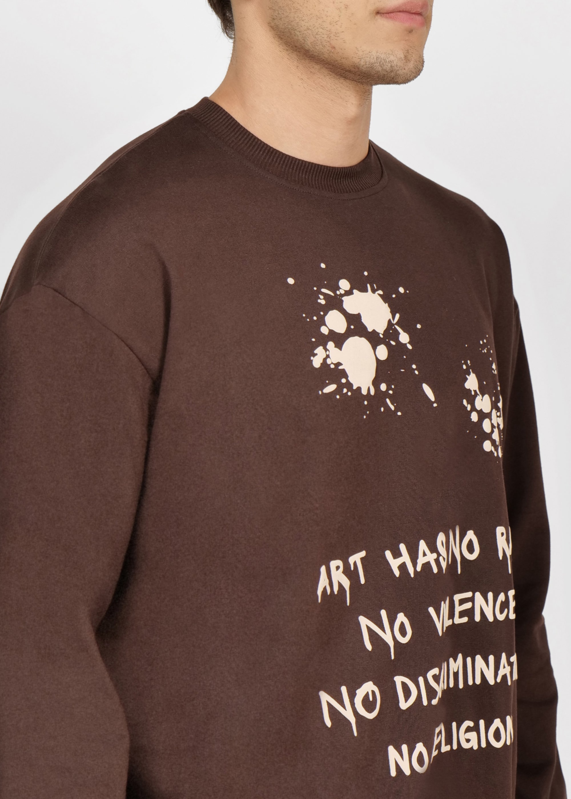 Crewneck sweatshirt in brown cotton fleece with dripping paint and text.