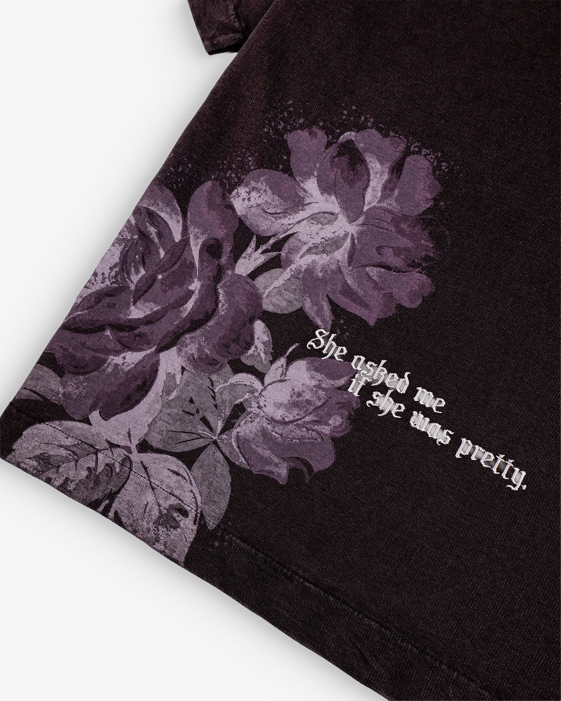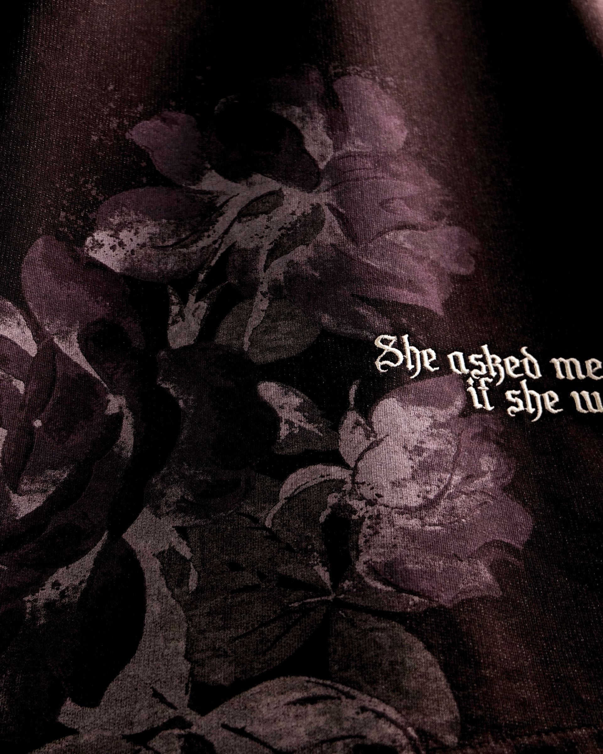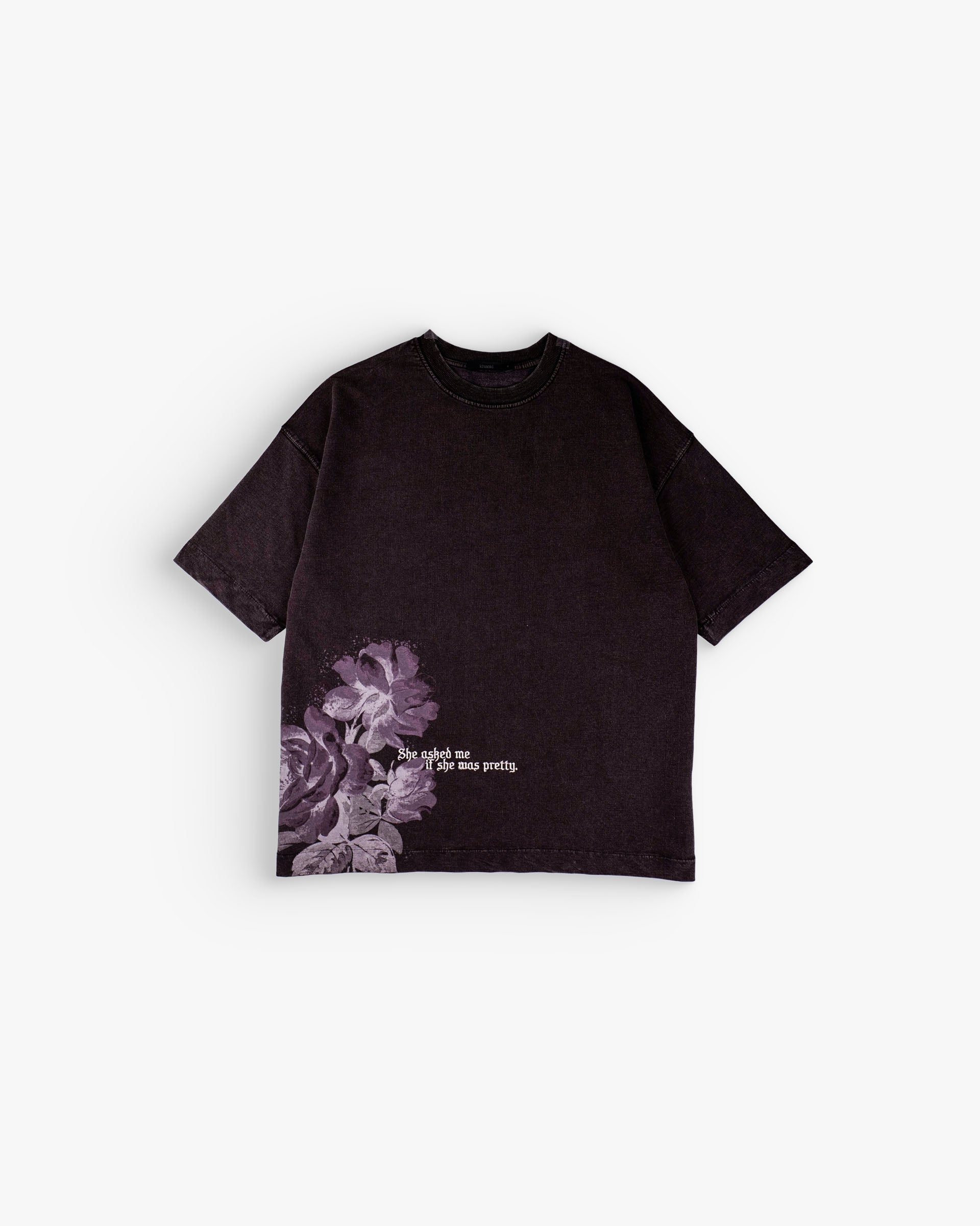 The standout feature is the faded floral print, carefully placed to evoke a sense of nostalgia and artistry. Paired with the poetic phrase “She asked me if she was pretty.”, the design creates a subtle yet powerful statement—balancing romanticism with raw streetwear energy.