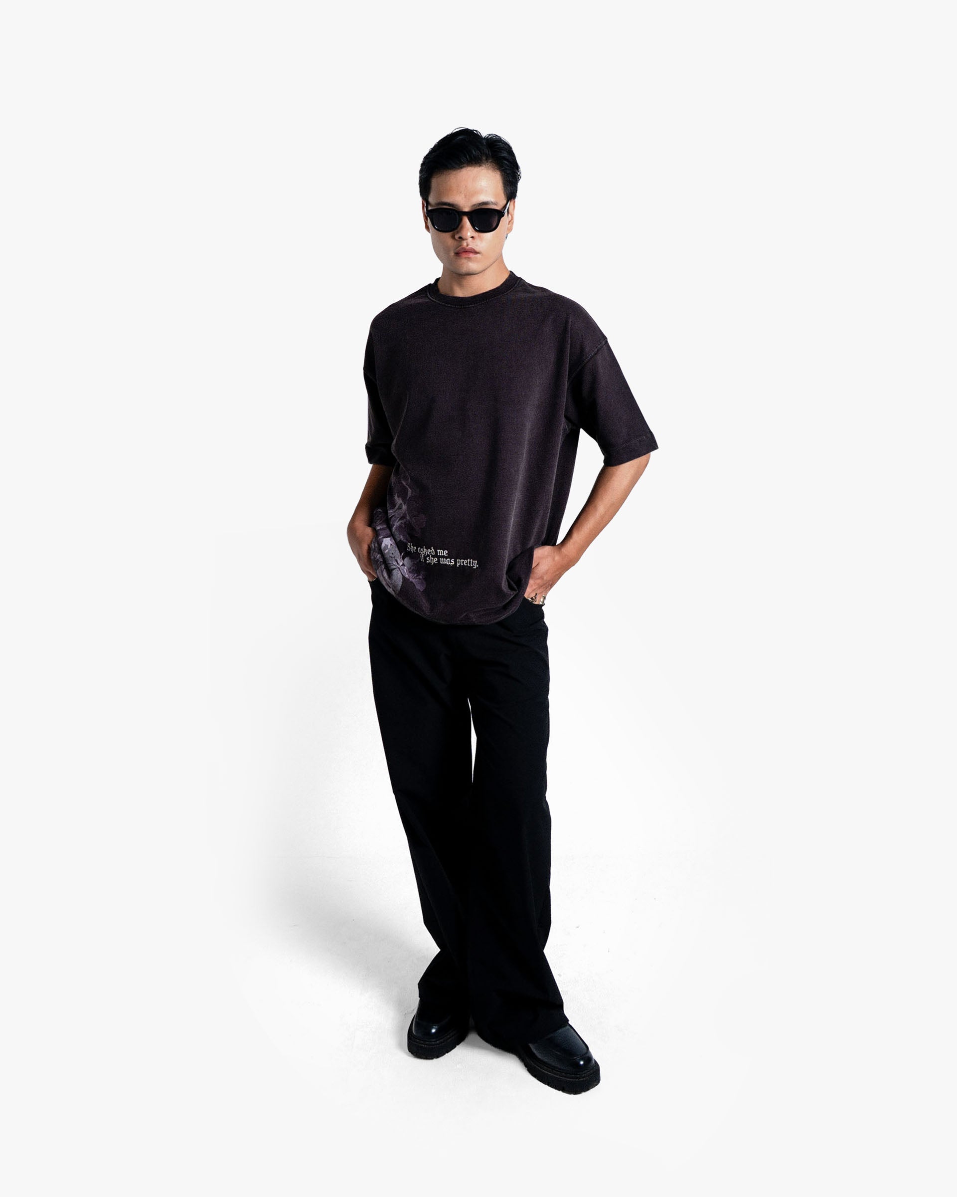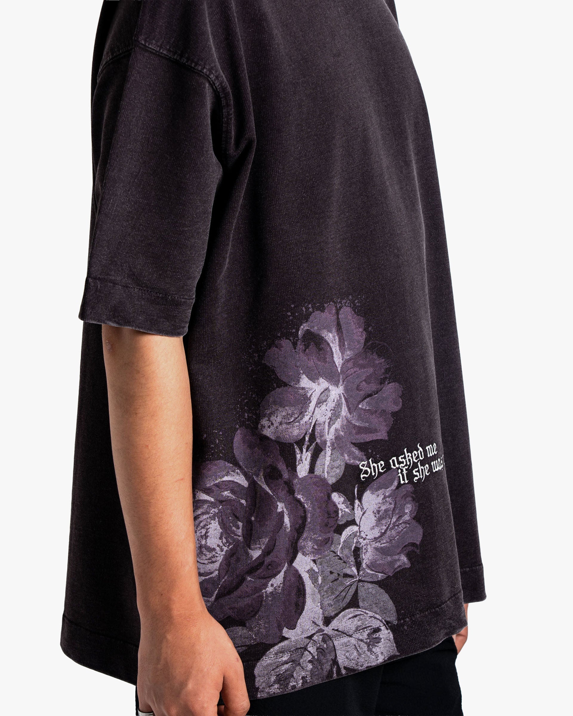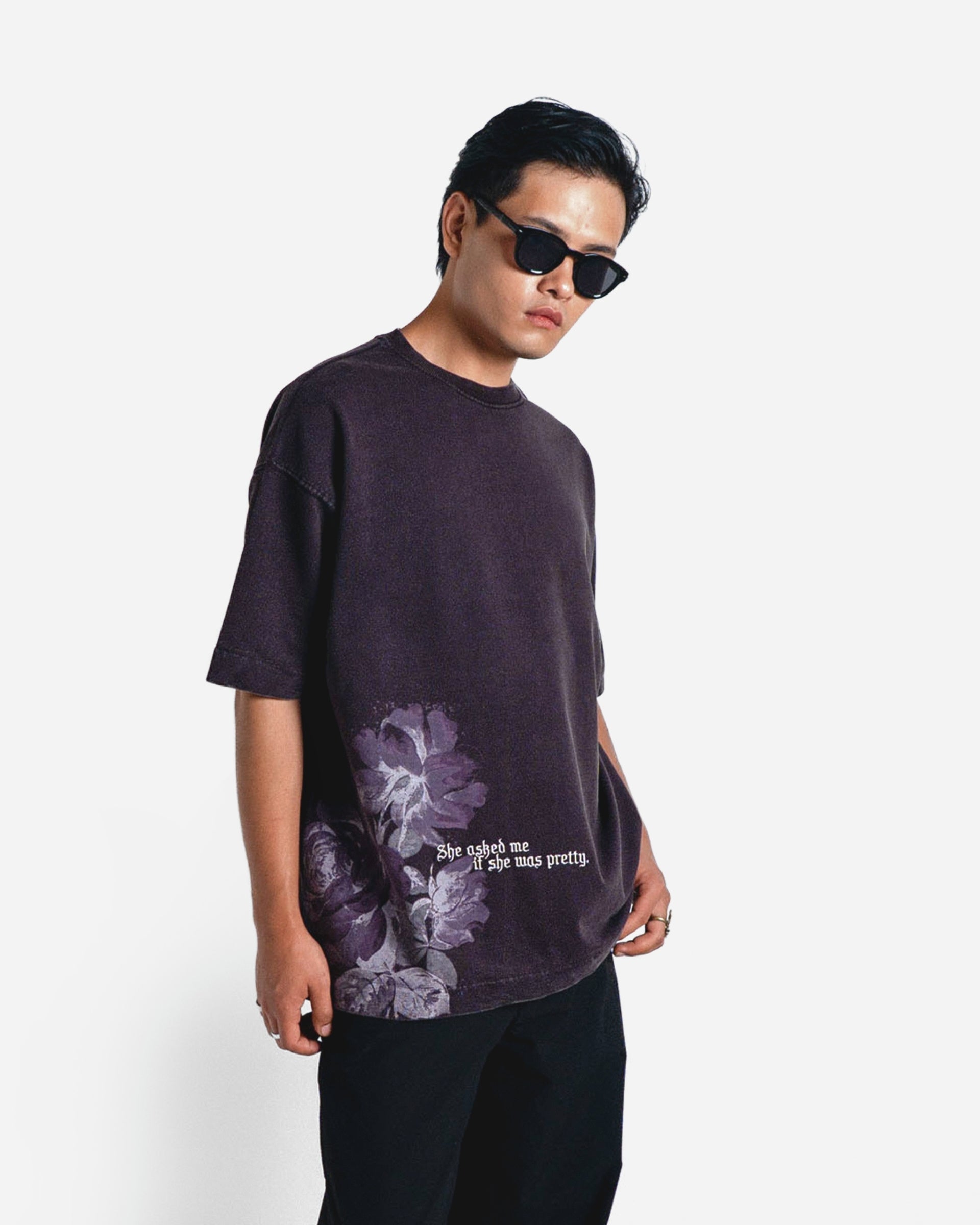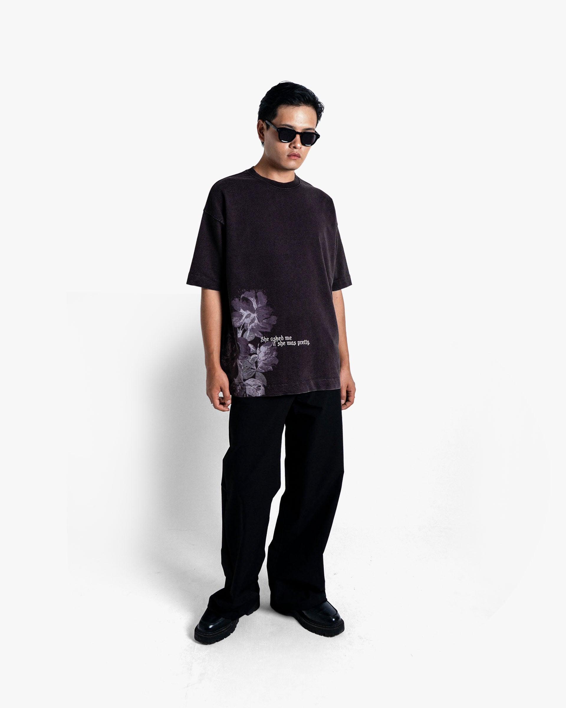 The standout feature is the faded floral print, carefully placed to evoke a sense of nostalgia and artistry. Paired with the poetic phrase “She asked me if she was pretty.”, the design creates a subtle yet powerful statement—balancing romanticism with raw streetwear energy.