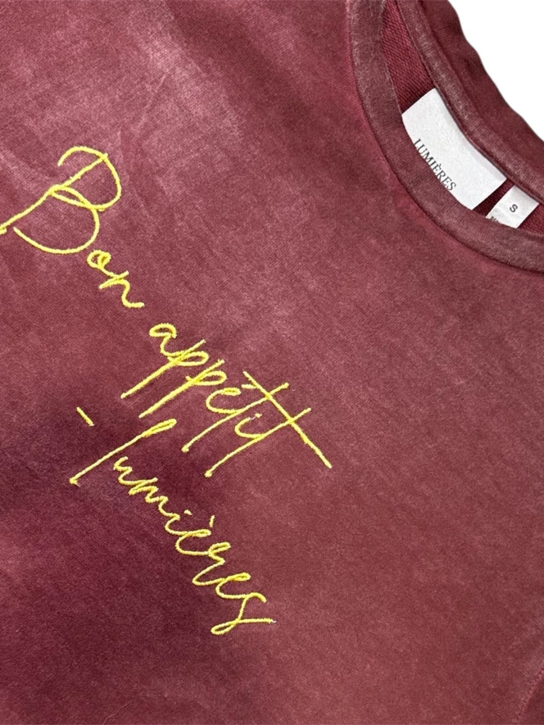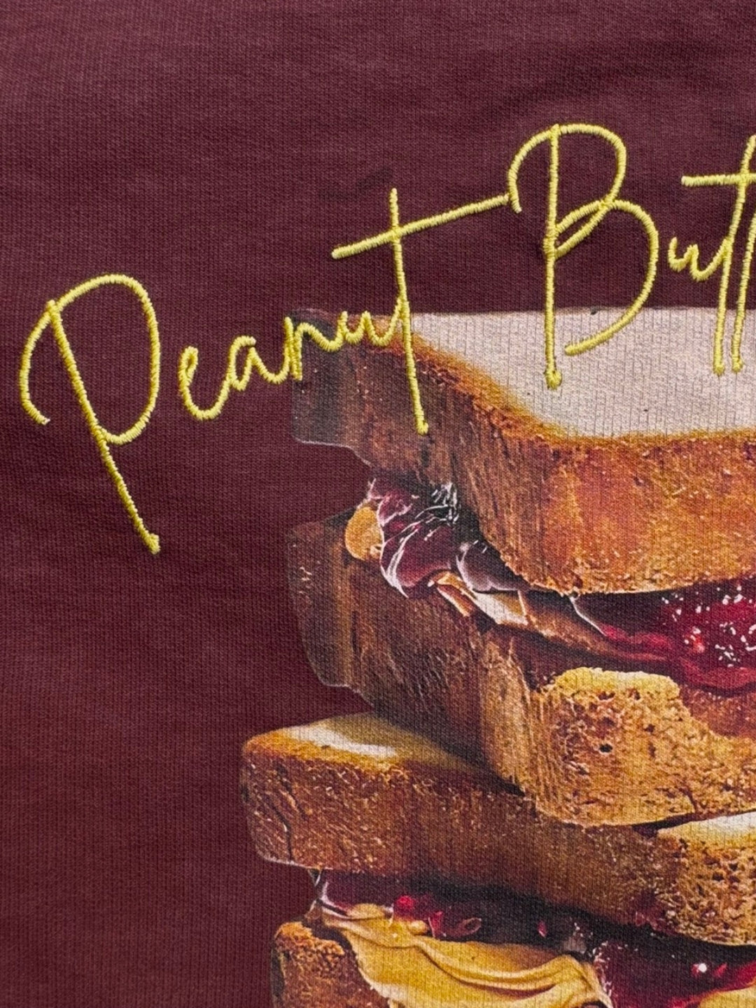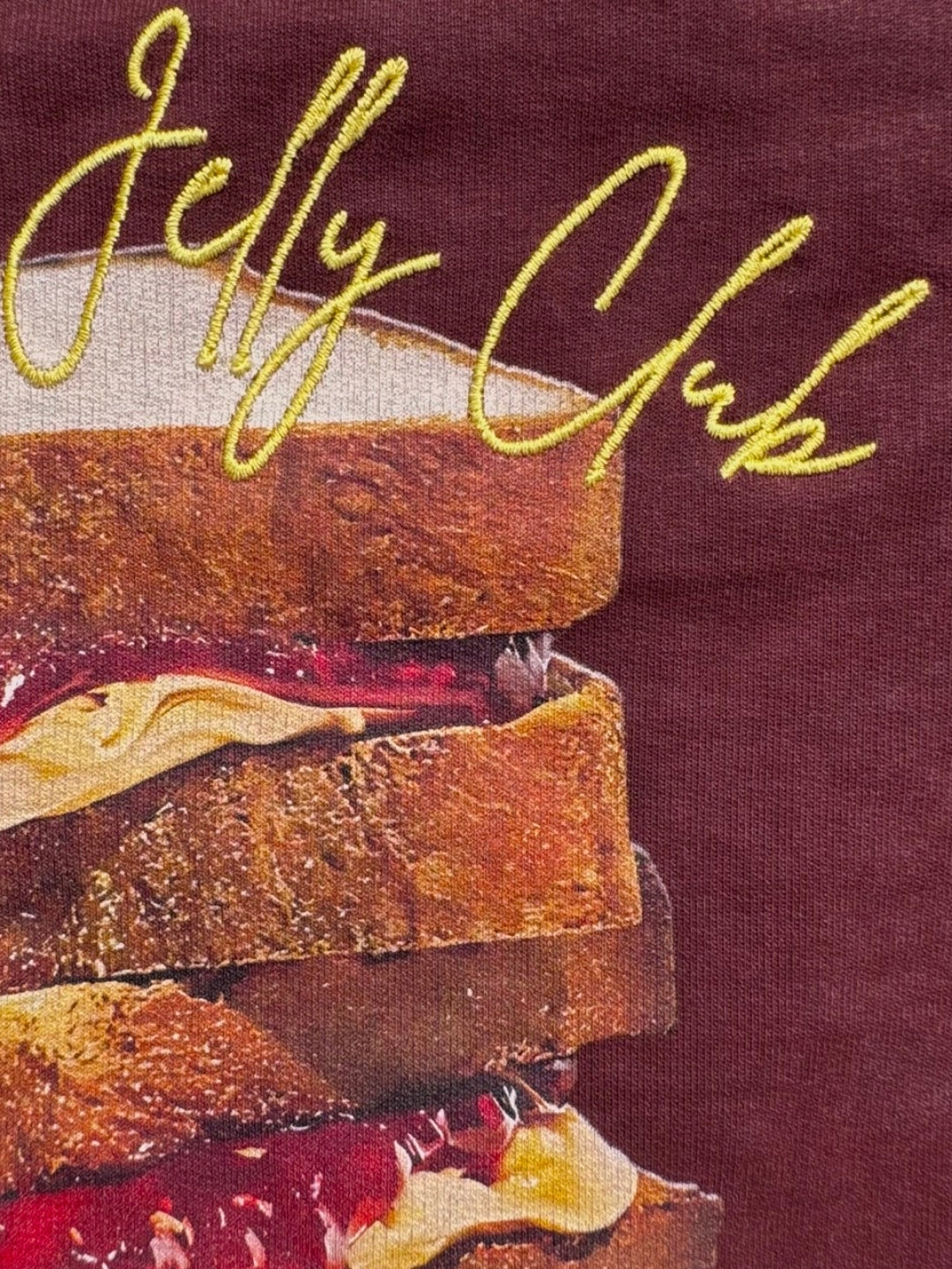 Front features premium spun yellow embroidery "bon appétit, lumières", Back features a vivid stacked PBJ toast and contrast embroidered text detail "Peanut Butter Jelly Club". Crewneck and dropped shoulders for a relaxed fit and versatile structure.