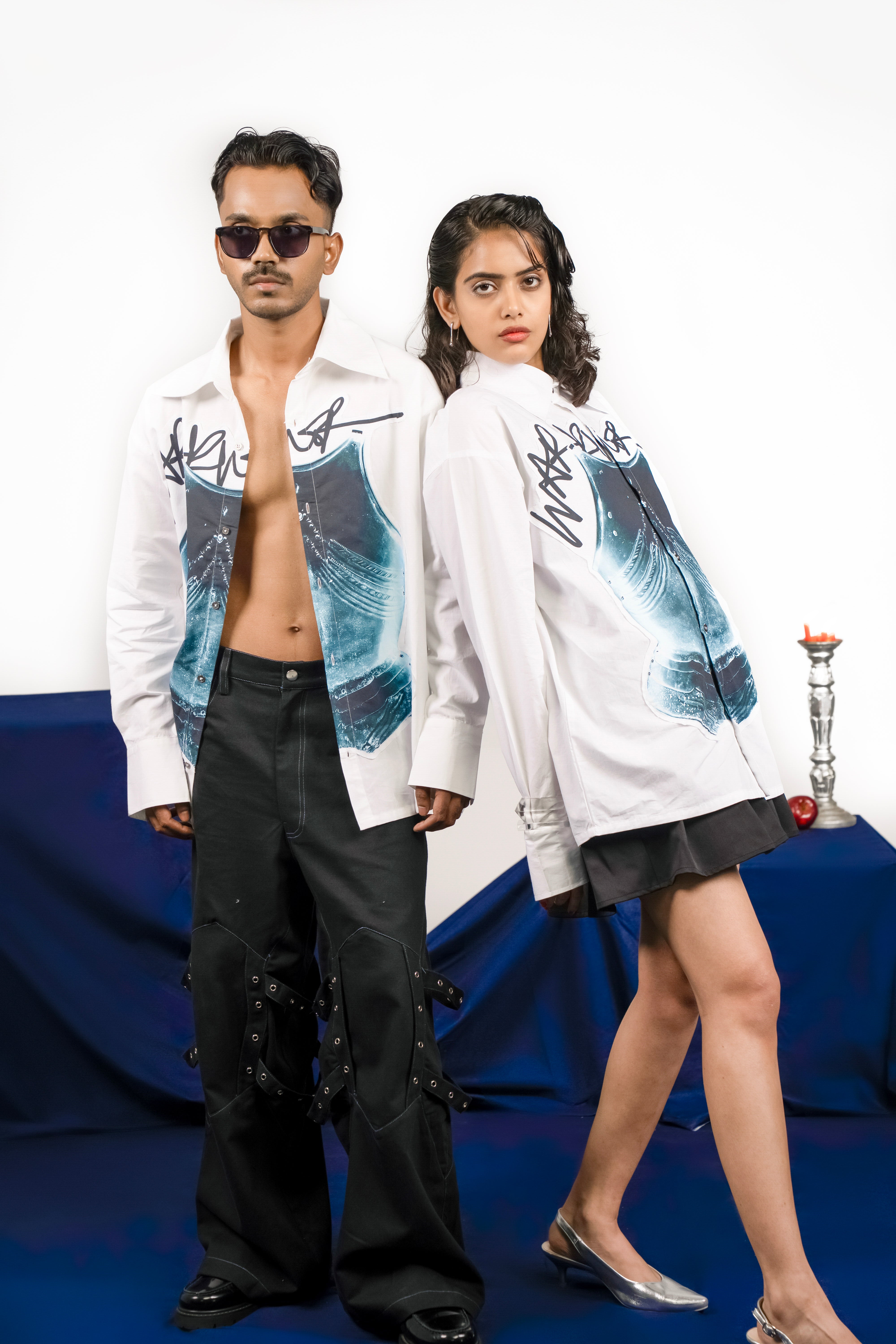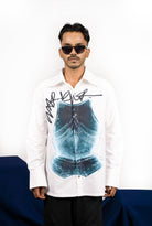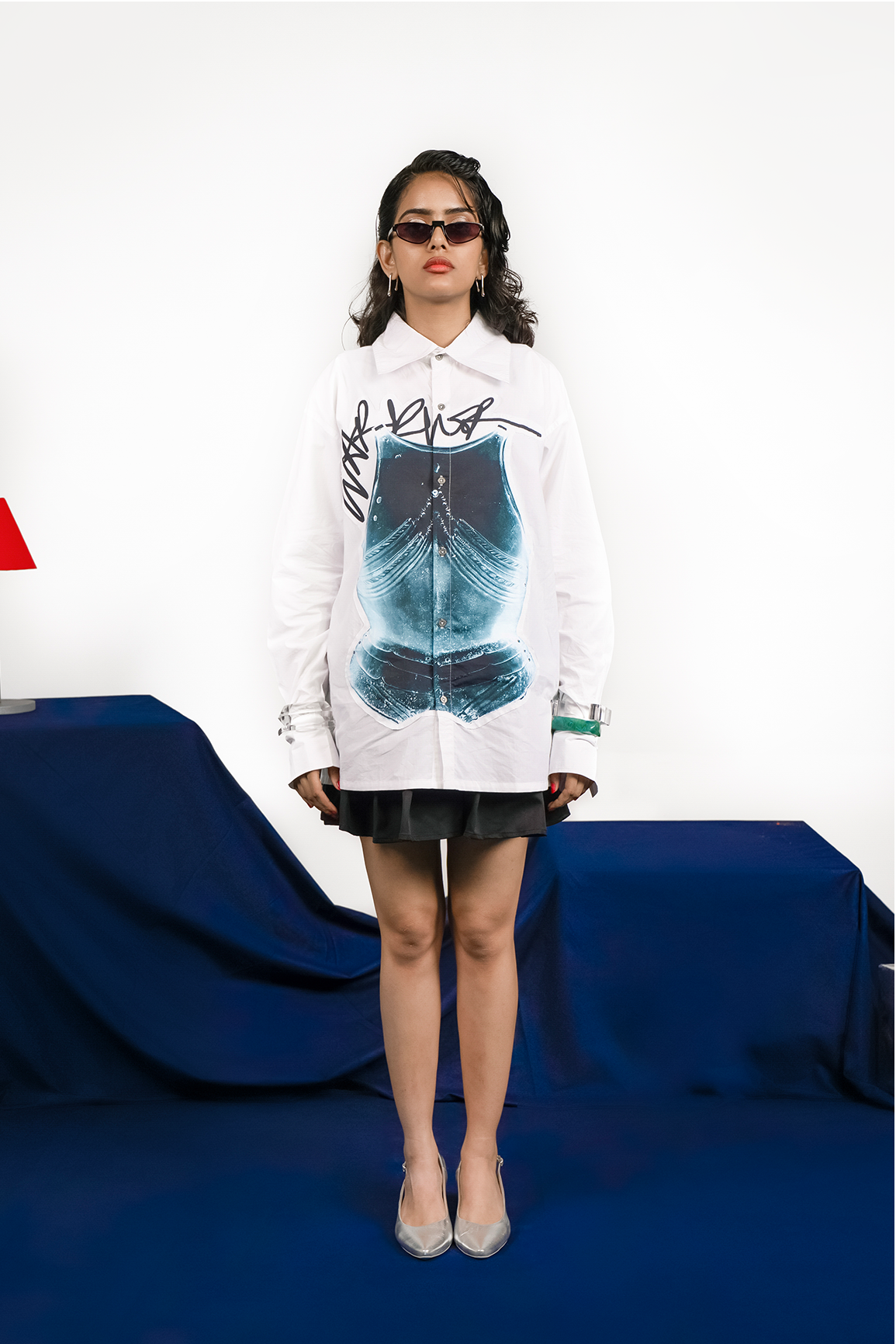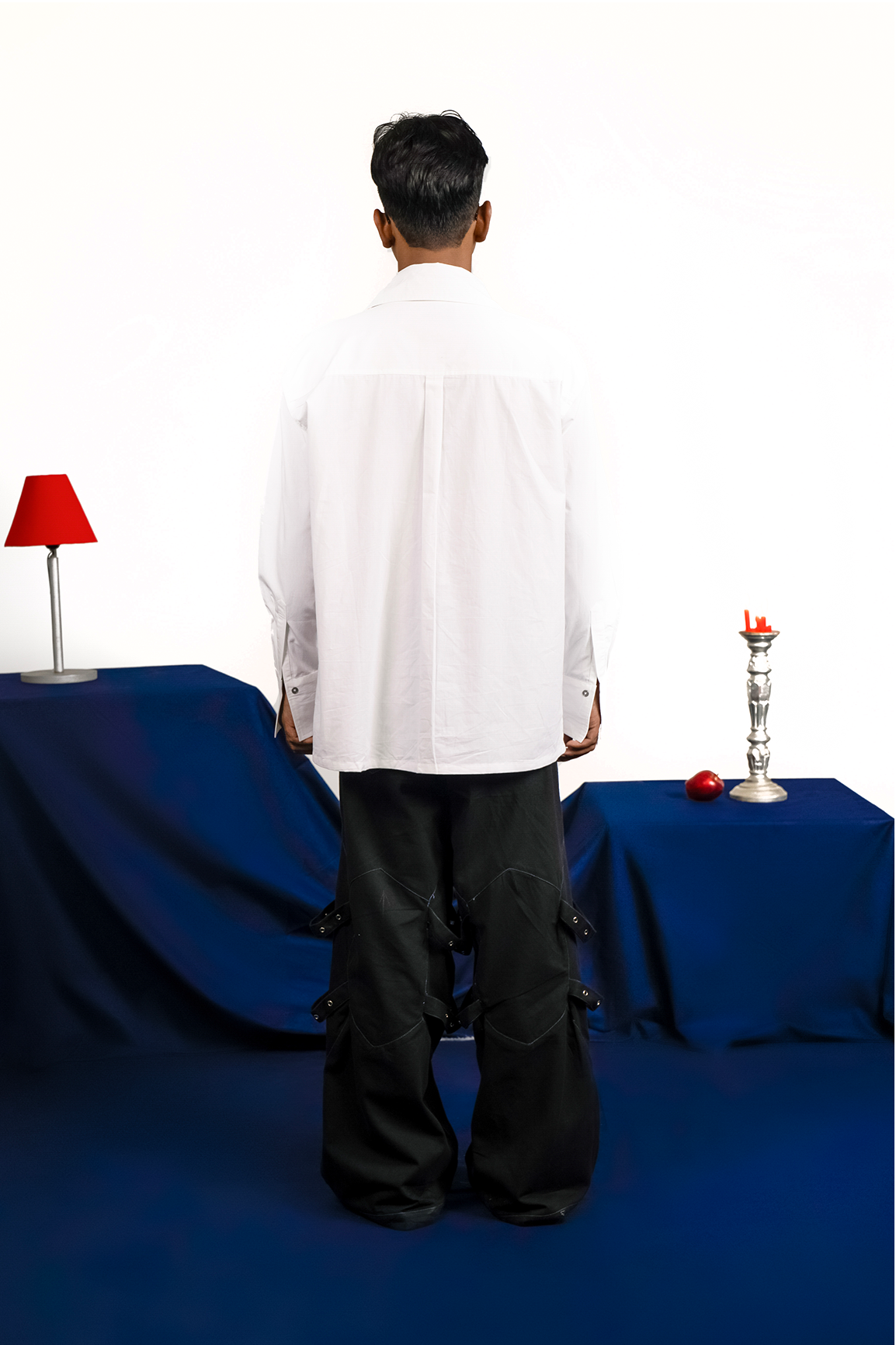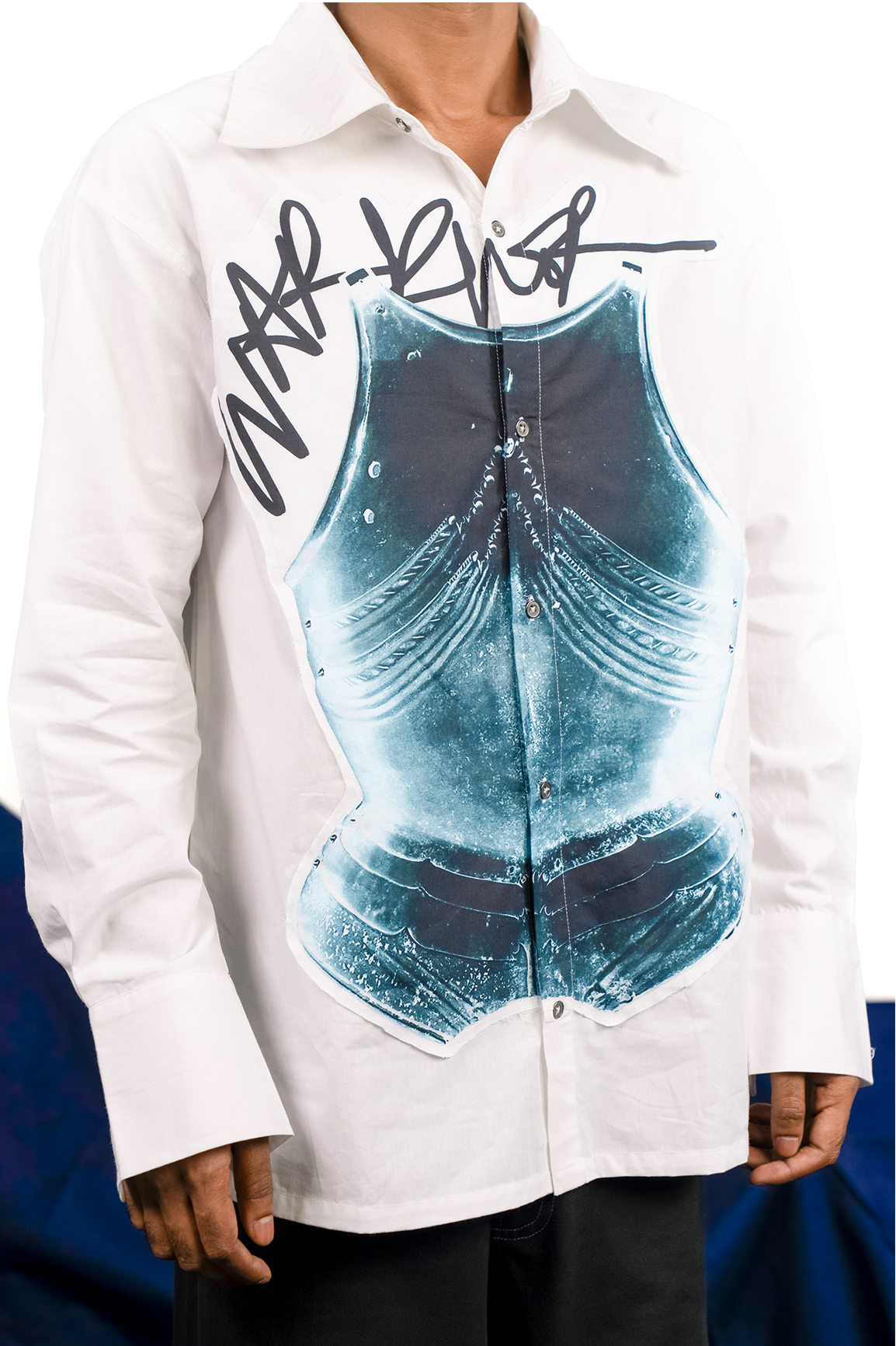 Trompe-l'œil armour design patched on the front inspired by the strength and tenacity of ancient warriors. This full sleeve oversized shirt is made from breathable and light cotton poplin fabric. With a wide shirt collar, regular placket and wide cuffs on the sleeves, this shirt is made for the unbreakable!