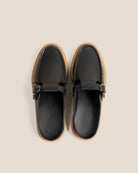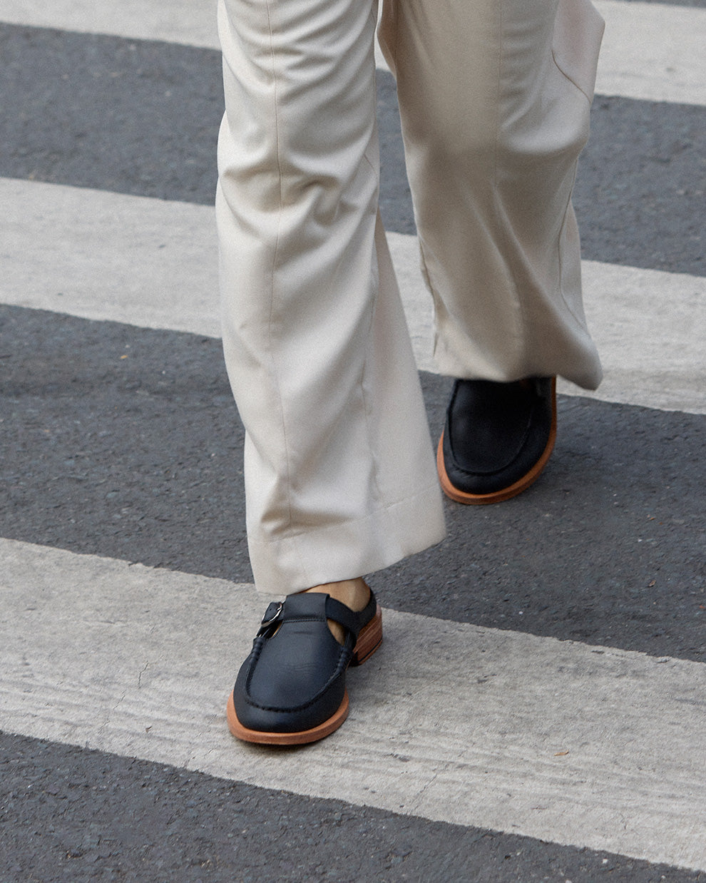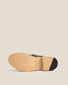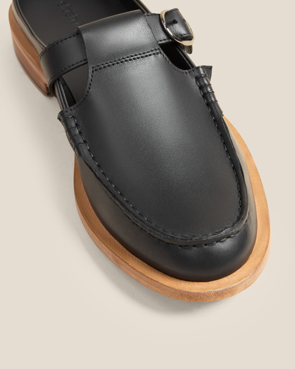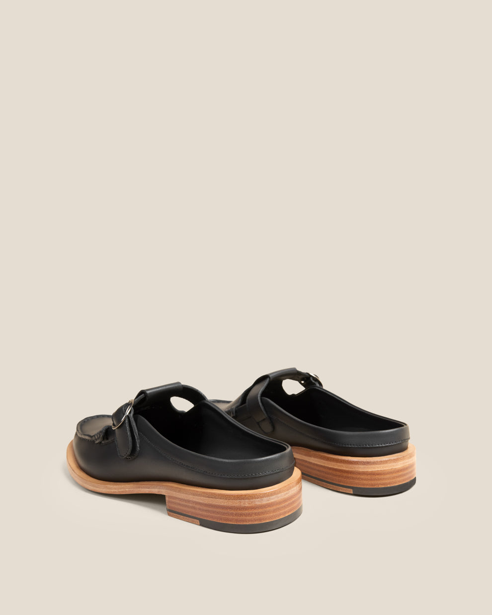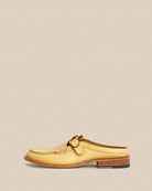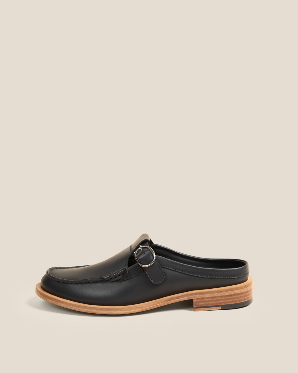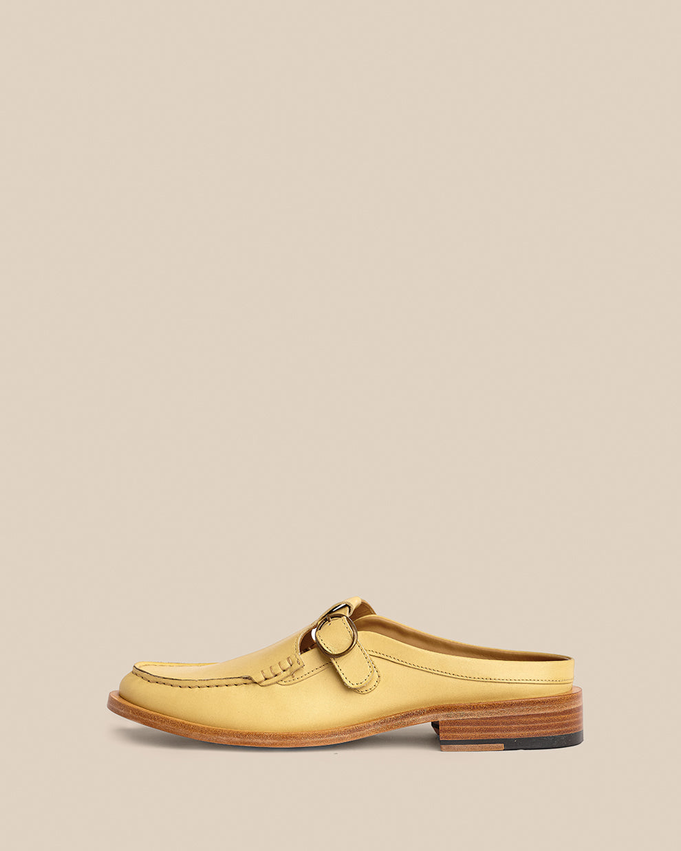 A slip-on loafer mule with a hand-sewn apron, rounded toe and adjustable buckle strap. It rests on an Argentinian leather sole left completely undyed, retaining its natural pinkish patina, an intentional detail that gives the shoe a subtle, striking contrast.
