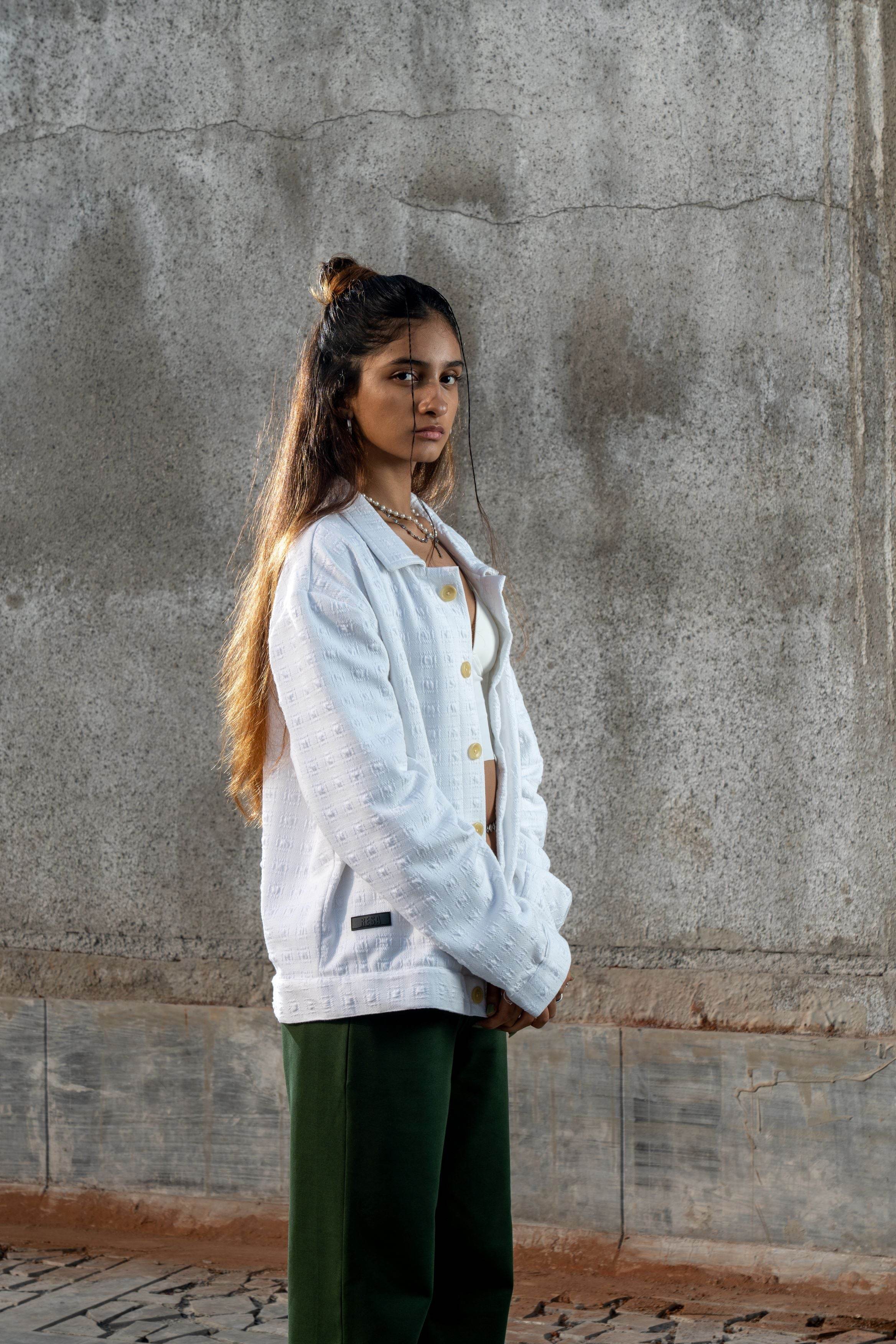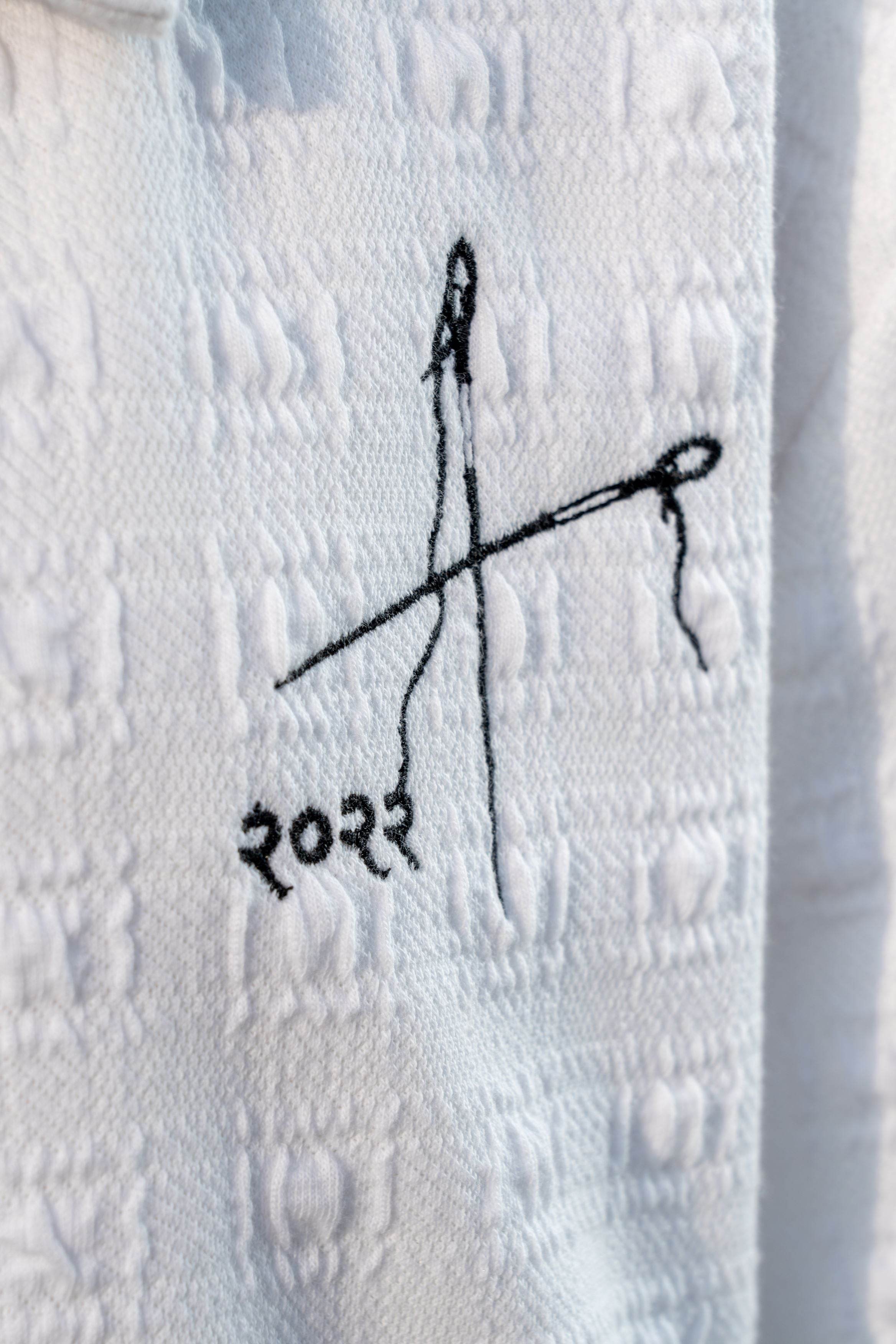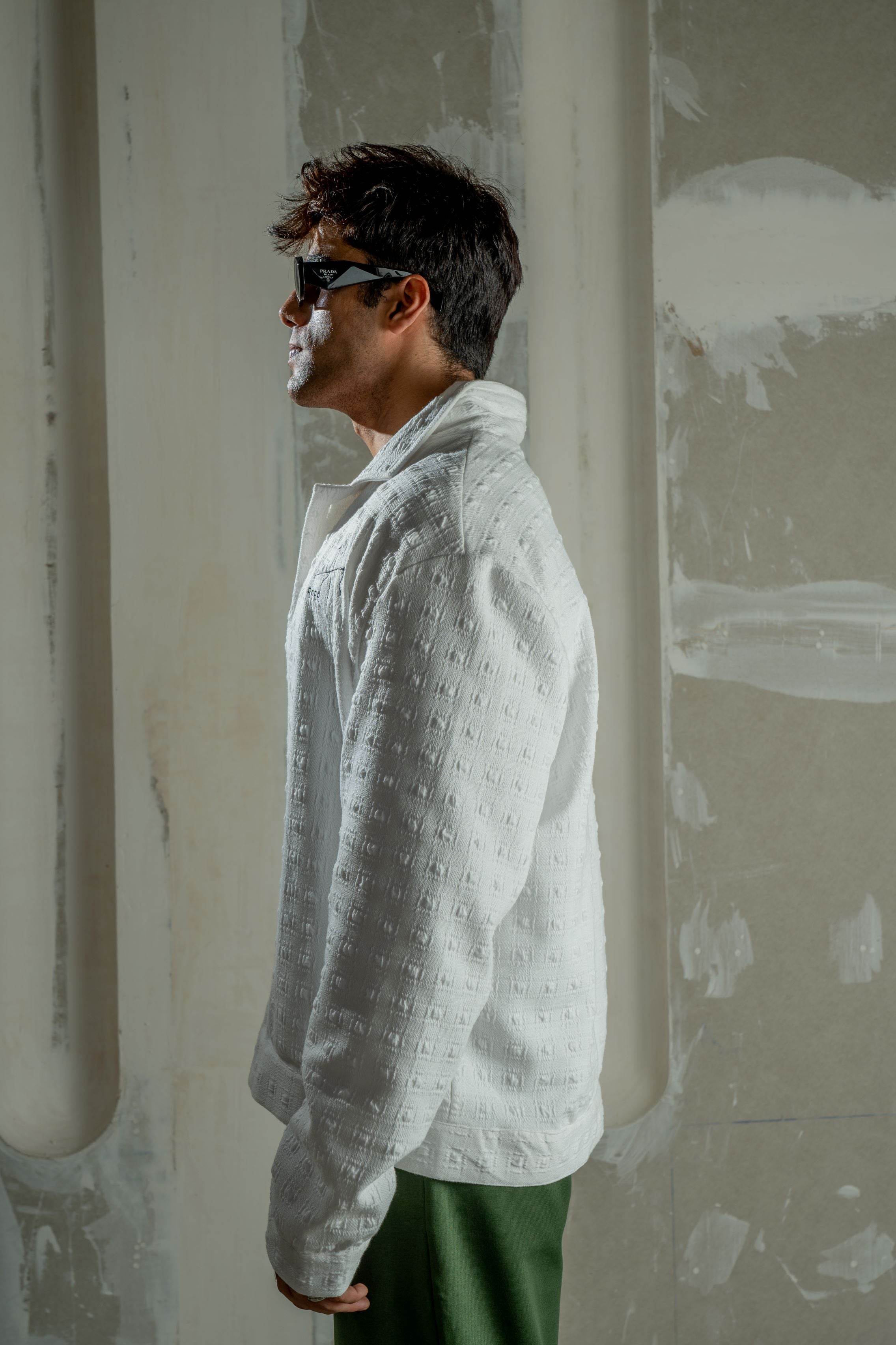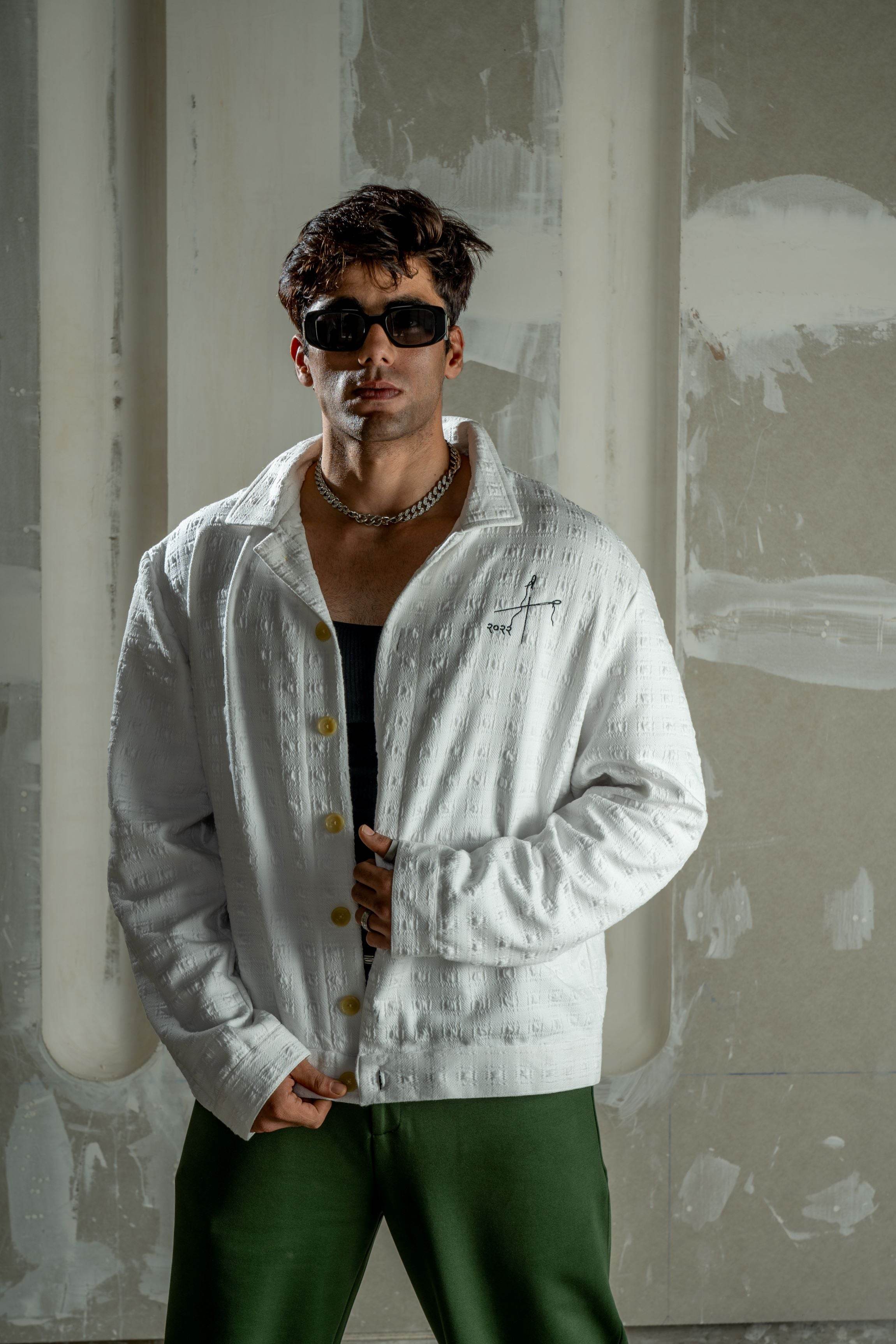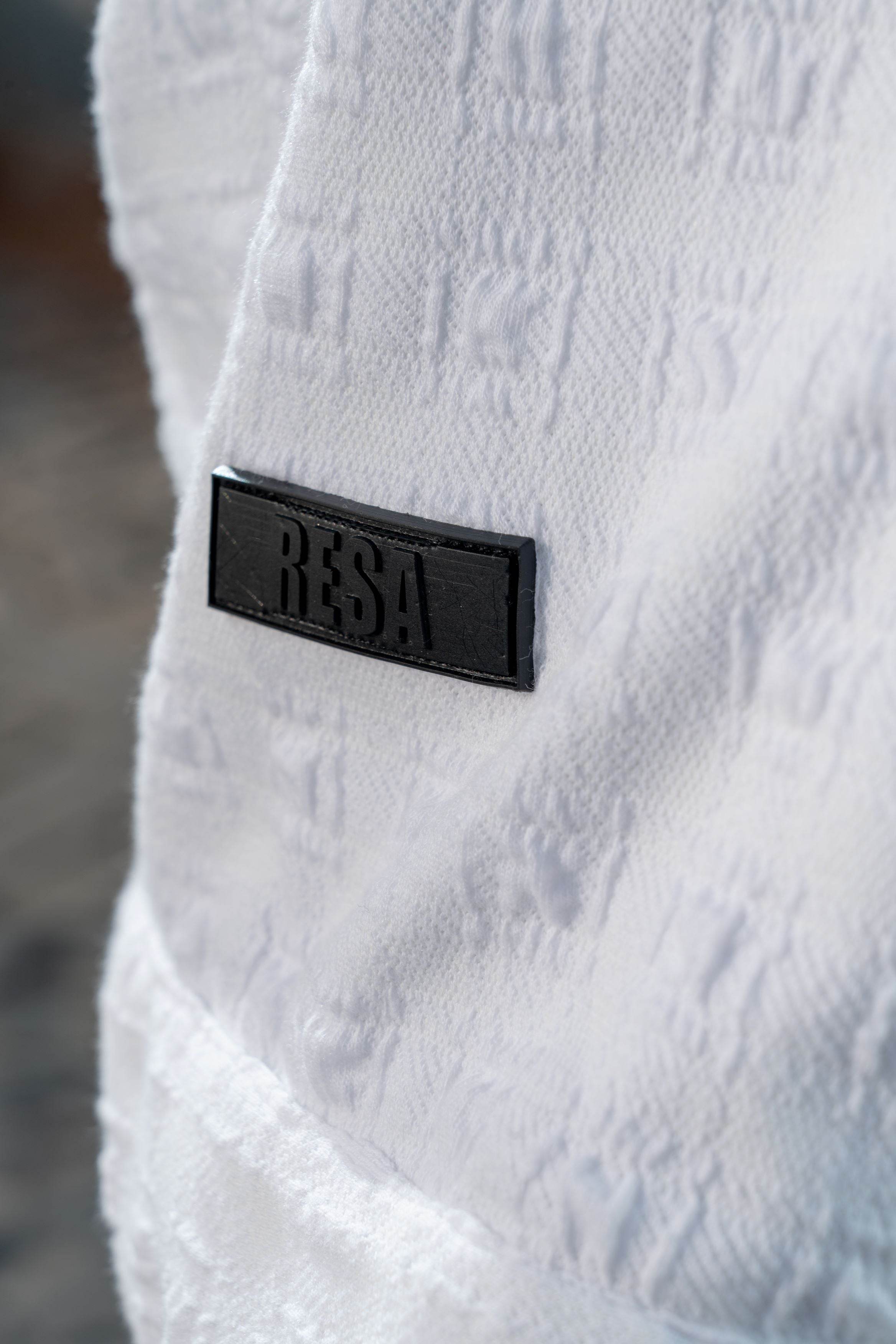 Tyohaar White Jacket, made of unique knit fabric, combines RESA's signature craftsmanship with elegant design. It features functional fashion with unique patterns, Tyohaar black embroidery on the top left, and a RESA rubber tag on the front at the bottom right.