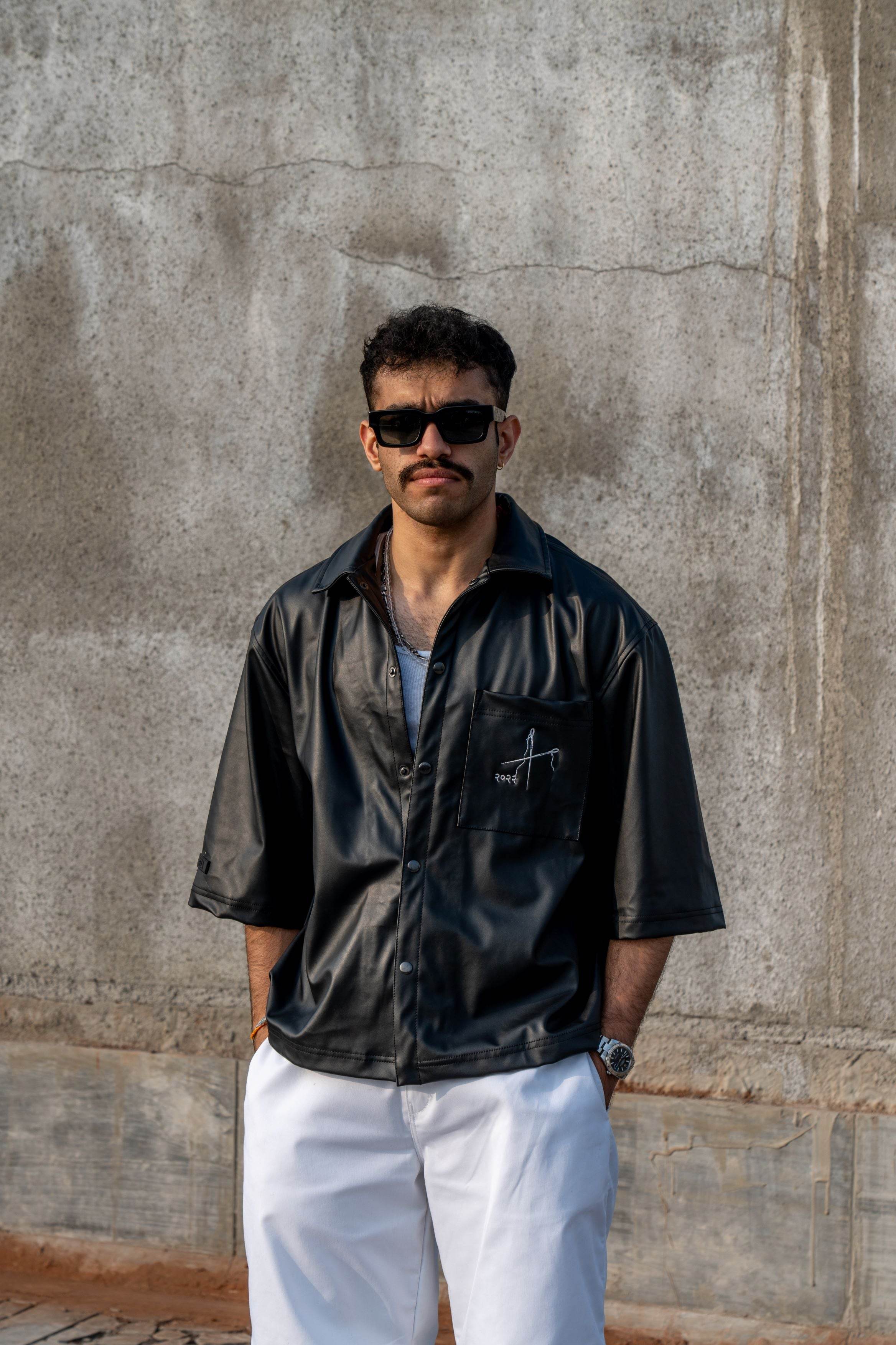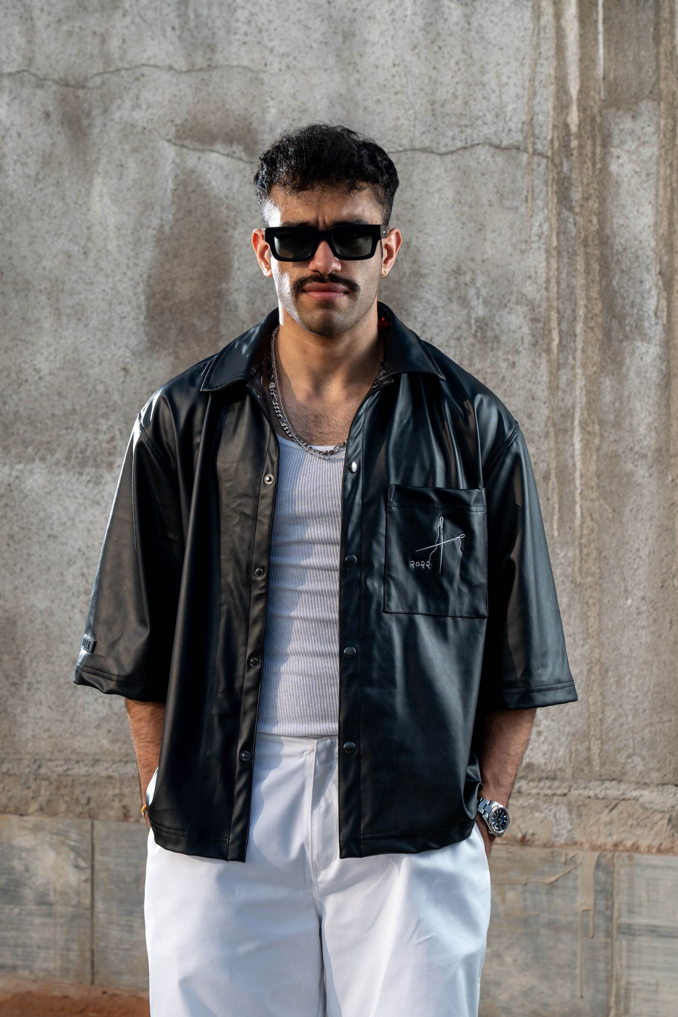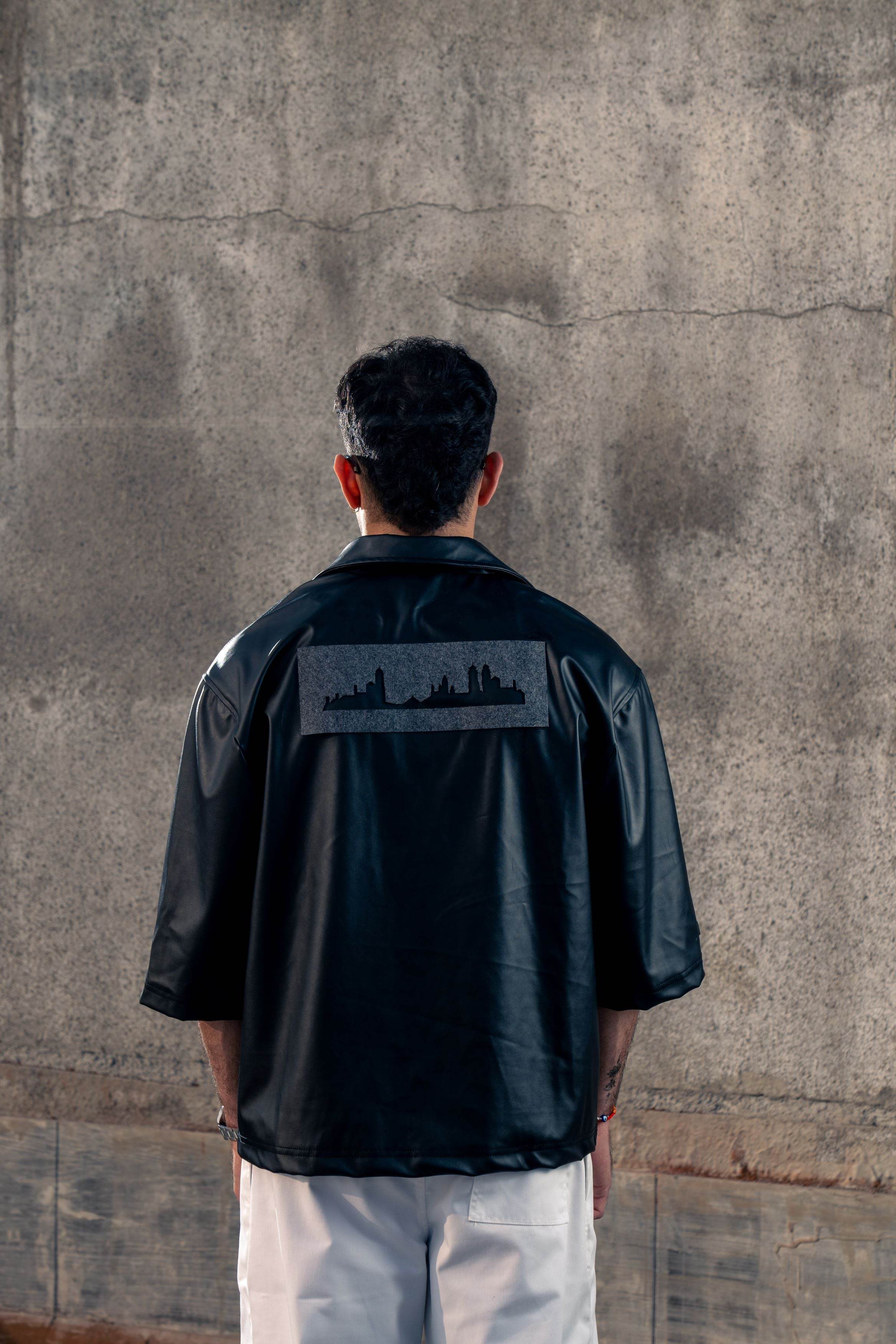 Tyohaar Leather Shirt by RESA features high-quality faux leather with signature white Tyohaar embroidery on the front pocket and a RESA rubber tag on the right sleeve. The back showcases Mumbai's skyline through a detailed laser-cut design, celebrating the city's spirit and artistic diversity. This shirt is a tribute to the City of Dreams.