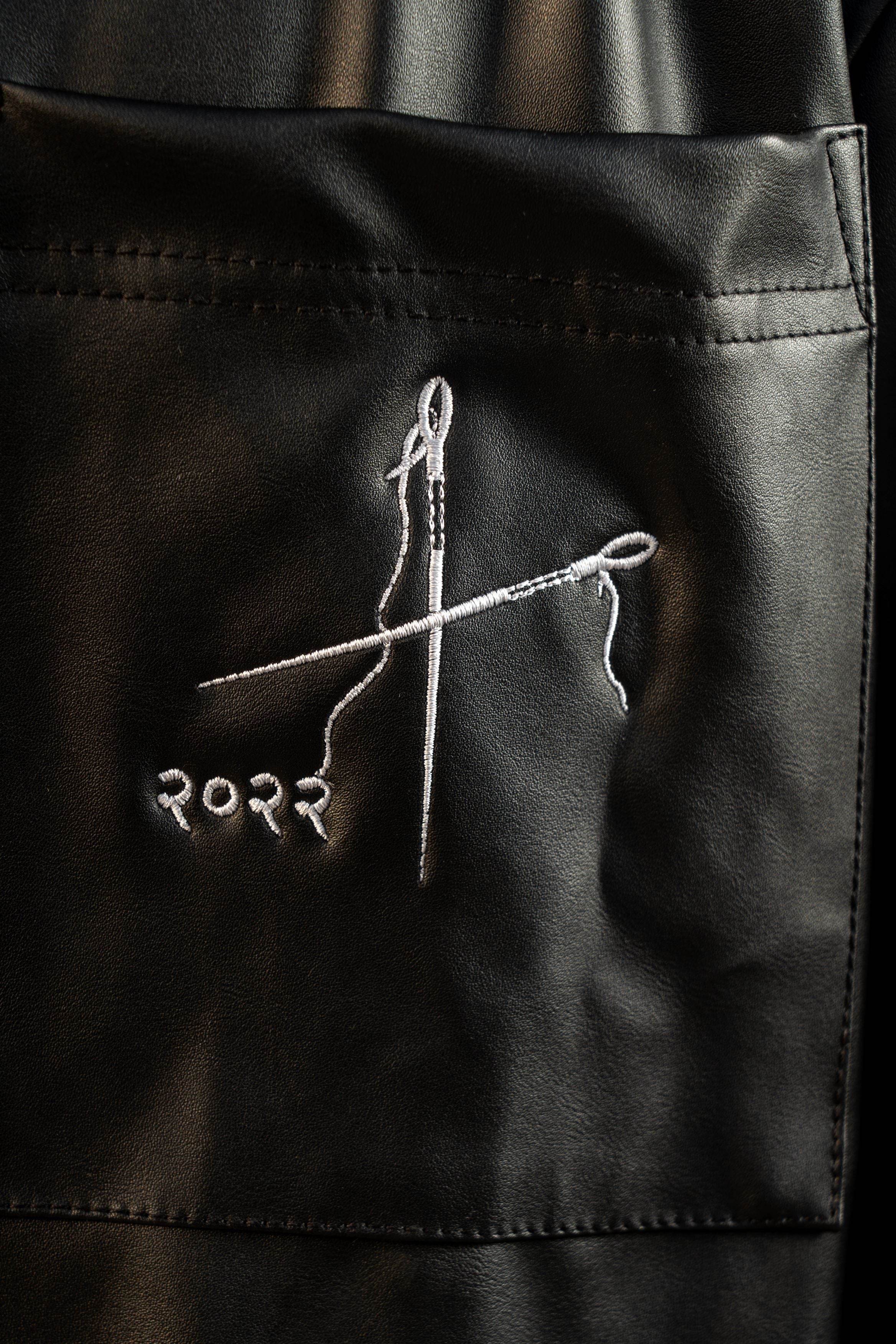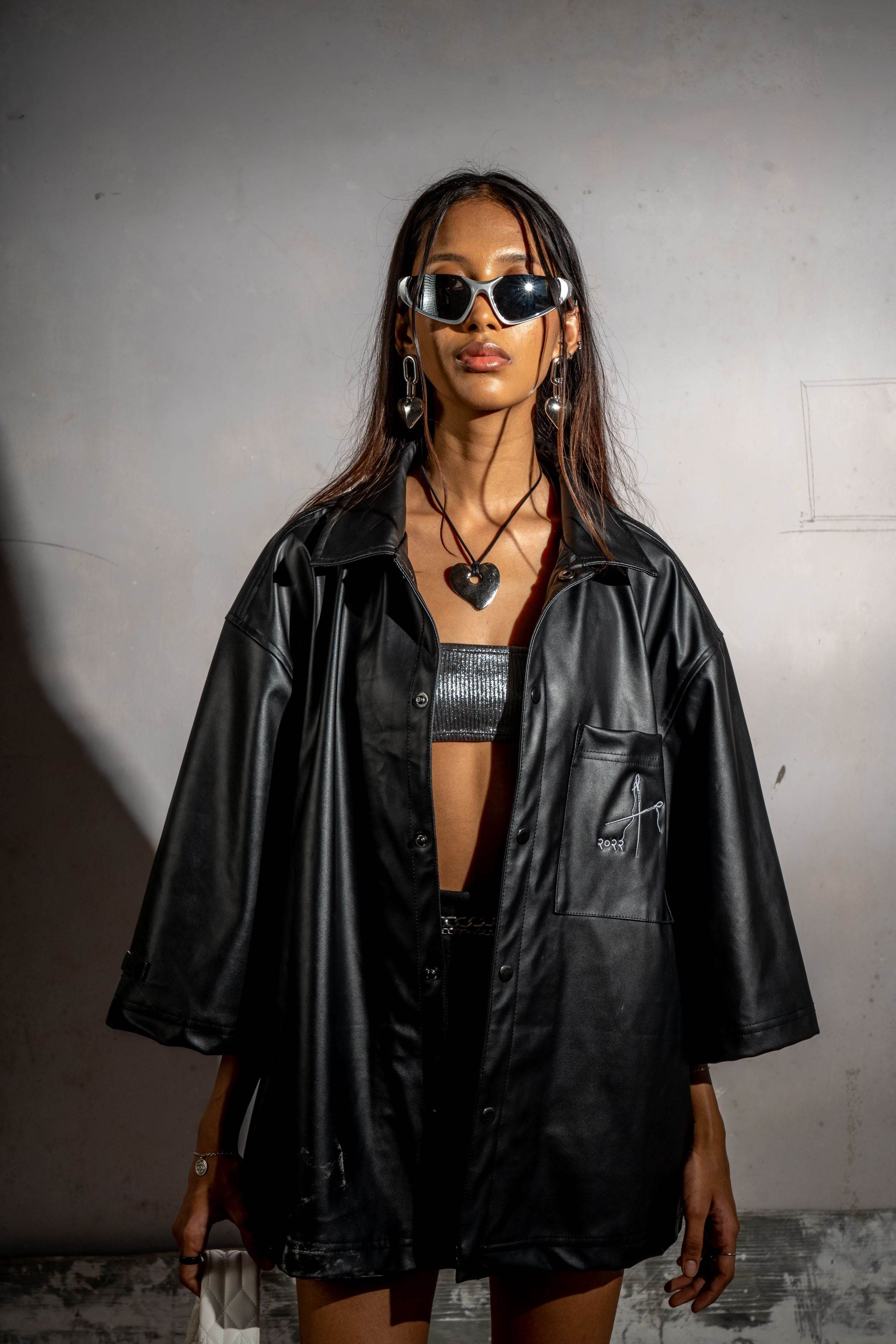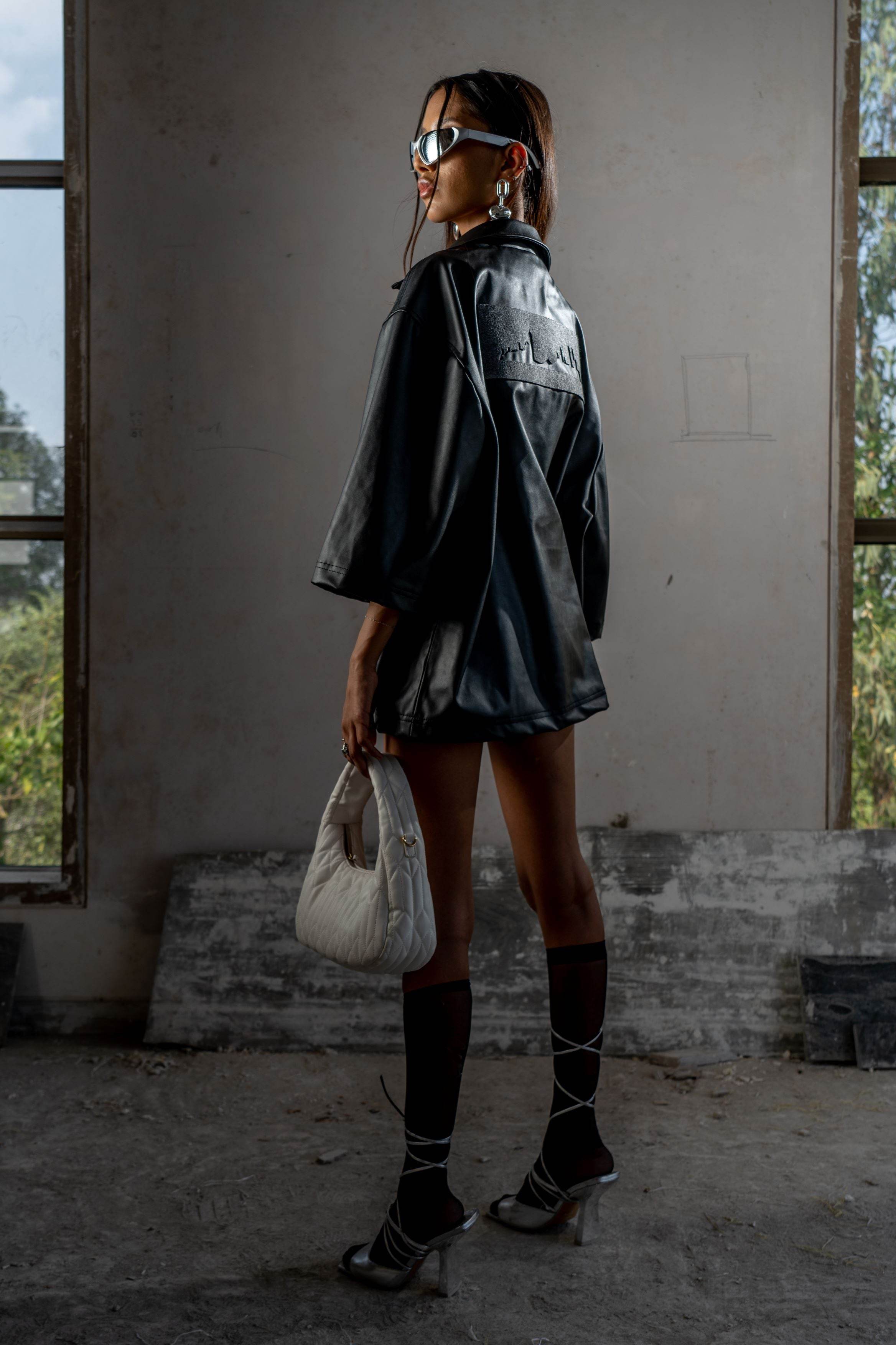 Tyohaar Leather Shirt by RESA features high-quality faux leather with signature white Tyohaar embroidery on the front pocket and a RESA rubber tag on the right sleeve. The back showcases Mumbai's skyline through a detailed laser-cut design, celebrating the city's spirit and artistic diversity. This shirt is a tribute to the City of Dreams.