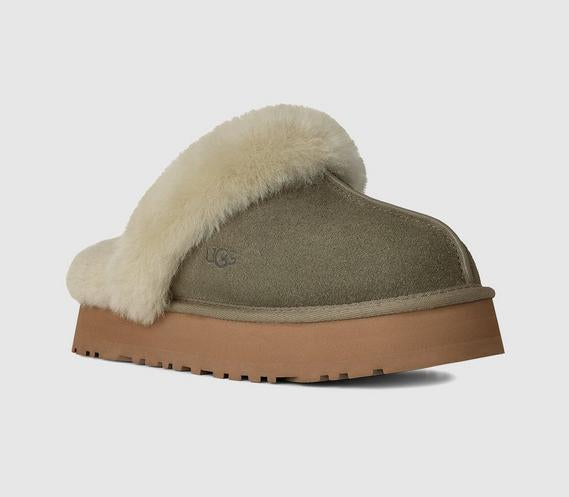 # UGG Disquette Slipper (W) MOSS GREEN Experience refined comfort with the UGG Disquette in a sophisticated moss green hue. Built with genuine sheepskin and a sumptuous wool interior, this slipper provides exceptional warmth and breathability for year-round wear. The cushioned footbed molds to your foot's contours, offering personalized support during extended use. Its durable construction and flexible sole make it equally suitable for indoor lounging or quick outdoor errands. The earthy moss green shade adds understated elegance to any space, while UGG's heritage craftsmanship guarantees lasting quality and comfort.