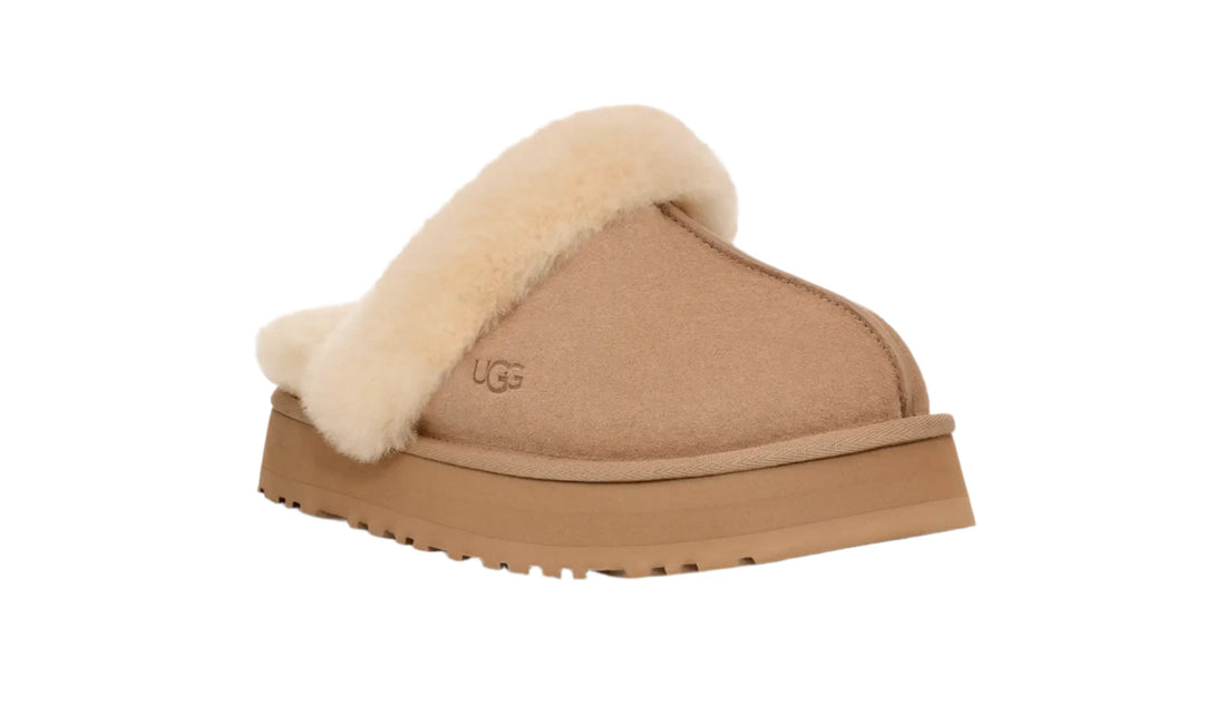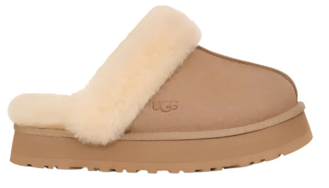 # UGG Disquette Slipper (W) SAND Crafted from premium sheepskin, the UGG Disquette delivers luxurious comfort with every step. This women's slipper features a plush wool lining that naturally regulates temperature, keeping feet warm without overheating. The lightweight design and flexible sole make it ideal for indoor wear or casual outdoor moments. UGG's signature craftsmanship ensures durability and lasting softness, while the neutral sand tone complements any home aesthetic. Perfect for those who prioritize both comfort and quality in their everyday footwear.