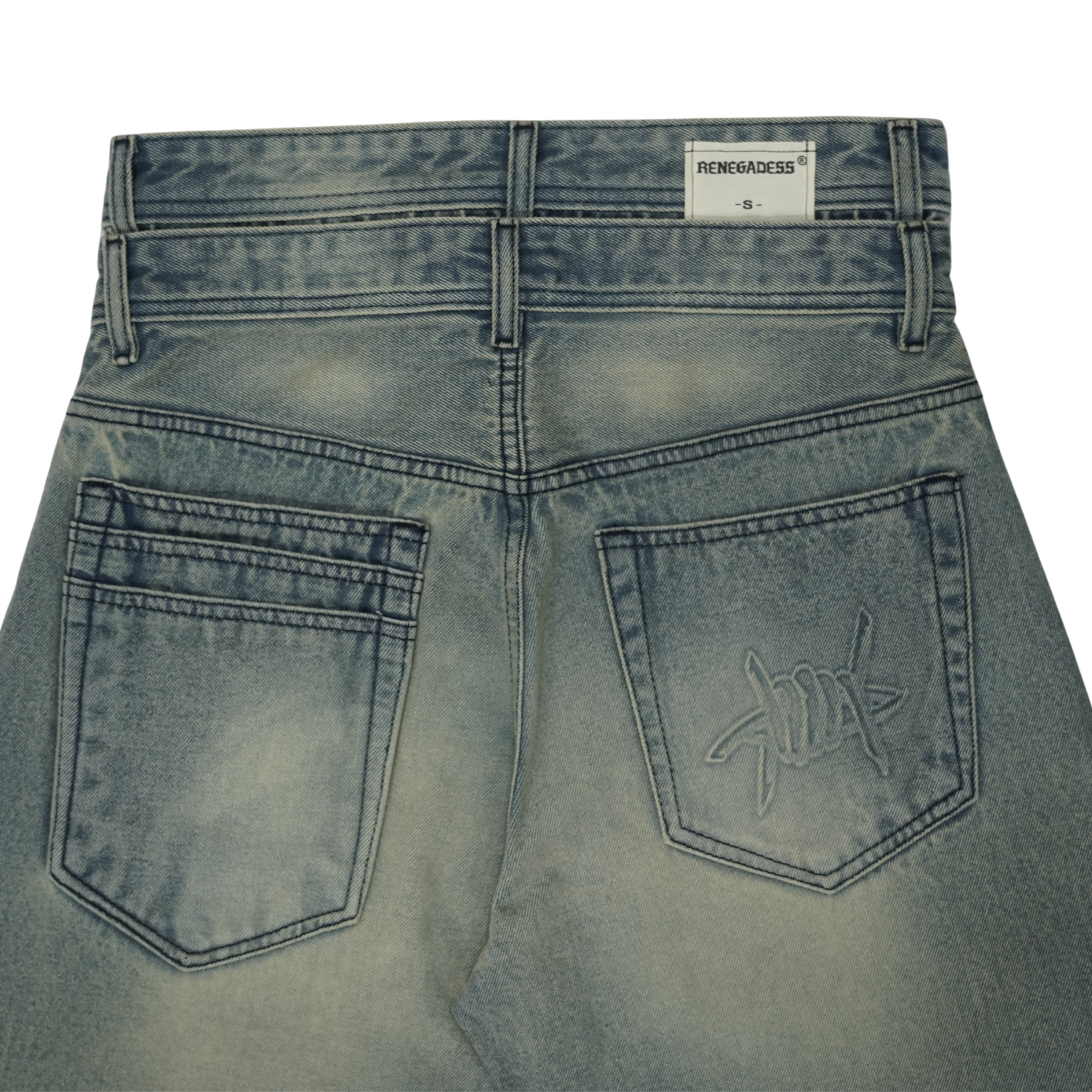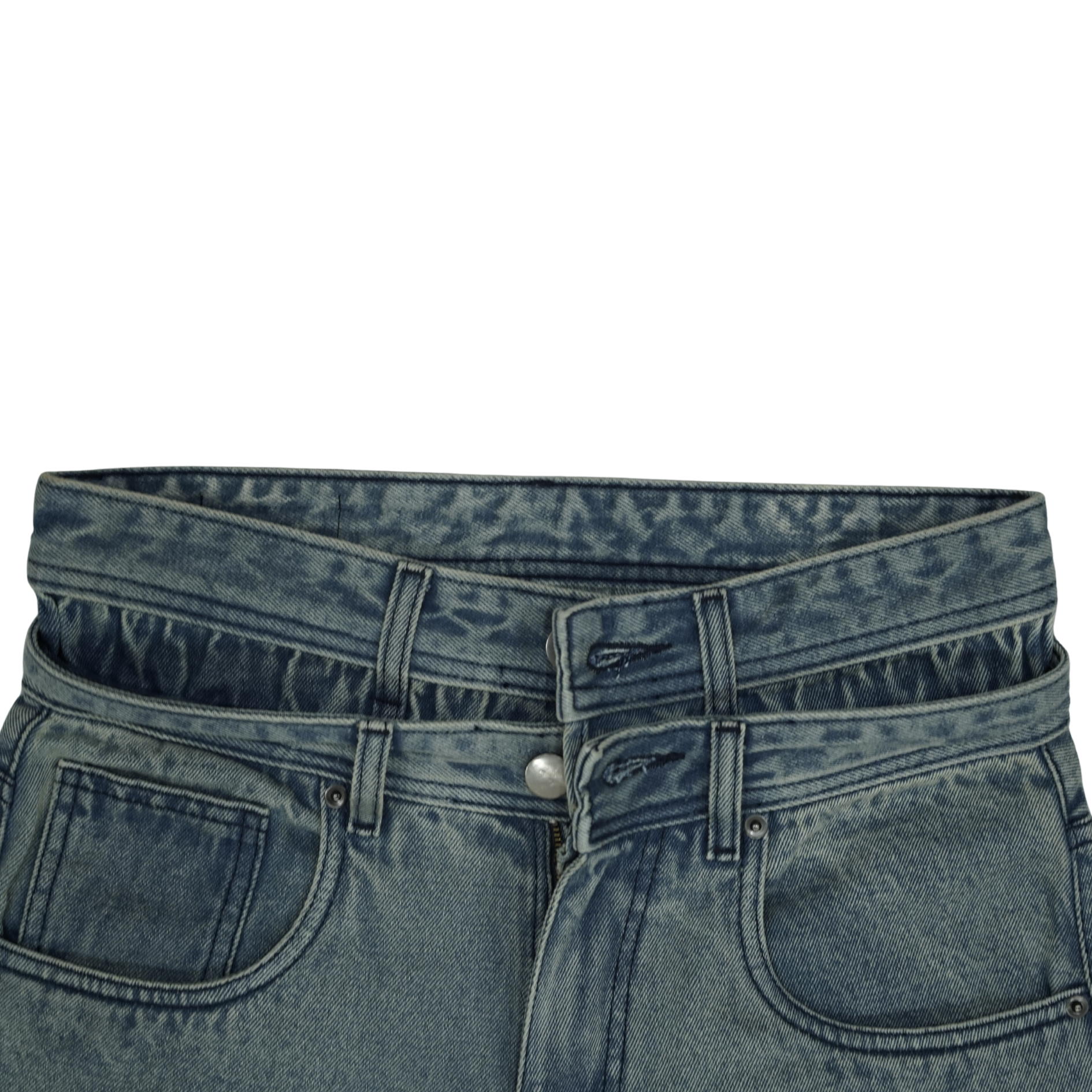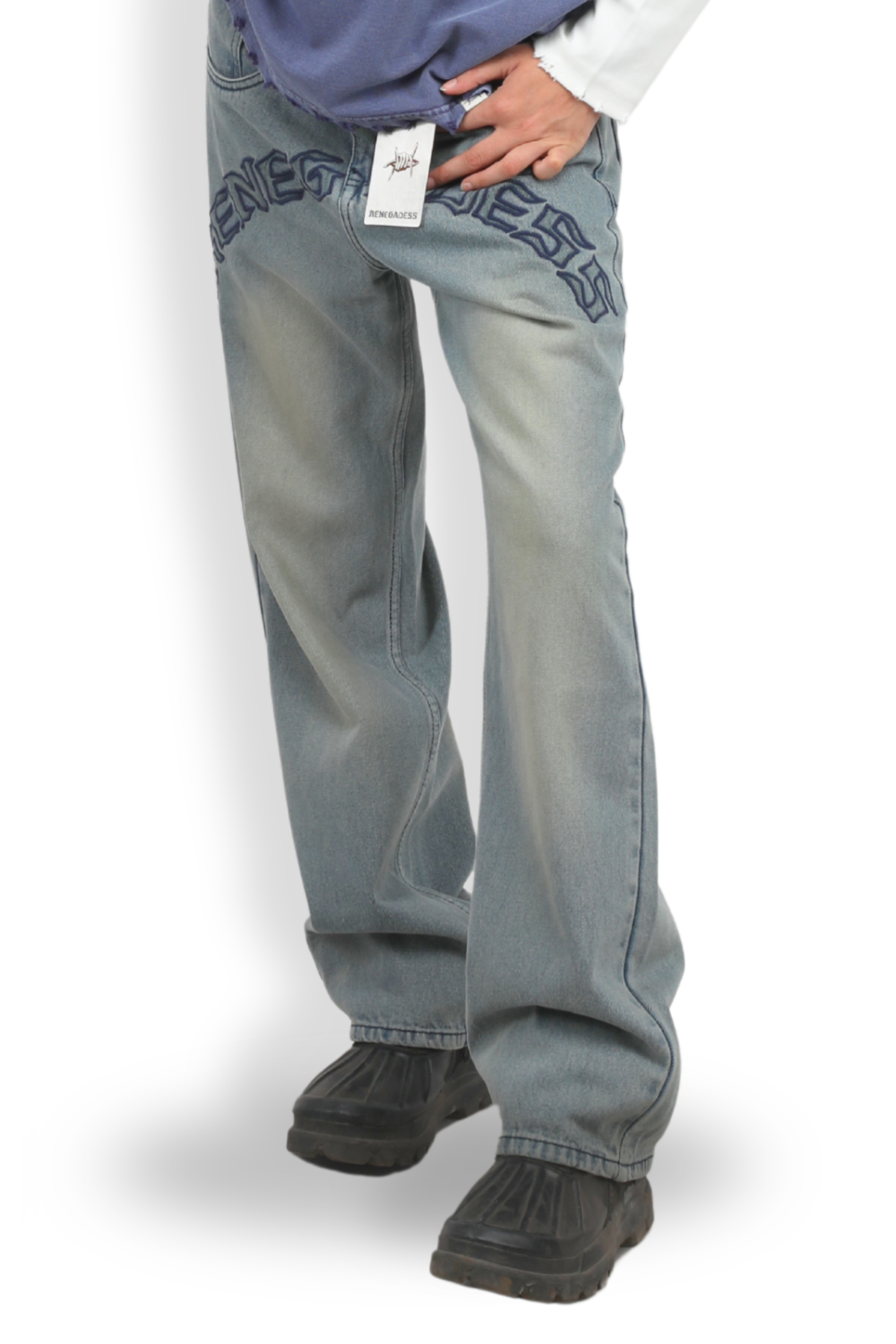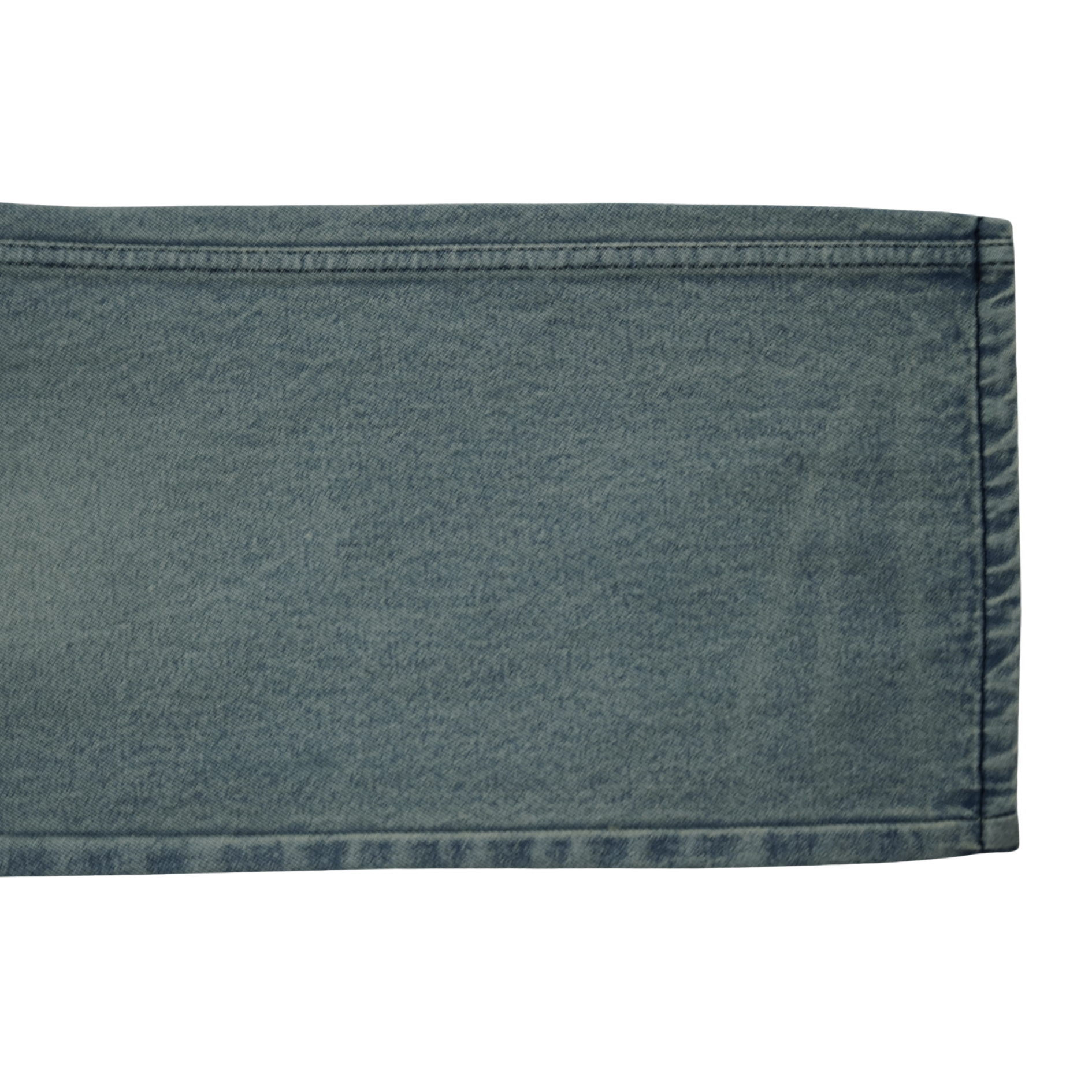 Baggy fit non-stretch washed light blue jeans with a double waistband and embroidered over the front panel (Over 50,000 stitches). Wide and low front pockets, 3 back pockets on the right side with embossing over the lower pocket and 1 pocket on the left side. YKK fly zipper. Limited to only 50 pieces.