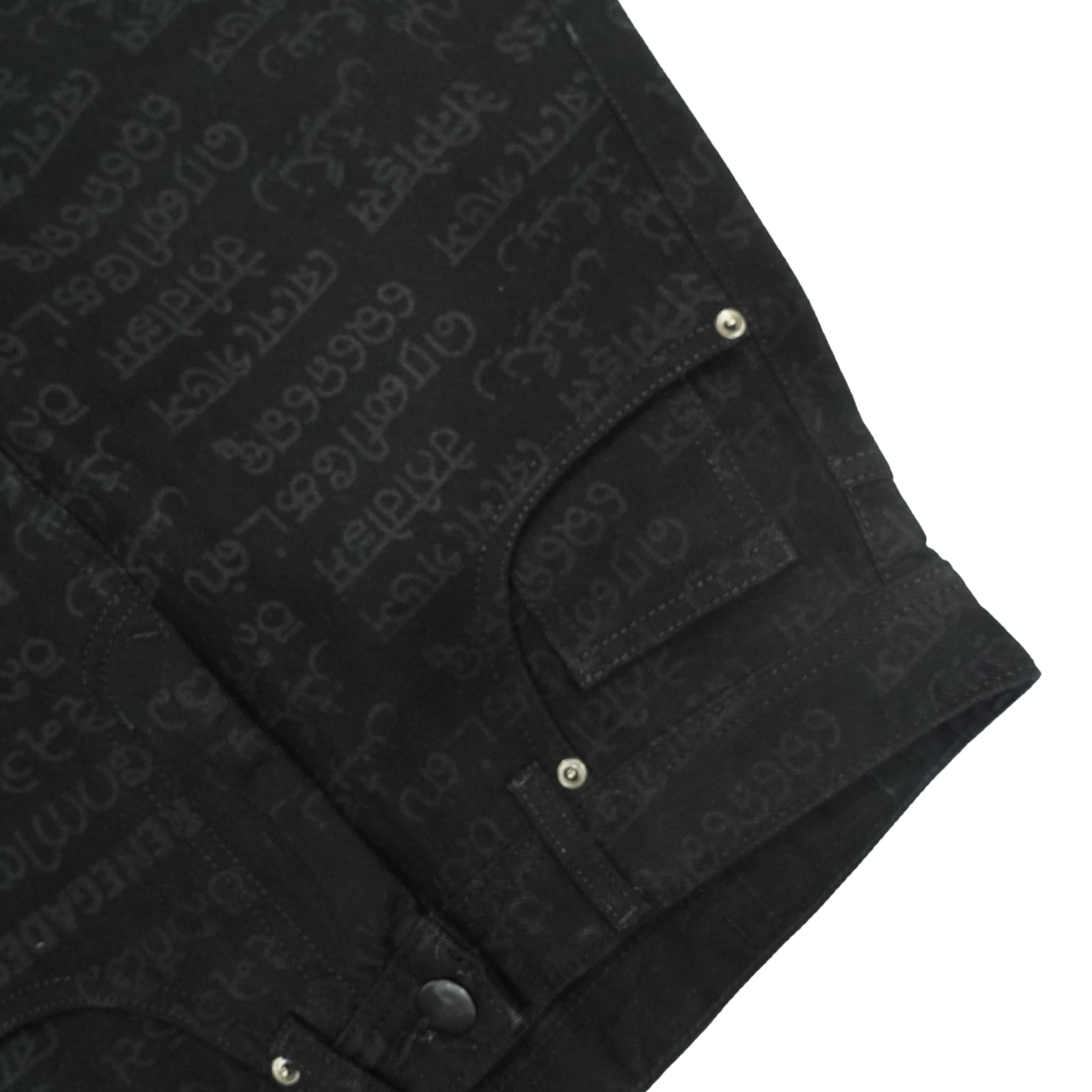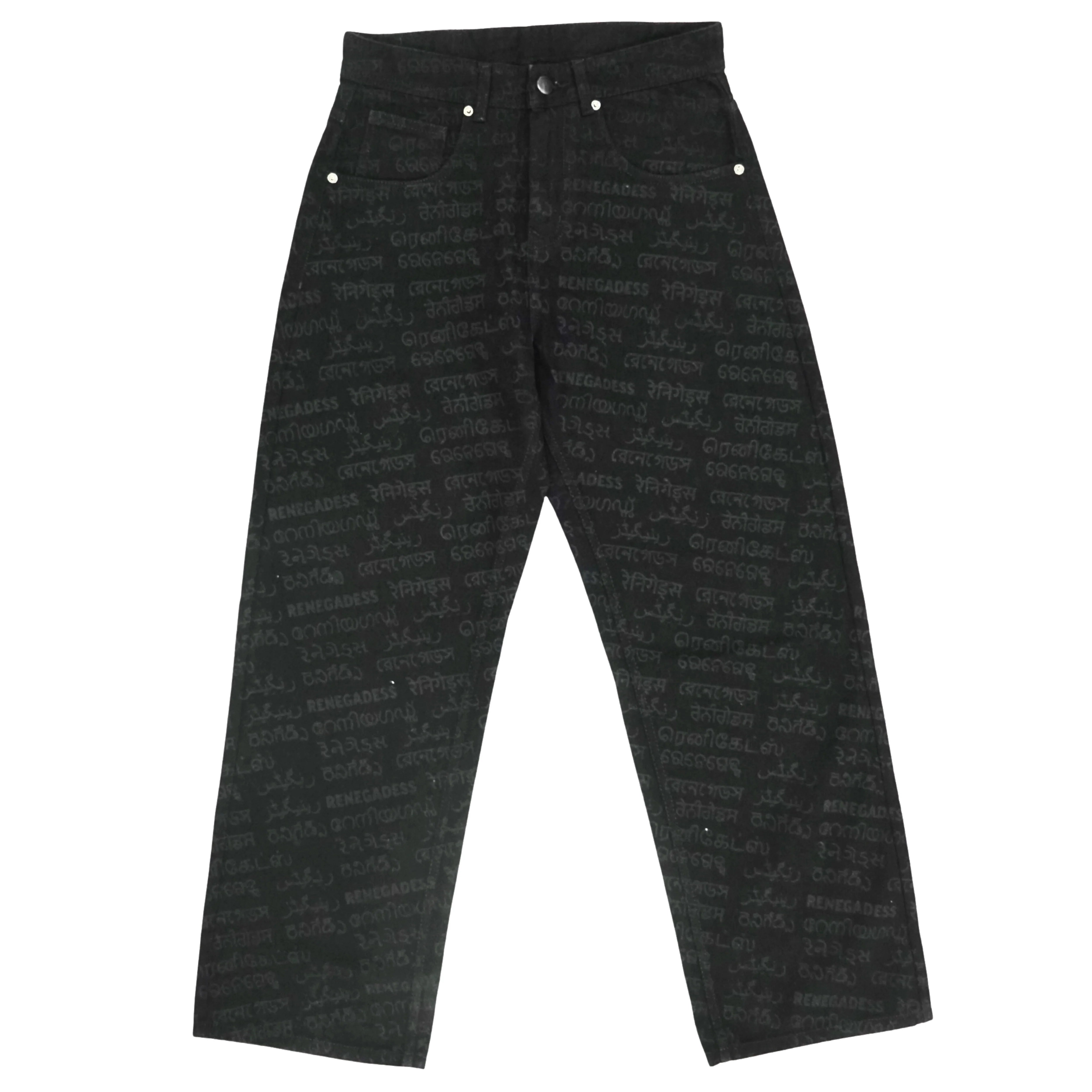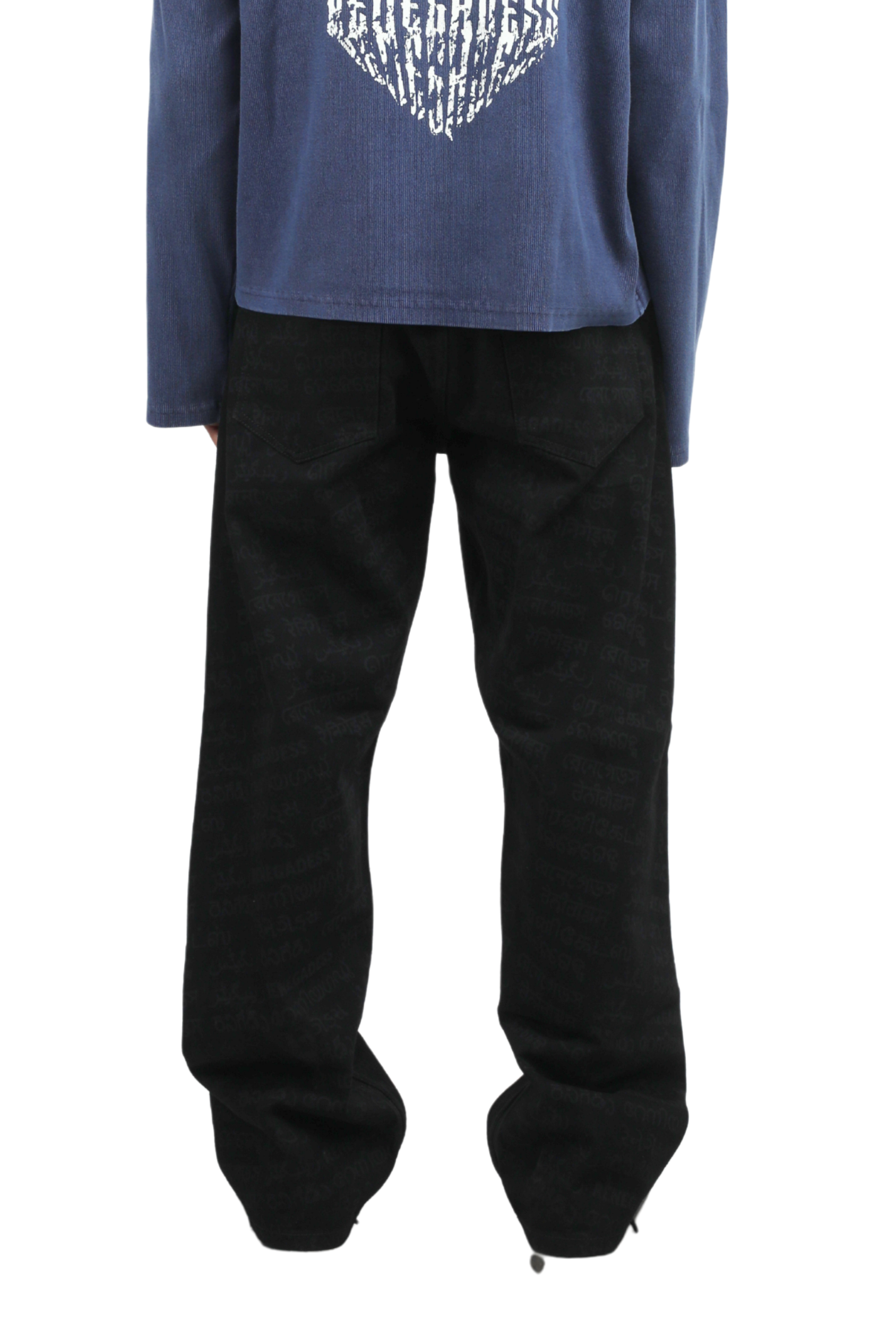 Baggy fit non-stretch jeans with laser print all over. With distress over the finished hem and pocket lining on both front and back. YKK fly zipper. Limited to only 50 pieces.