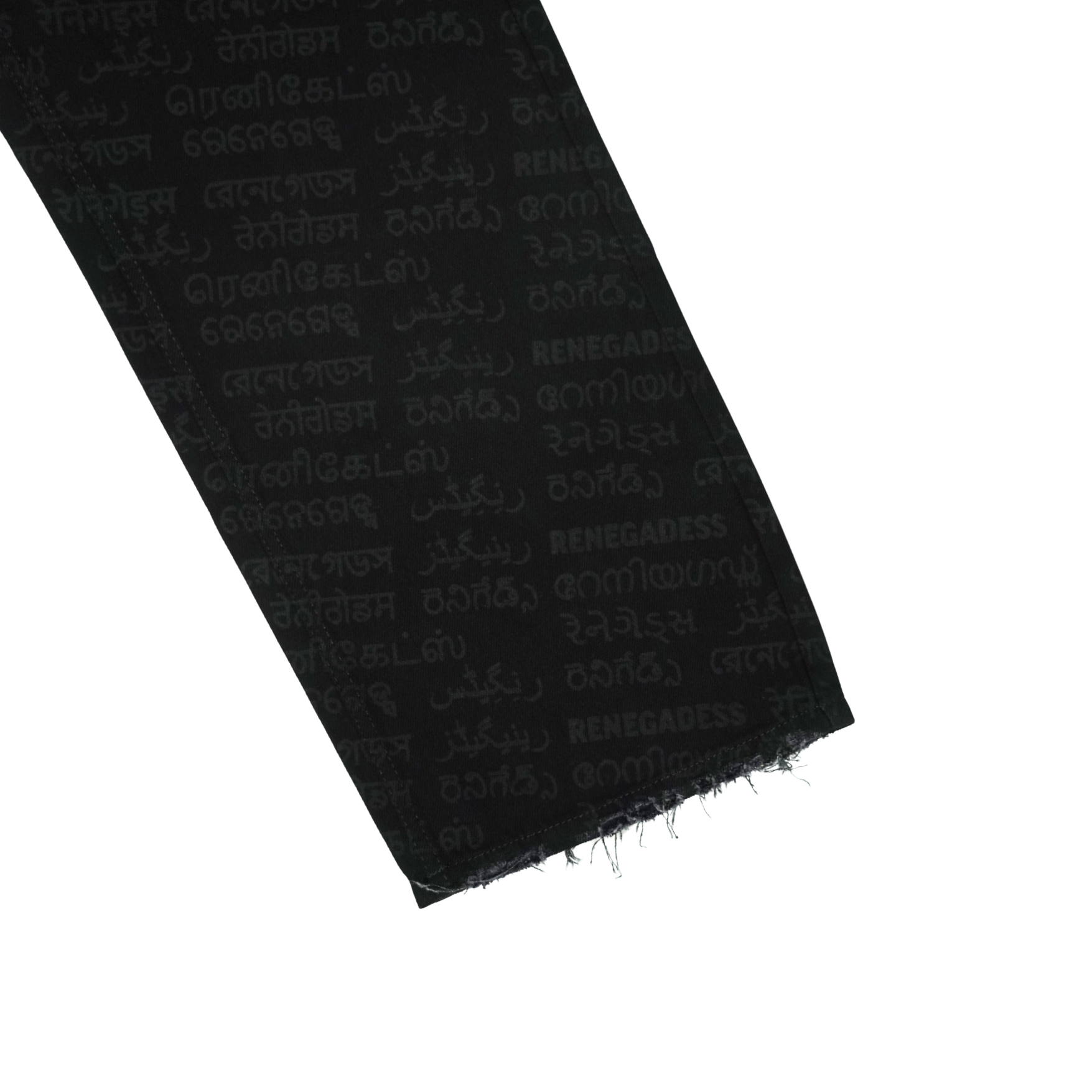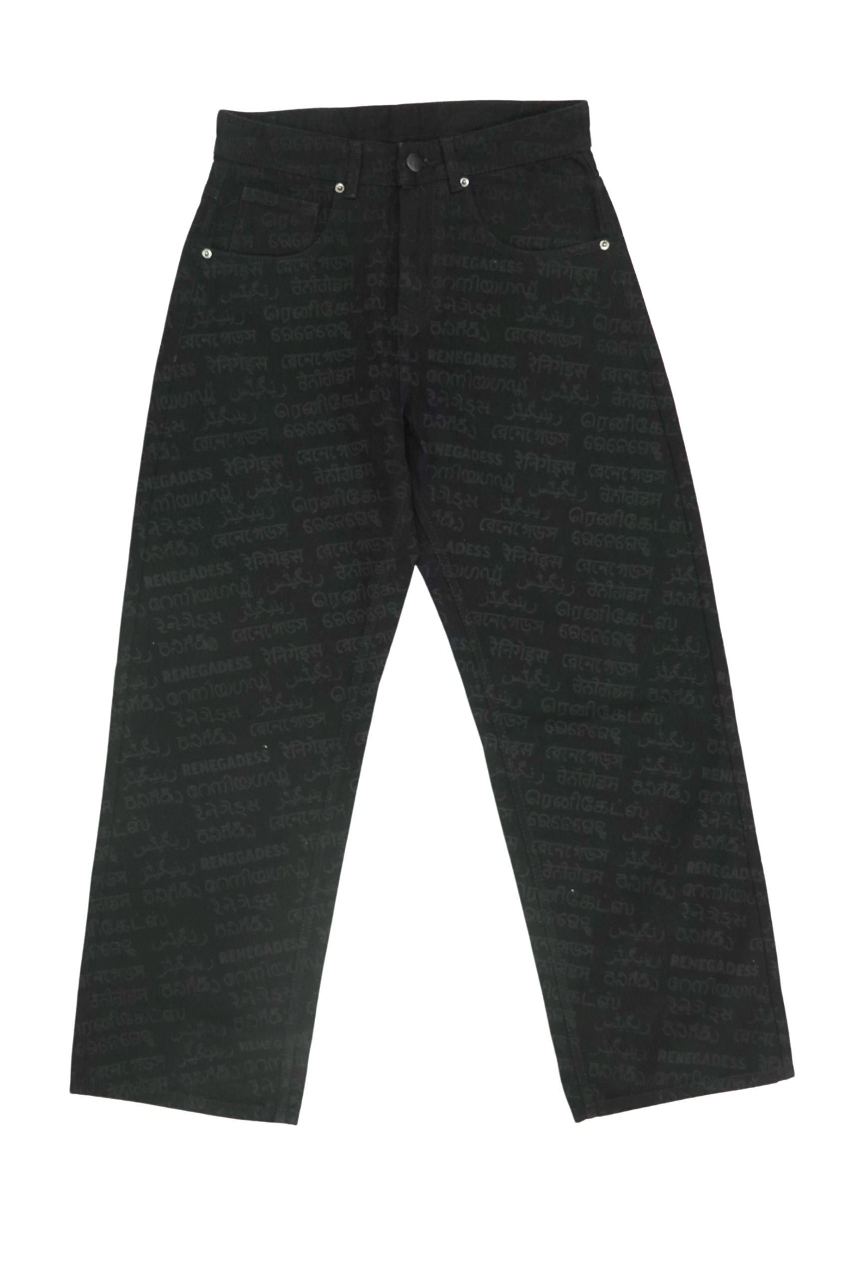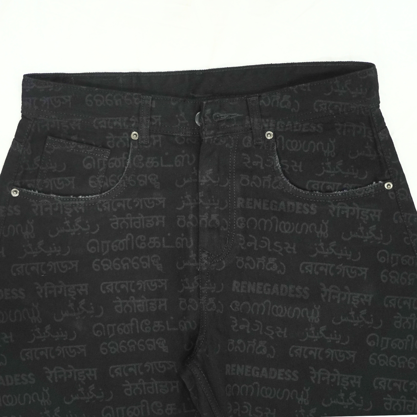 Baggy fit non-stretch jeans with laser print all over. With distress over the finished hem and pocket lining on both front and back. YKK fly zipper. Limited to only 50 pieces.