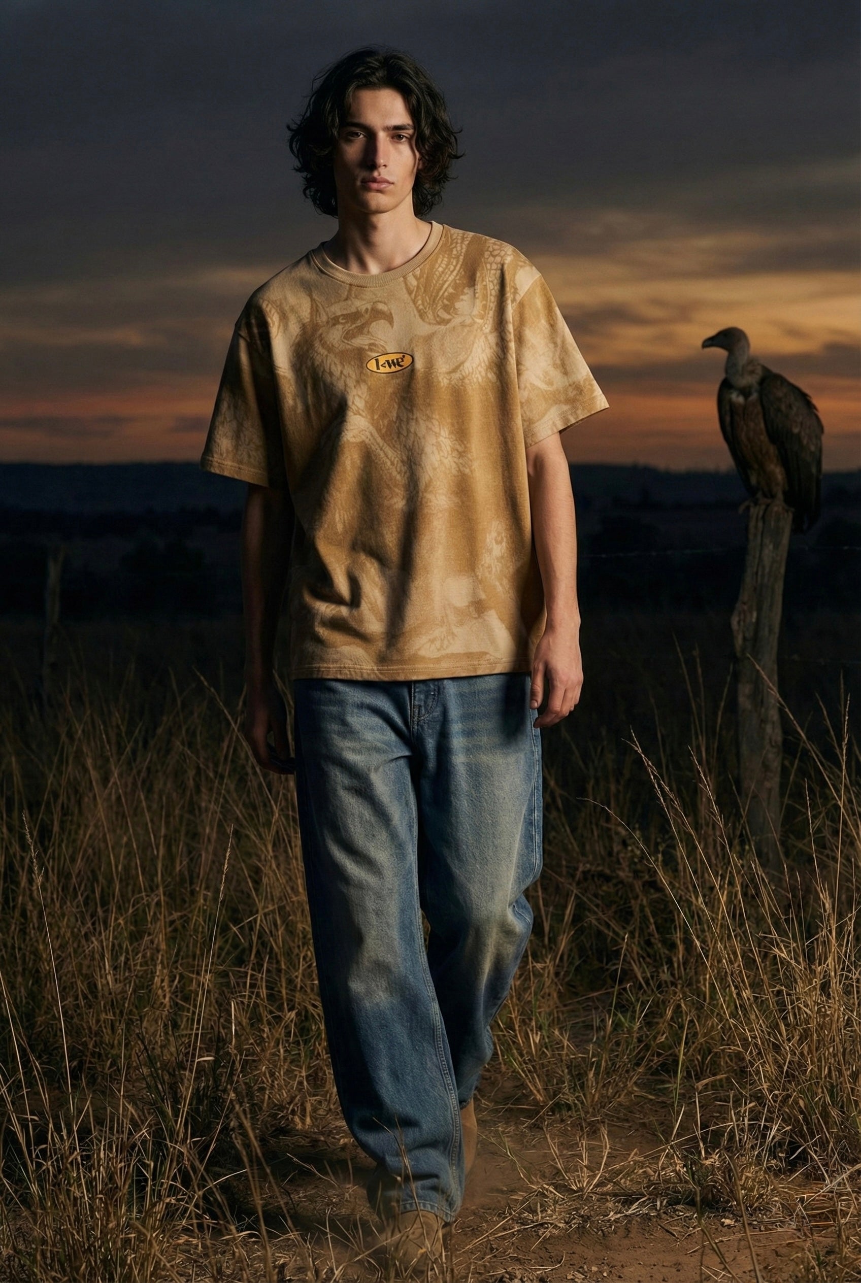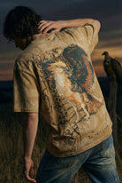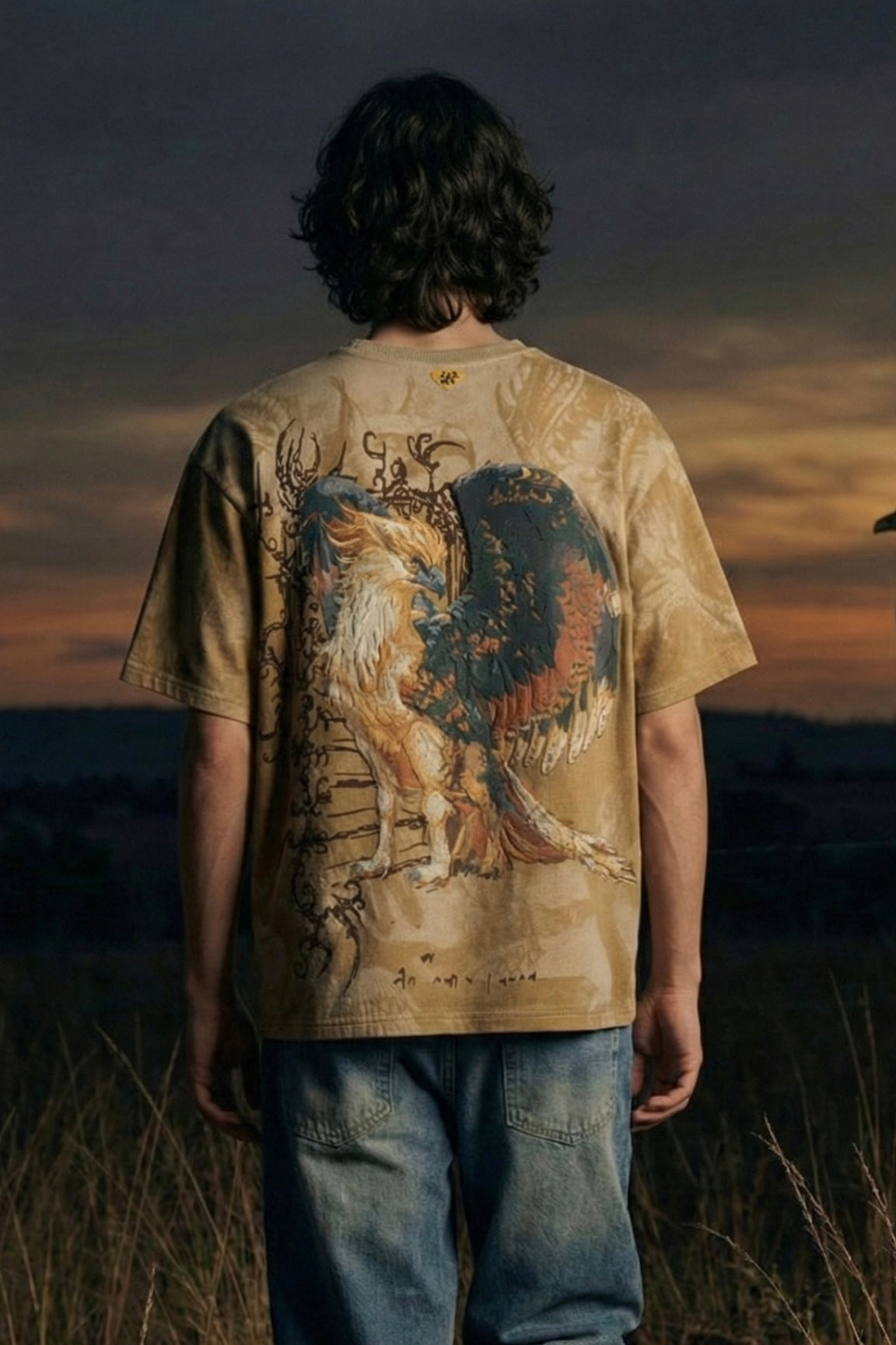 power of legends with the Griffin Tee, a masterfully crafted screen-printed piece that blends fine detail with bold design. The background sets the stage with an abstract duel print, while the foreground showcases a strikingly detailed Griffin—symbol of strength, courage, and guardianship.