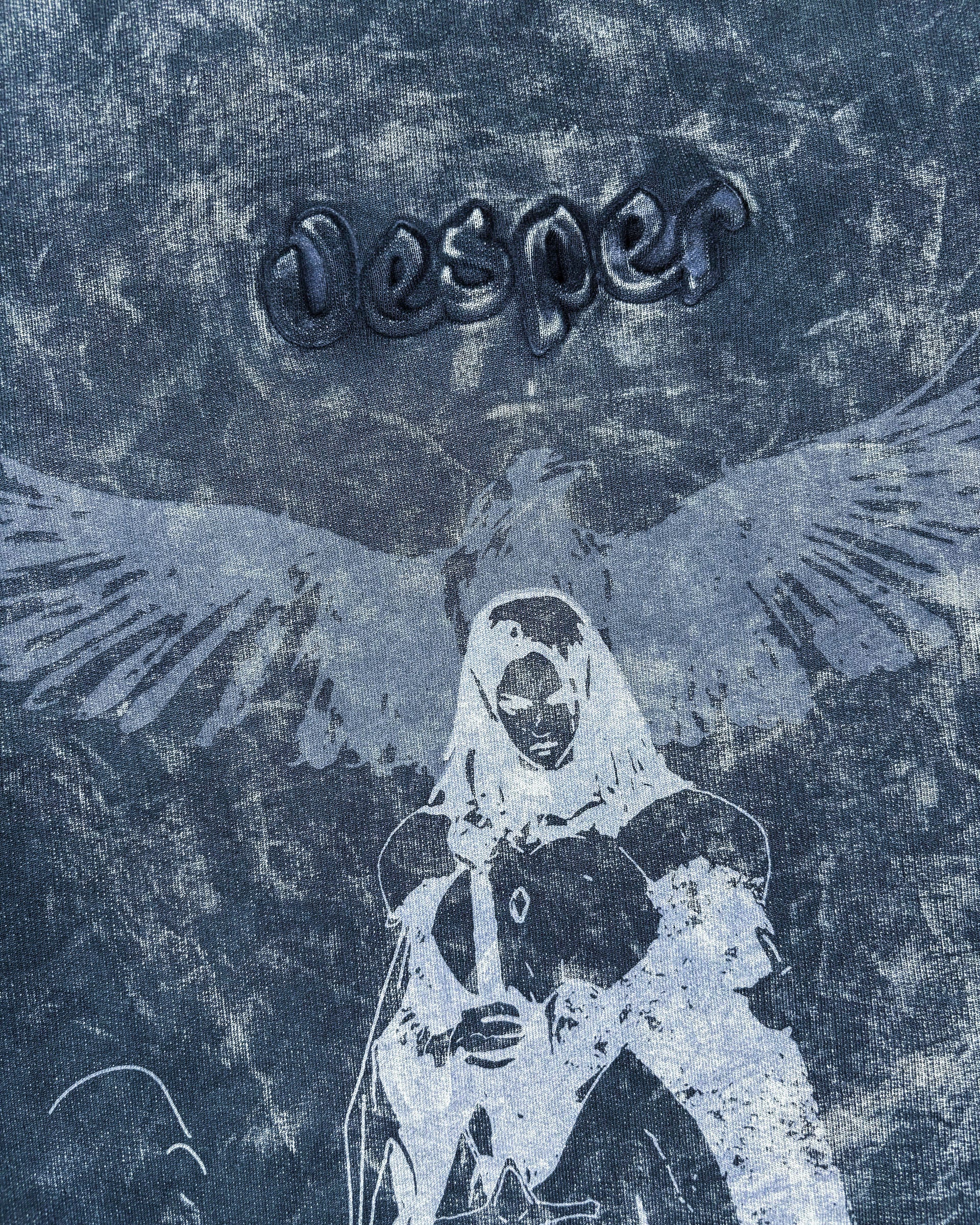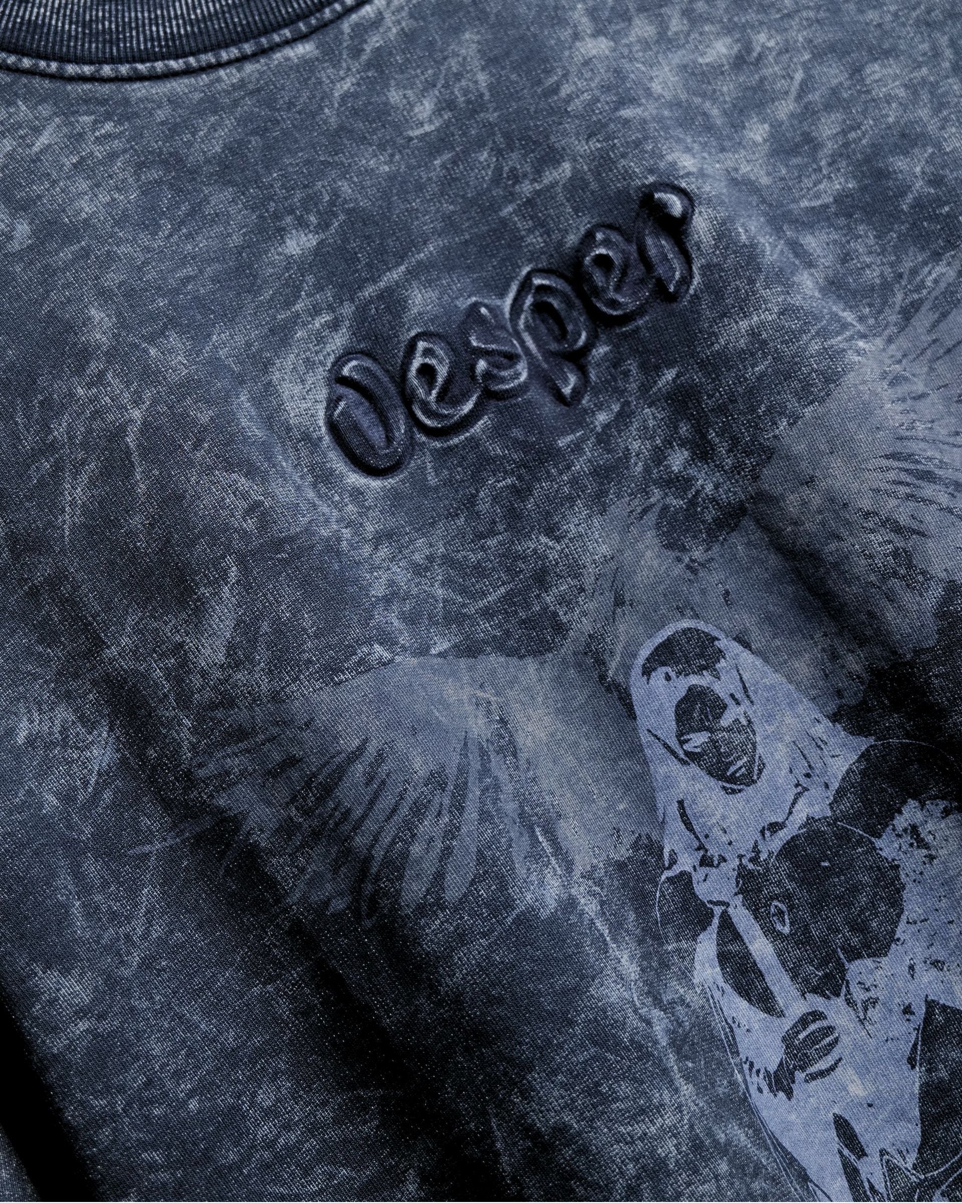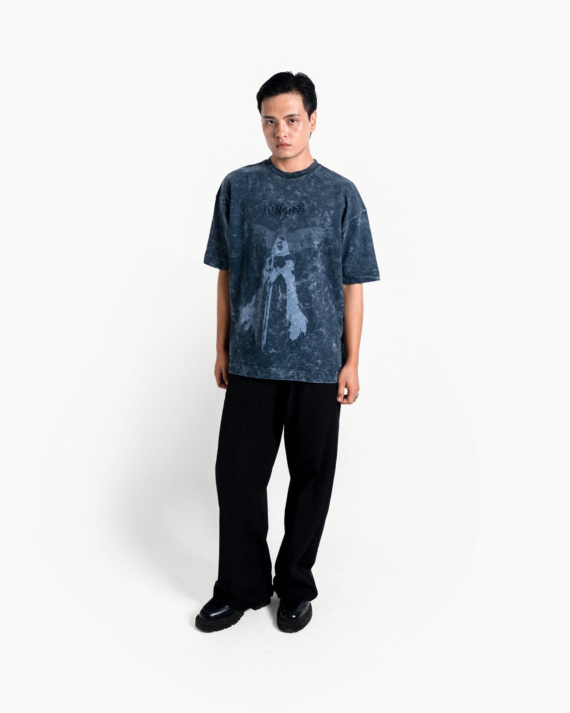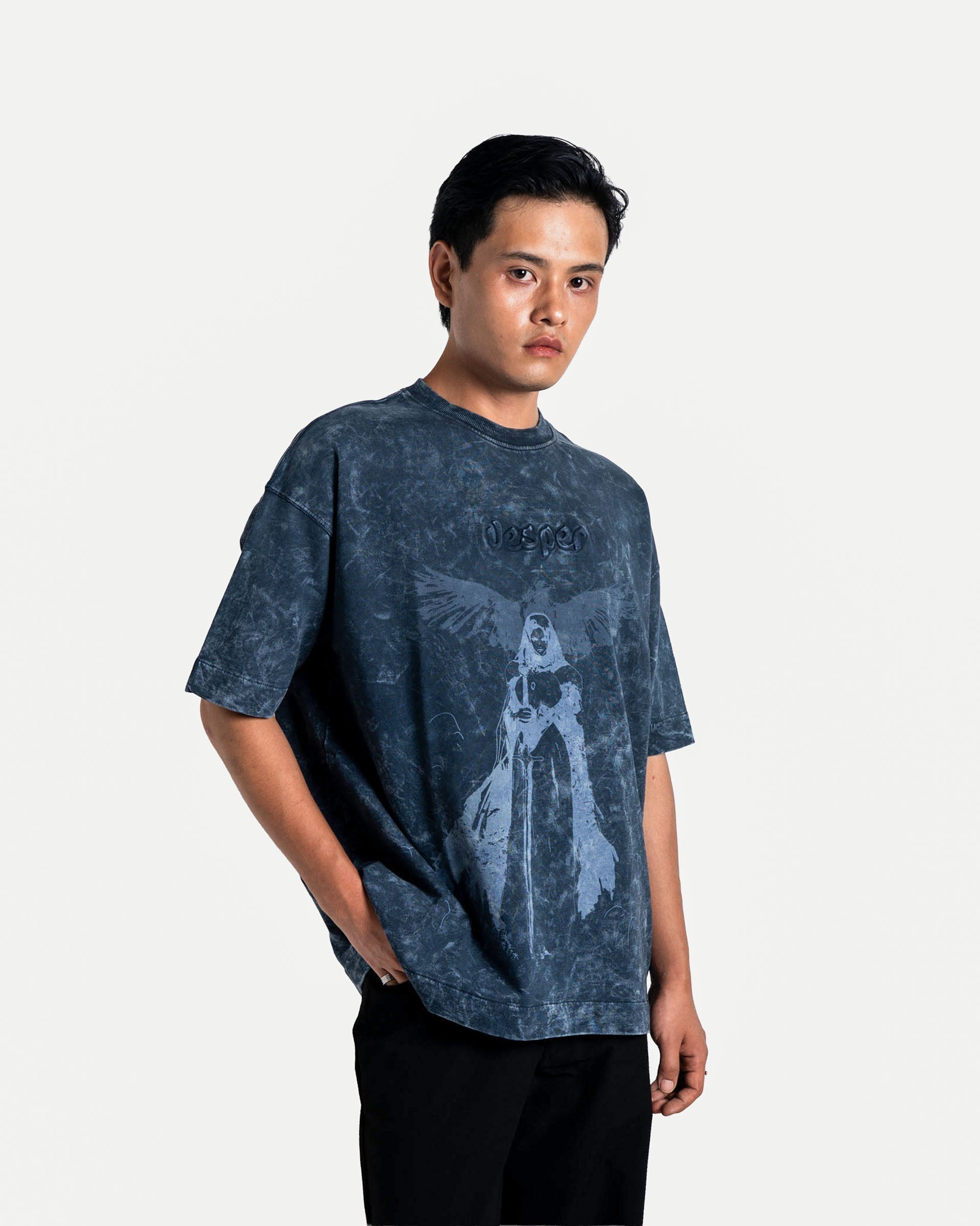 The artwork features a divine figure in prayer, wings spread as if echoing chants into the dusk. Subtle yet commanding, the faded print merges seamlessly with the garment’s washed finish, creating a design that feels both timeless and ethereal.