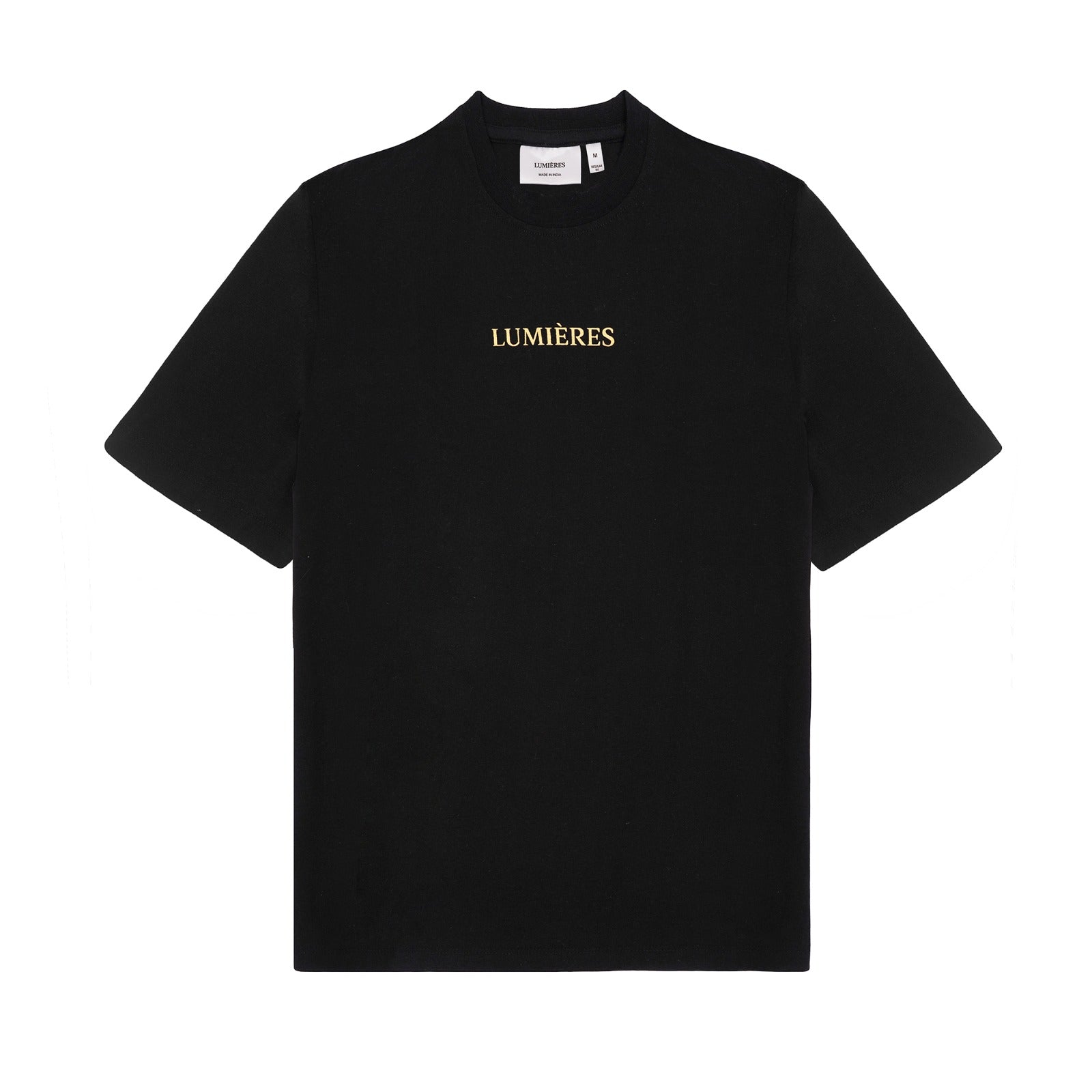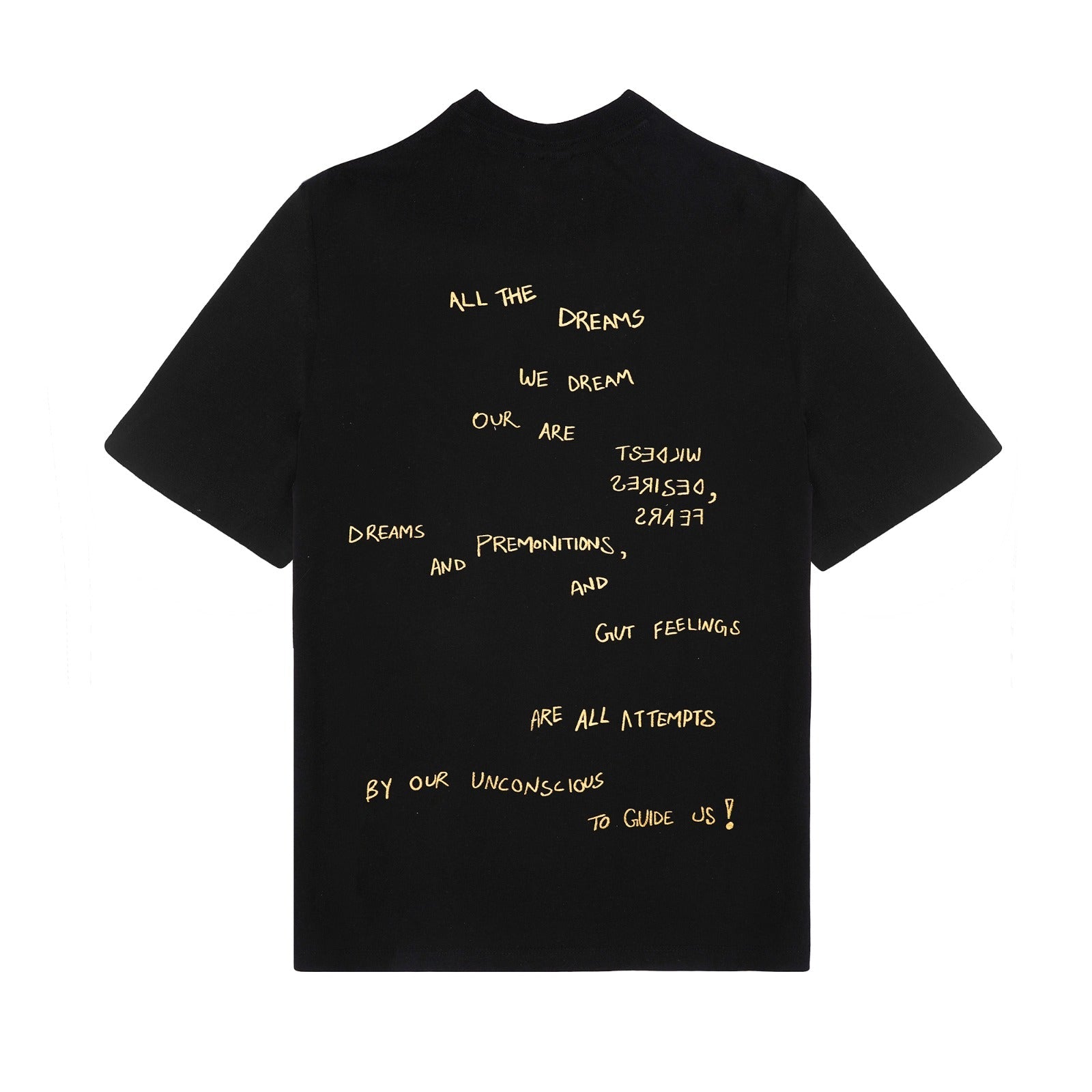 Unisex Black Regular Fit T-Shirt with crewneck and fitted sleeves. Golden Brand logo printed at Front and Golden text printed at Back. This design delves around the subconscious.