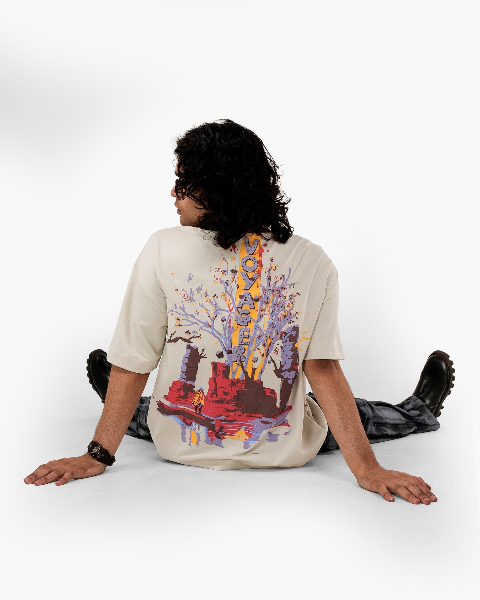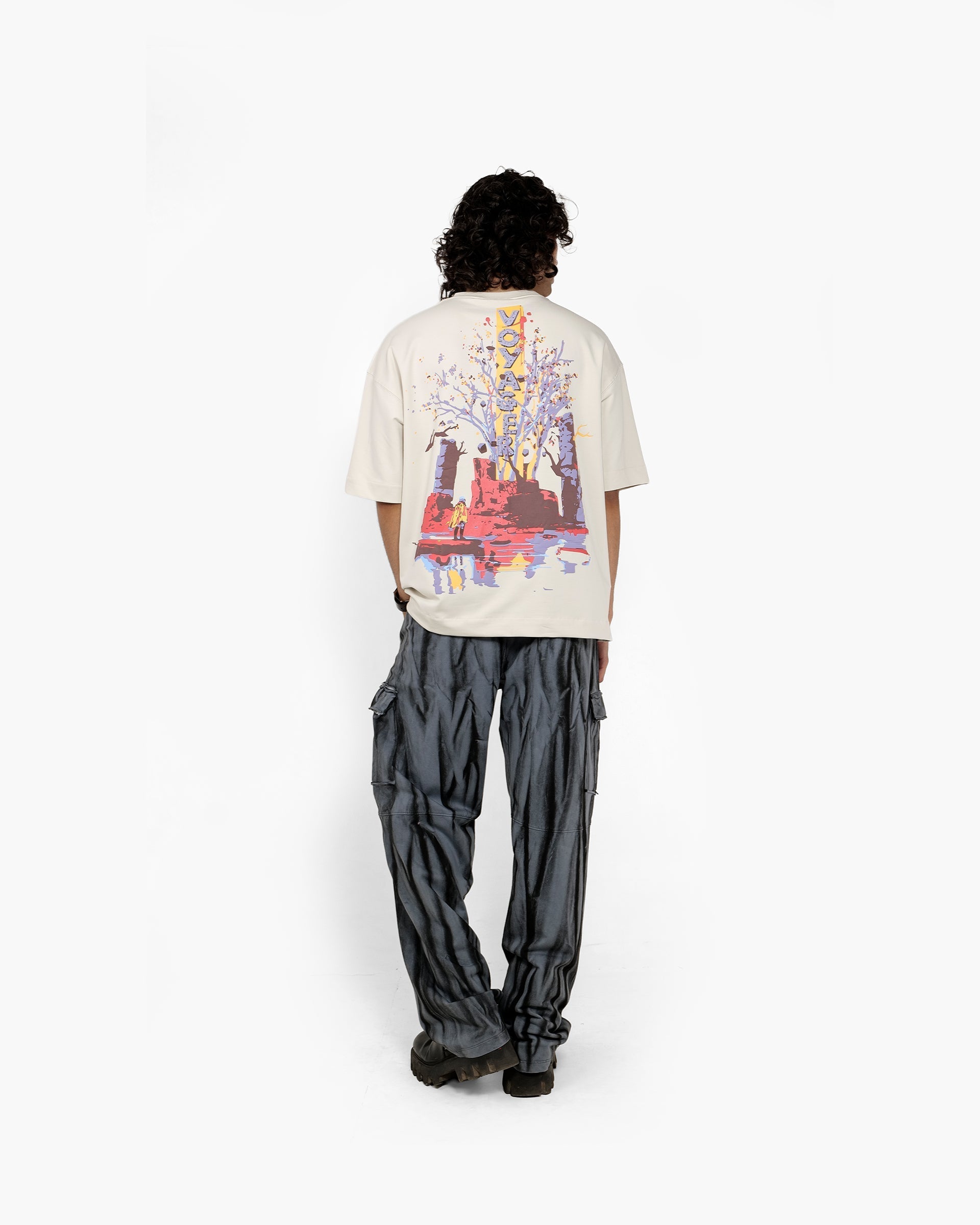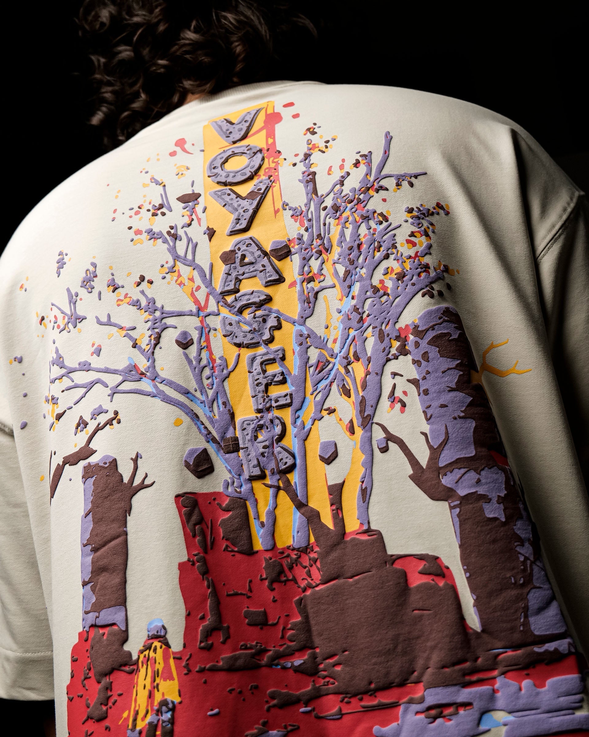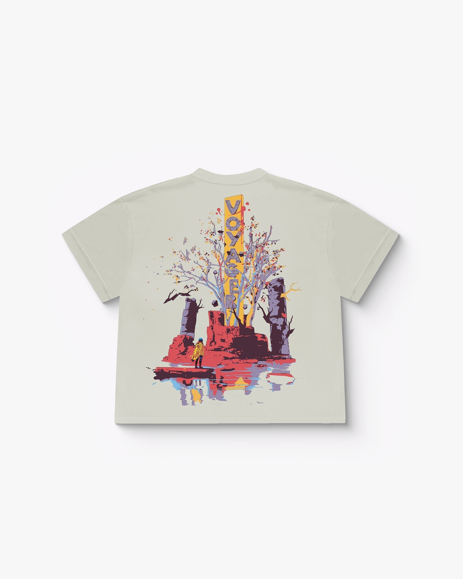 Premium oversized unisex T-shirt crafted from Cotton Spandex Terry Looper. This piece showcases a bold and immersive back graphic that blends post-apocalyptic ruins with surreal nature, where a lone explorer in a yellow coat gazes up at a towering tree springing from red rock. The vivid 3D puff print brings texture and life to every detail—from the purple trees and golden-yellow trunk to the striking vertical “VOYAGER” monolith rising through the center.
