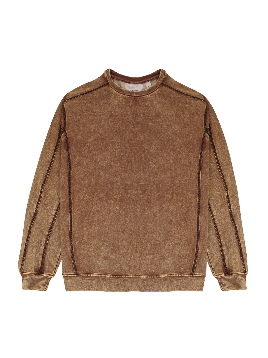 Washed vintage brown, contrast-stitch detail unisex sweatshirt for a lived in, vintage character. Made with our signature fabric, certified heavyweight Indigo Knit yarn for enhanced durability, stretch and airflow, making it style-forward yet functional. Compact crewneck and long sleeves. Ideal for cold outdoor weather, layering preferred.