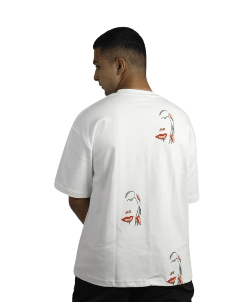 Embrace bold creativity with the White Face Flower Oversized T-Shirt. Featuring an artistic face and floral design, this tee beautifully blends minimalism with striking artistry. Perfect for those who want to add a unique, expressive touch to their everyday wardrobe.