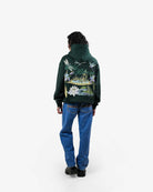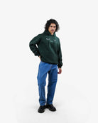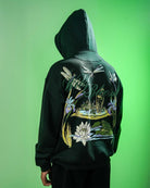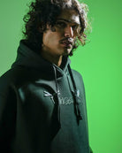 The Wild Bloom Hoodie is crafted from soft yet structured 400 GSM Cotton 3-Thread Fleece, giving it a warm, premium feel. The double silicone finish enhances smoothness, making the bottle-green fabric rich, refined, and elevated.