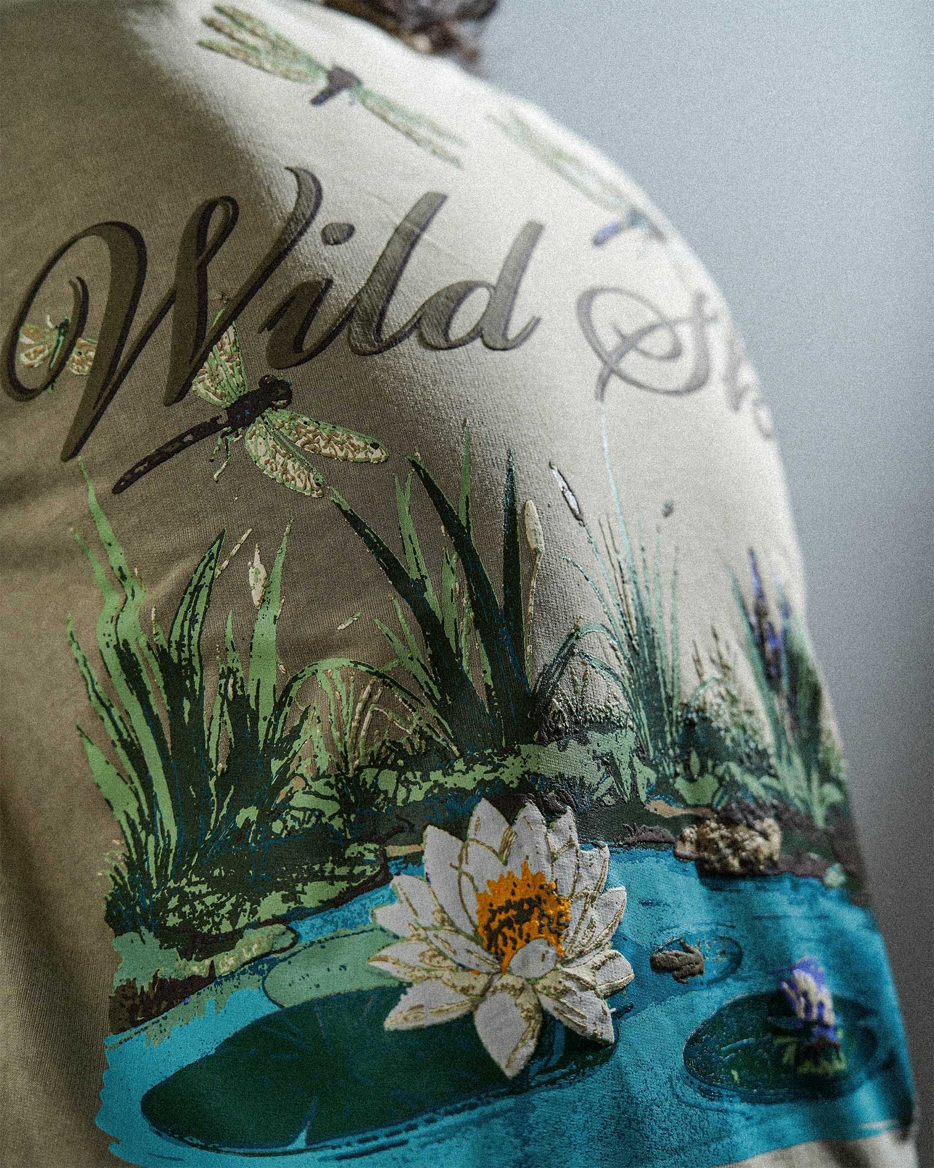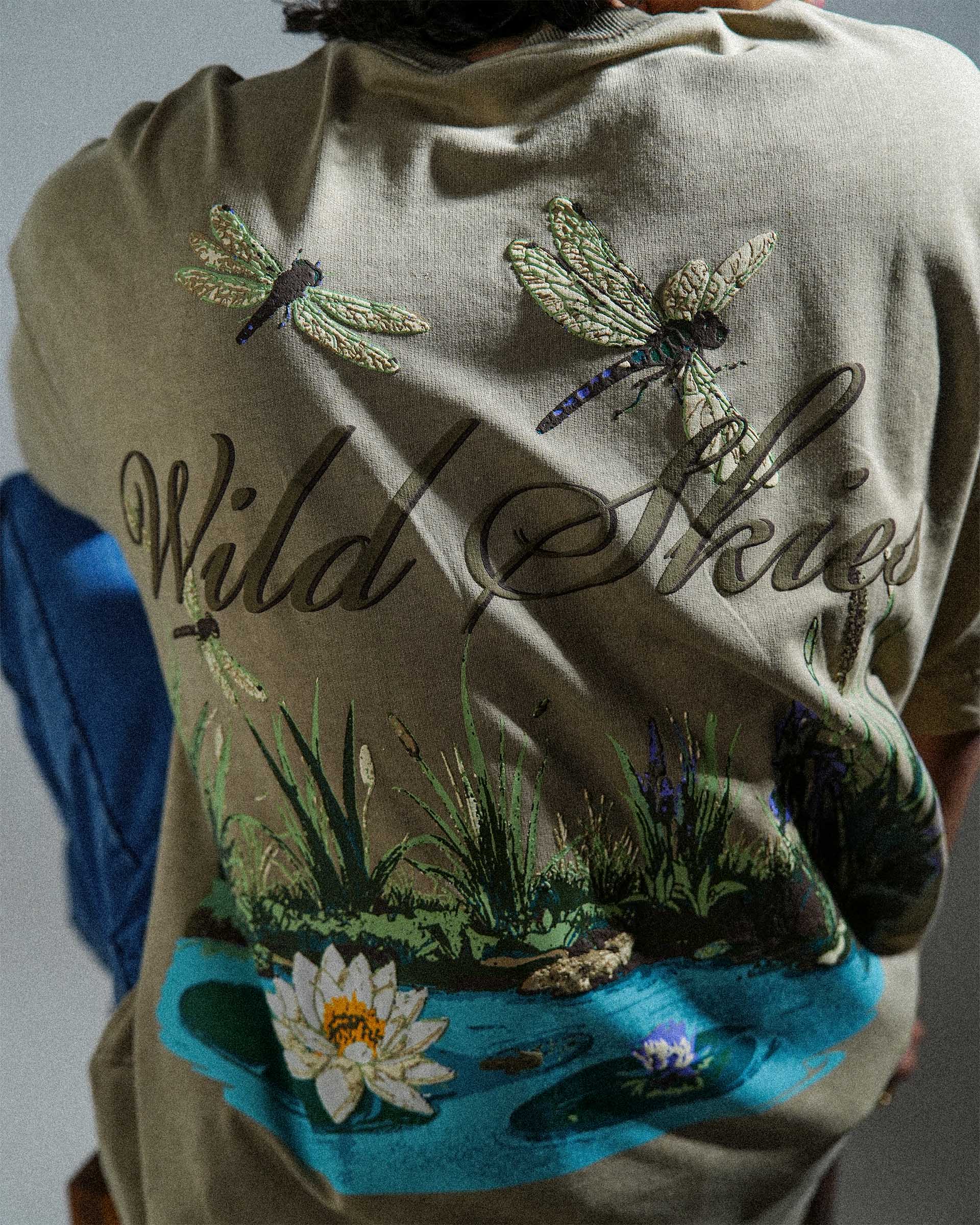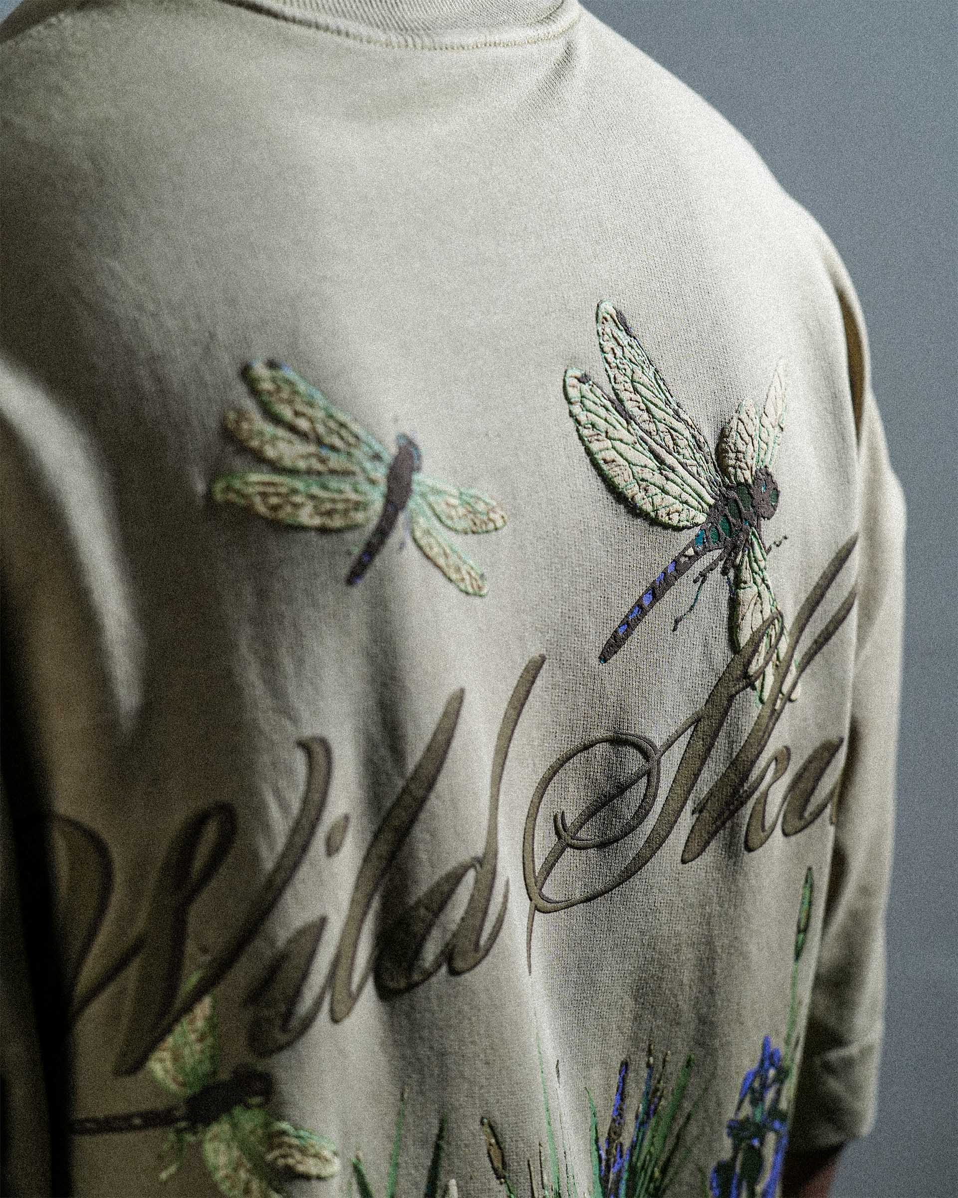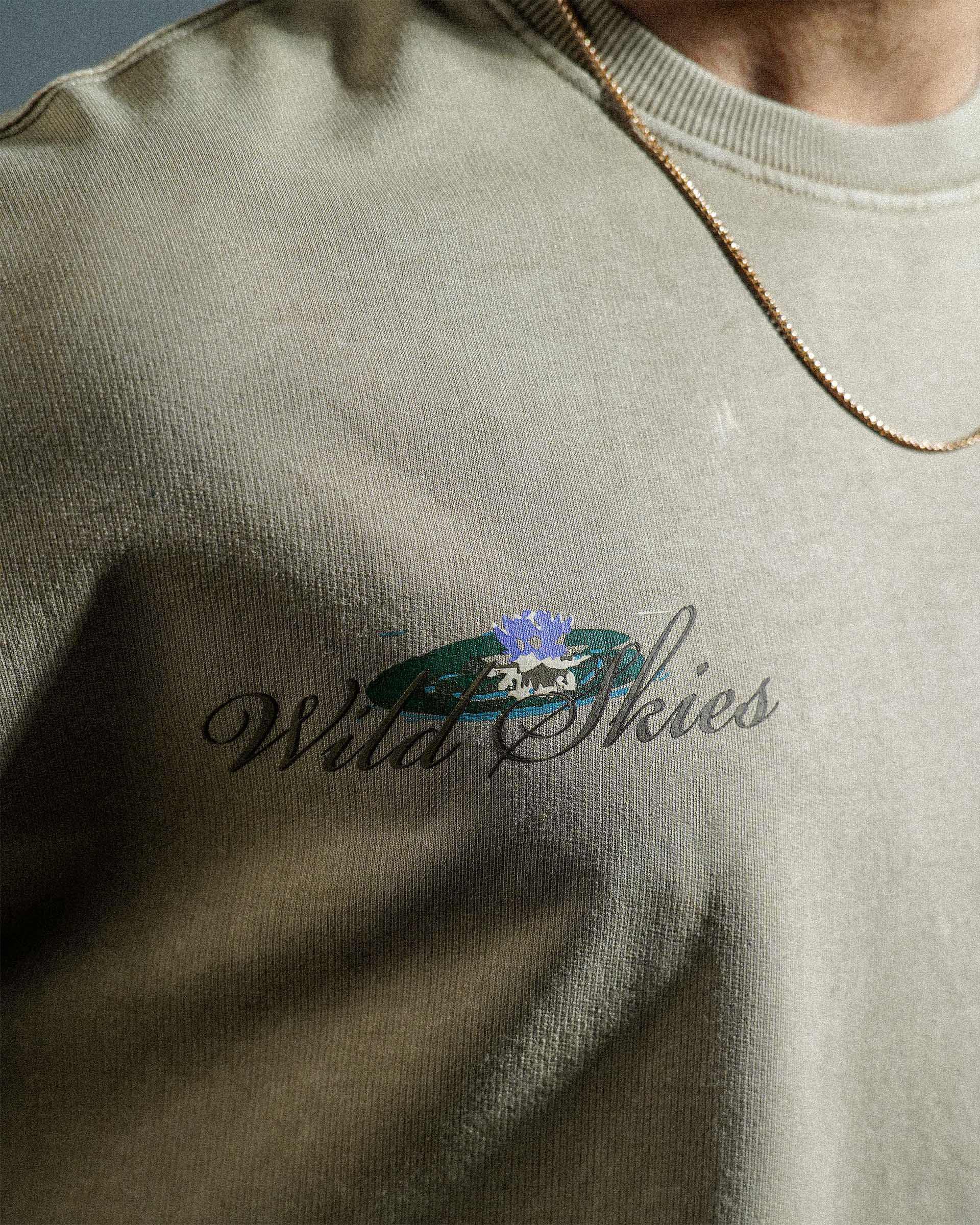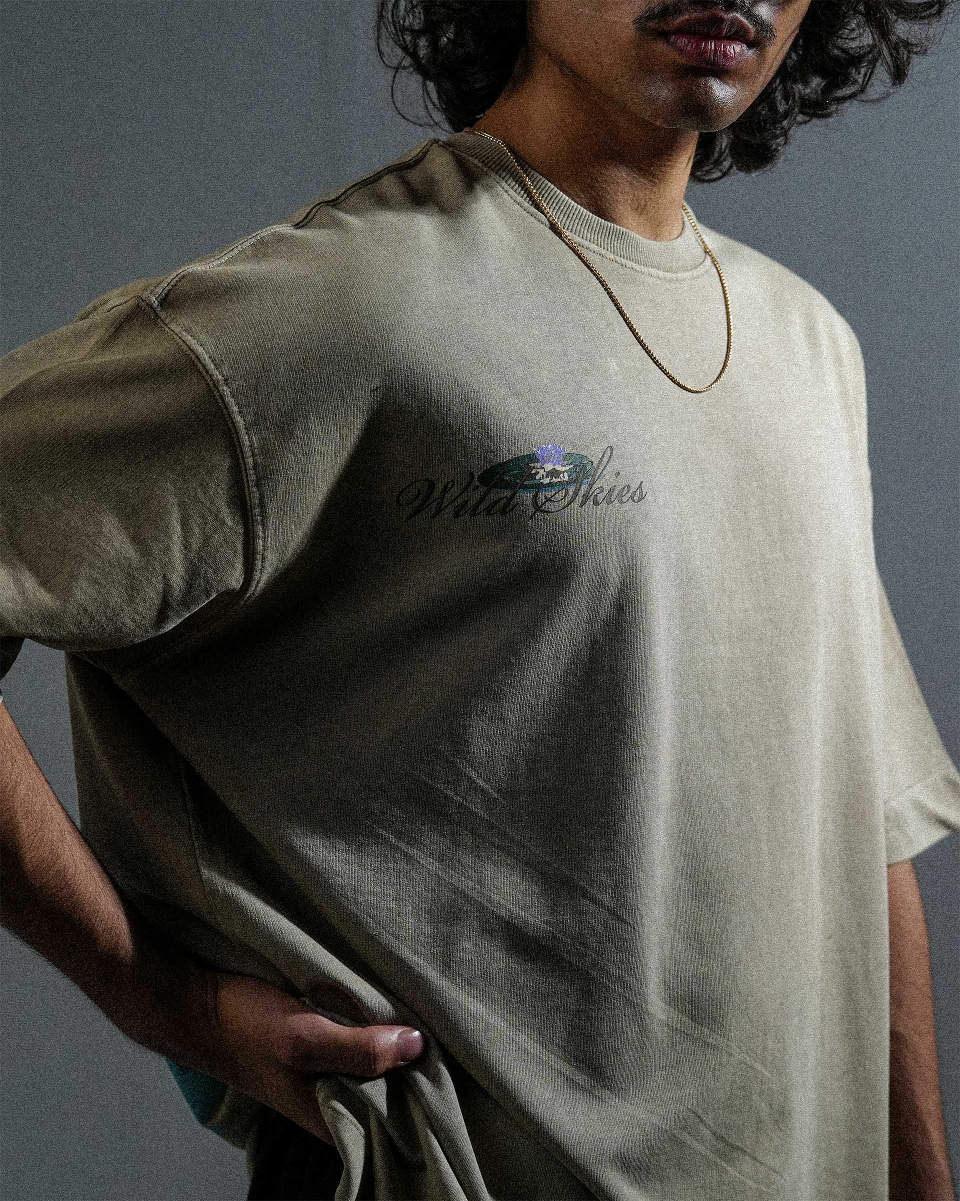 The Wild Skies Tee is crafted from soft, breathable 240 GSM 100% Cotton Loop Terry, giving it a relaxed yet premium structure. Finished in a subtle faded pigment wash, it carries a clean, sun-softened look. Designed in an oversized cropped silhouette, the tee features bold heavy puff prints on both the front and back for strong texture and visual impact. A heavy 2x1 ribbed neckline adds durability and balance to the silhouette, making this piece a standout essential.
