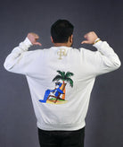 Add effortless style to your winter wardrobe with this cozy off-white oversized sweatshirt. Crafted from premium 350 GSM premium terry cotton, it offers exceptional warmth and durability for the colder months. The front features the “RARE THREADS” logo in bold puff screen print, while the back showcases a vibrant graphic of a relaxed character lounging under a palm tree, exuding laid-back beach vibes. With its oversized fit and ribbed cuffs and hem, this sweatshirt is perfect for streetwear enthusiasts who value comfort and statement designs.