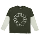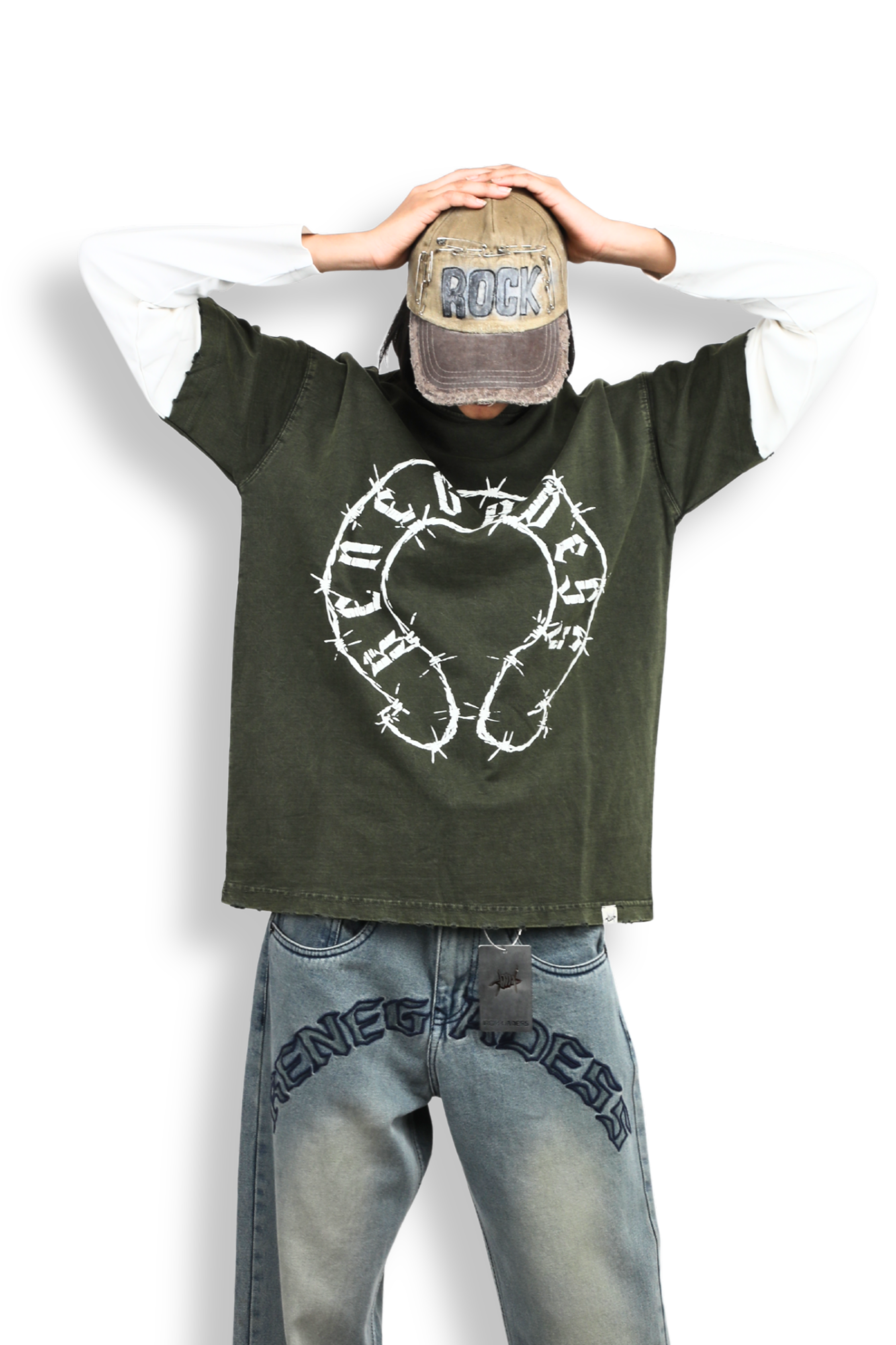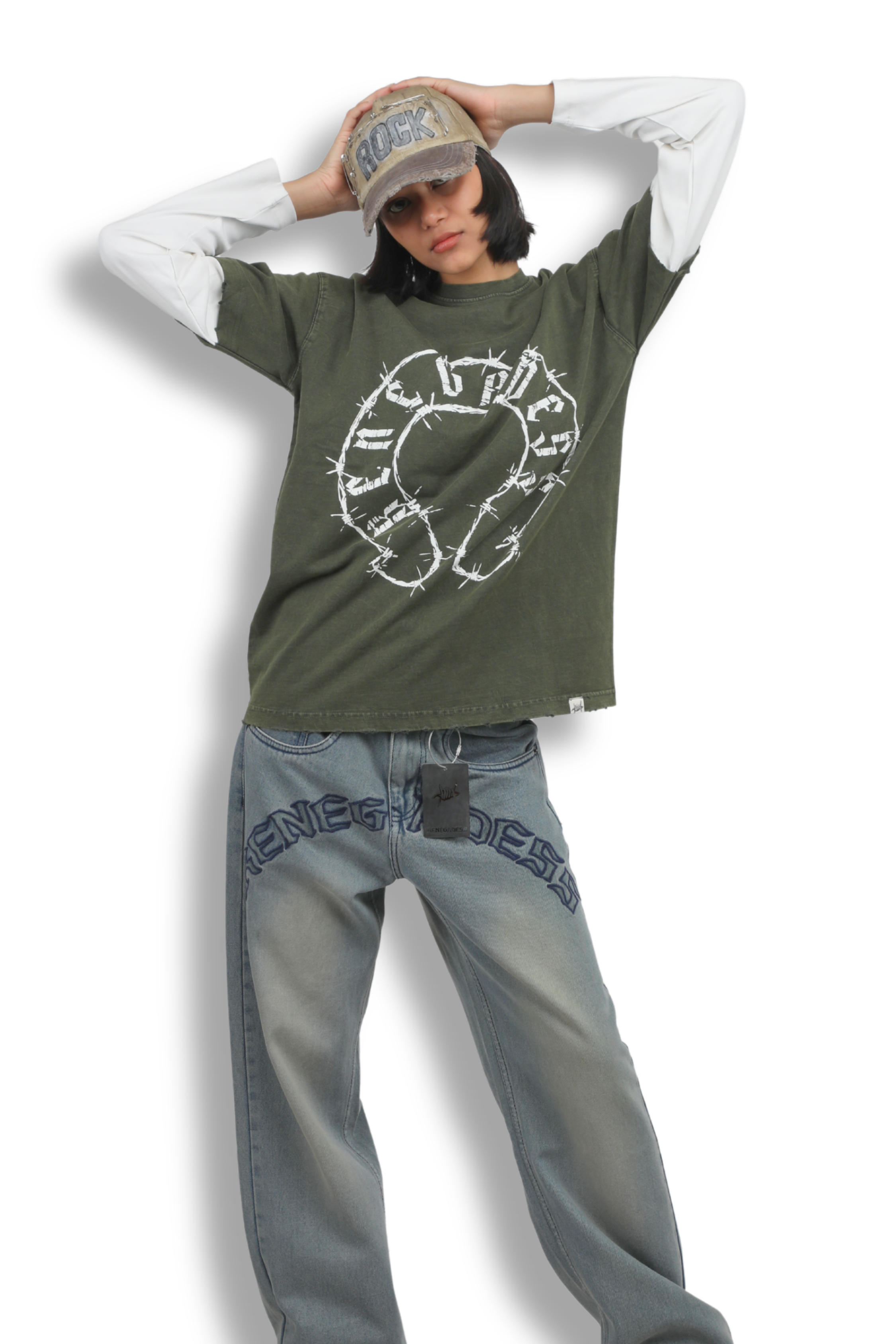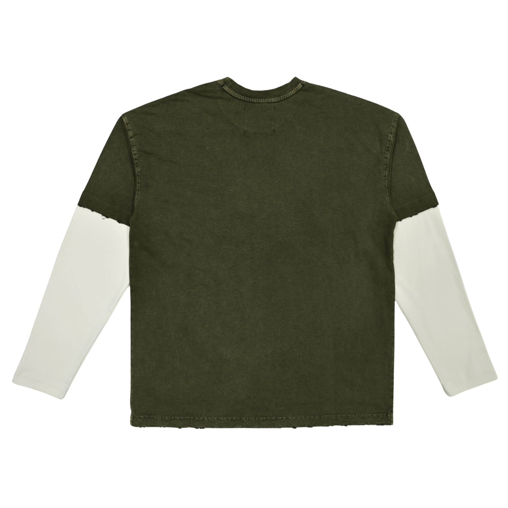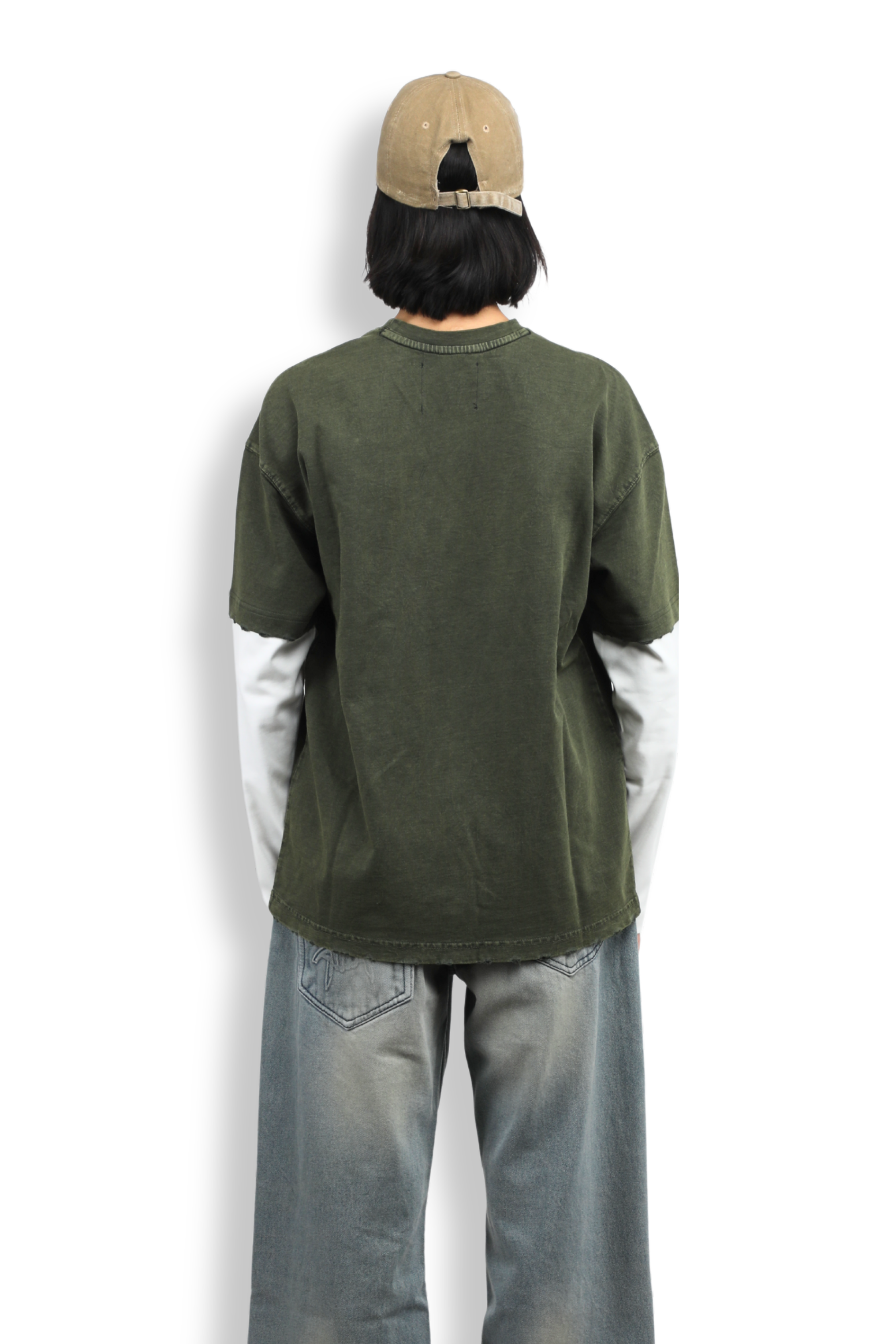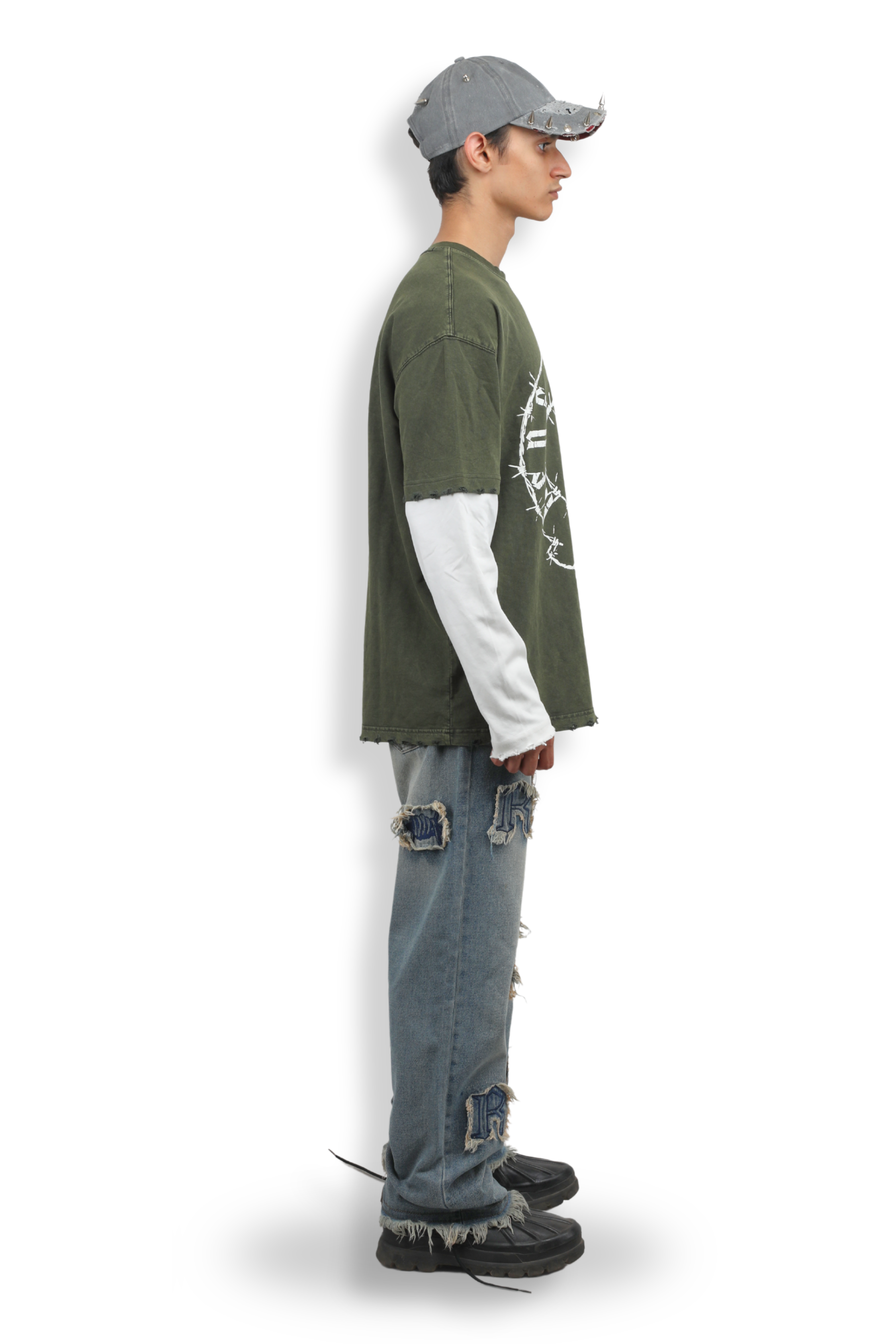 Oversized fit round neck t-shirt with add on full sleeves. Over-dyed with acid-washed treatment. Printed on the front panel. Distressed cuffs, bottom hem. Limited to only 50 pieces.