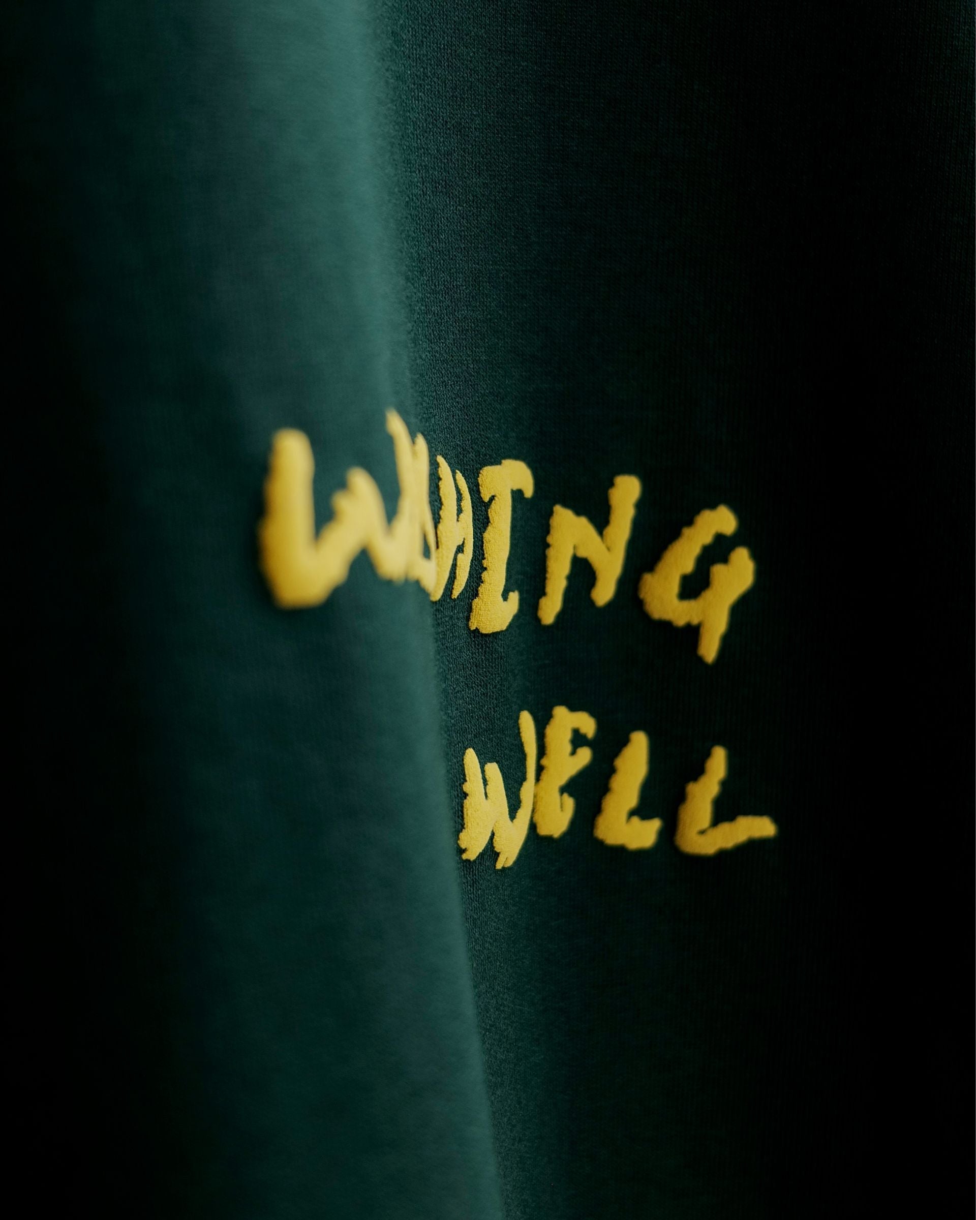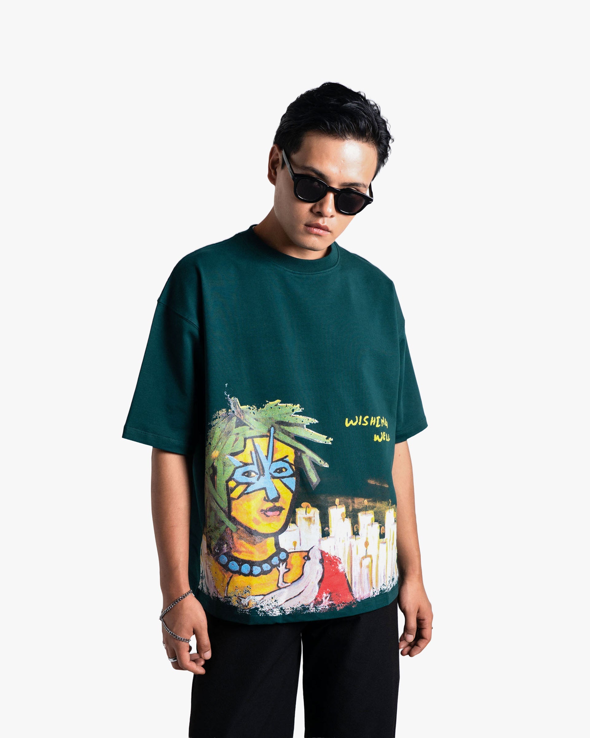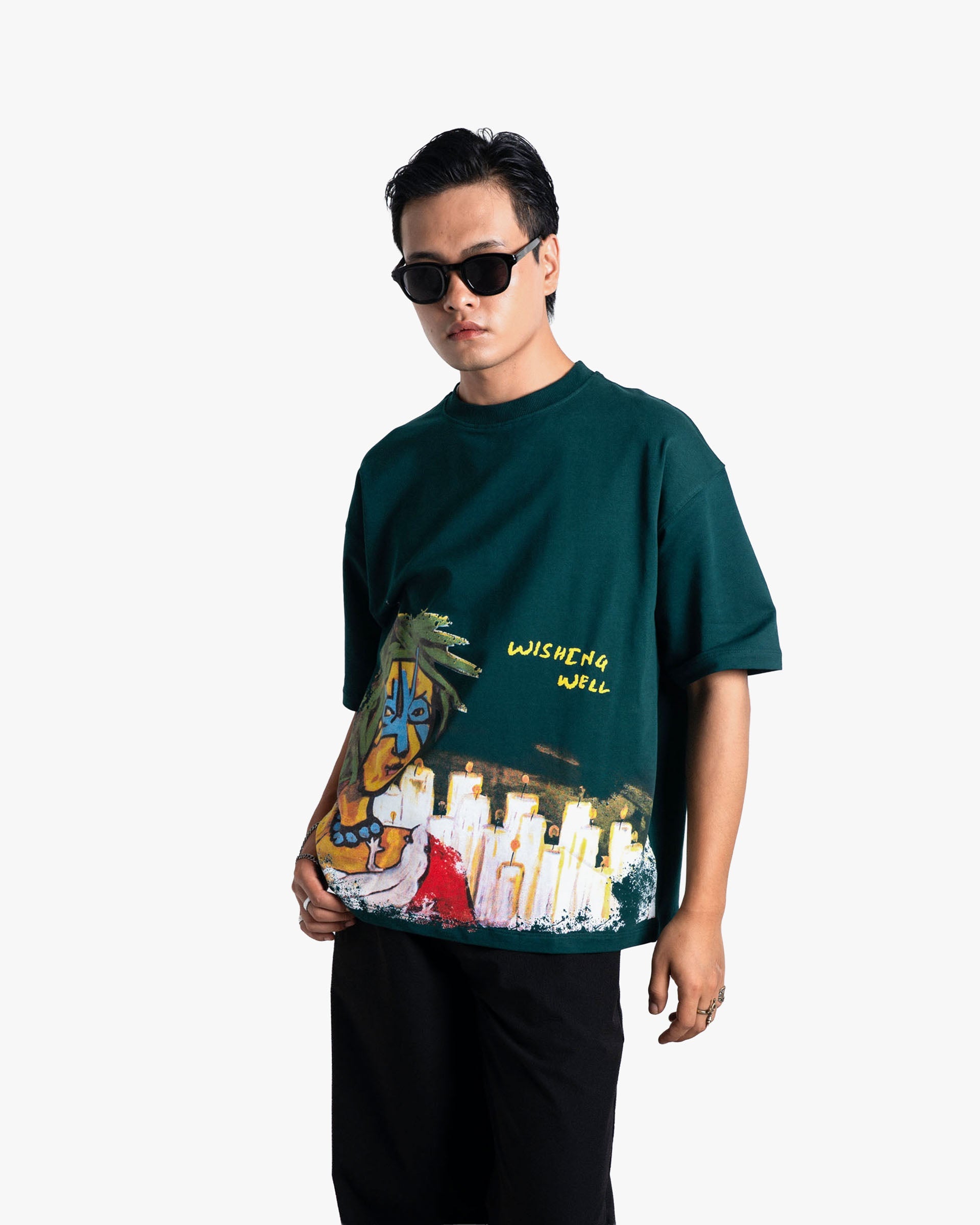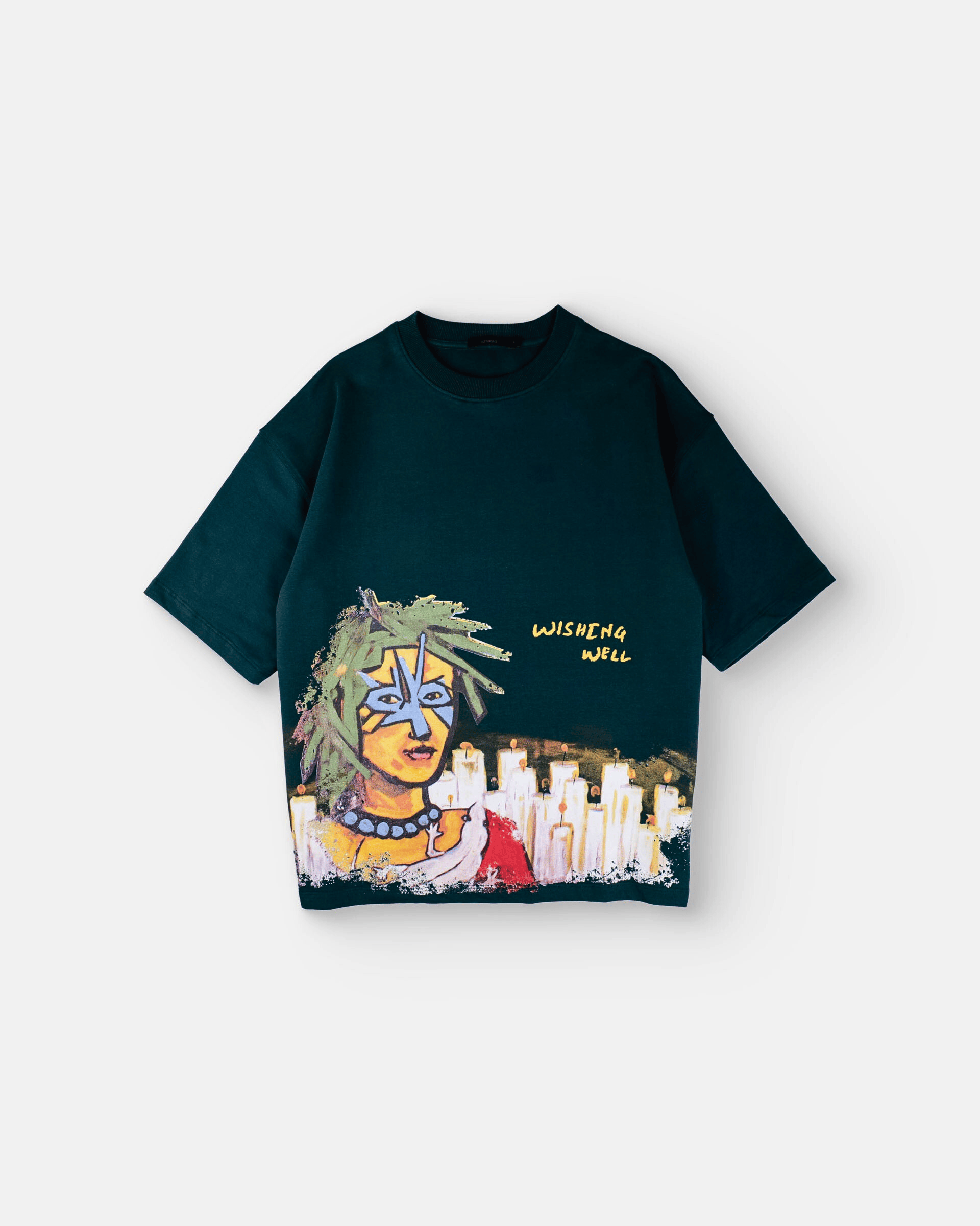 Wishing Well T-shirt, a premium oversized tee in a rich bottle green hue. Crafted from Cotton Spandex Terry Looper, this heavyweight 260 GSM piece delivers both structure and comfort. A double silicone wash gives it a smooth, buttery-soft texture and ensures a premium drape that feels as good as it looks.