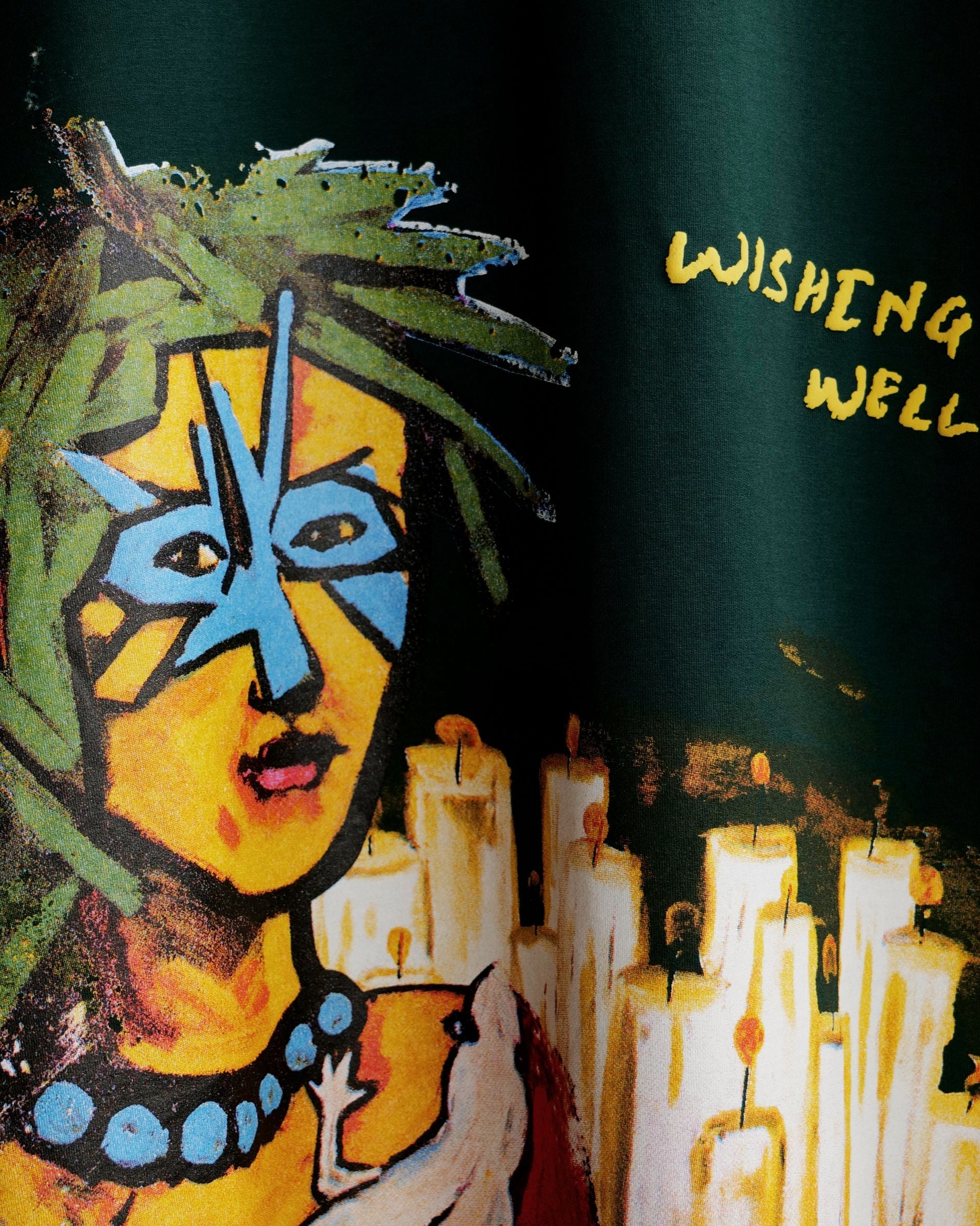 The bold front artwork features a striking, hand-painted style graphic with vibrant colors and expressive strokes. With the words “Wishing Well” subtly embedded into the design, it captures a raw, artistic energy—perfect for those who wear their individuality with pride.