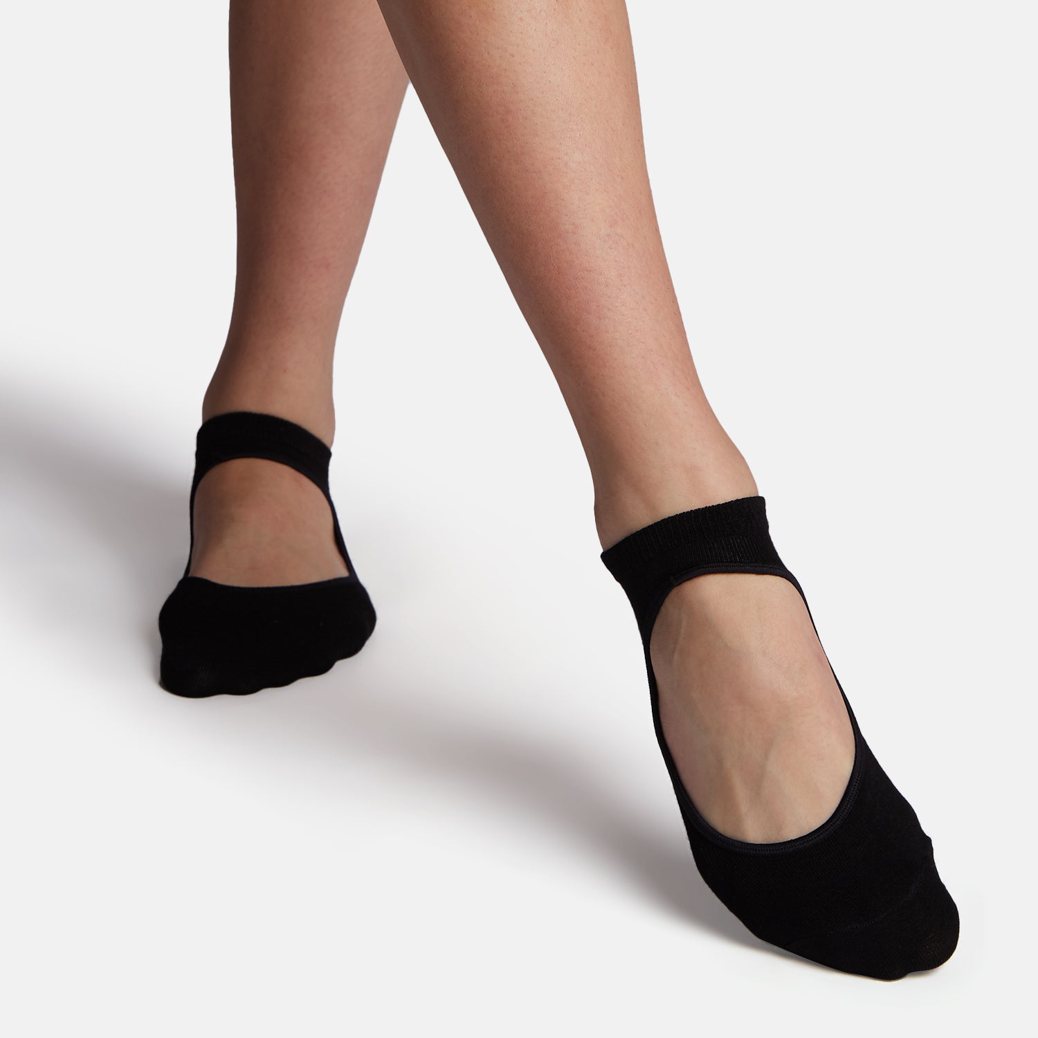 With the ballet slipper straps on the top, they don't slide around on your feet; they're soft, breathable, and comfy and hold up through a workout.