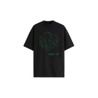 Black oversized tee, including doggo graphic with woof me text on the crest in HD print.