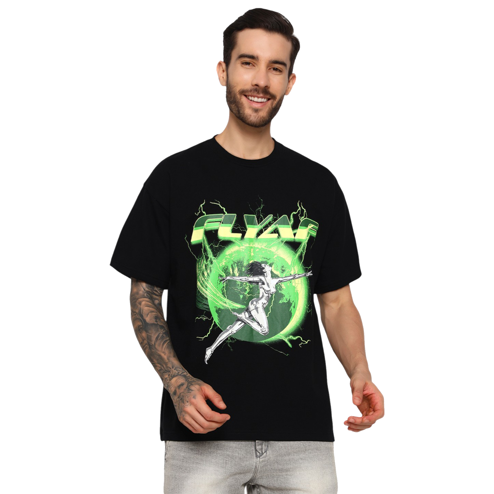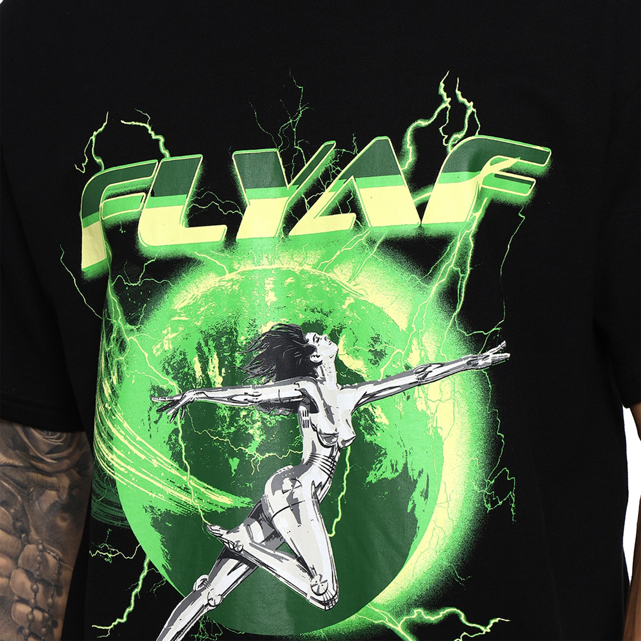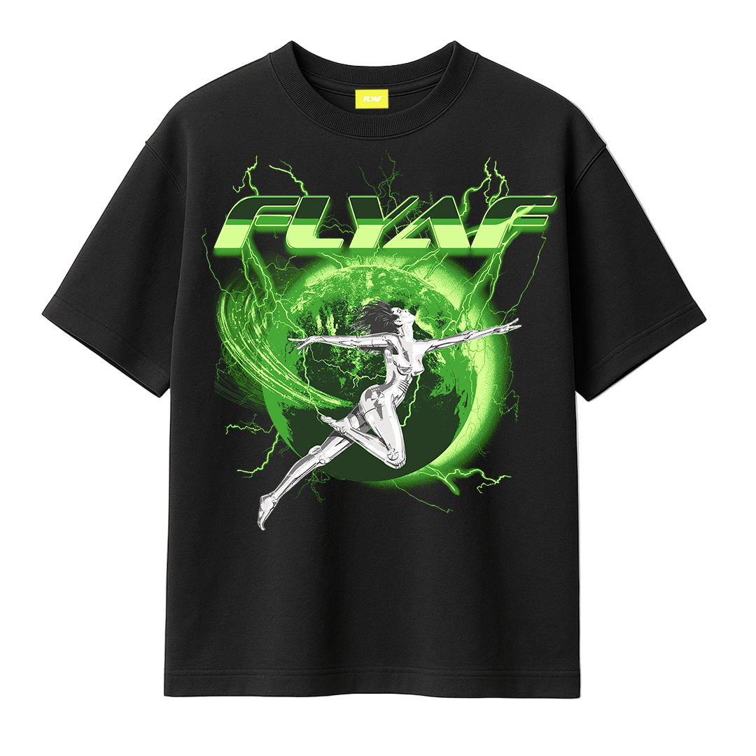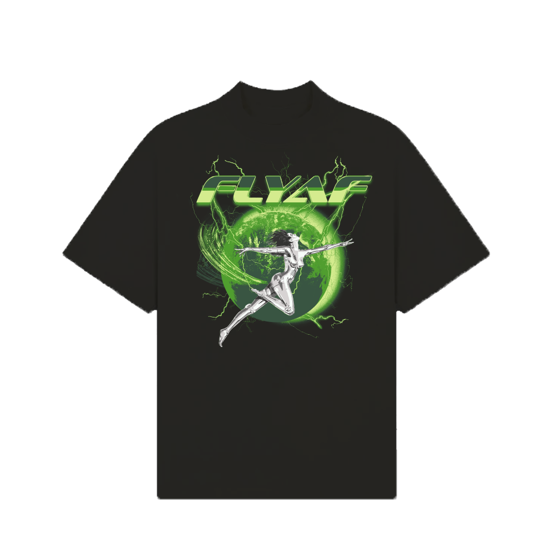 Unleash your futuristic energy with the FLYAF “World Is Your Oyster” Tee. Featuring a high-voltage graphic of a chrome-figure leaping through a glowing green Earth orb, this design is a bold fusion of cyberpunk and streetwear.
