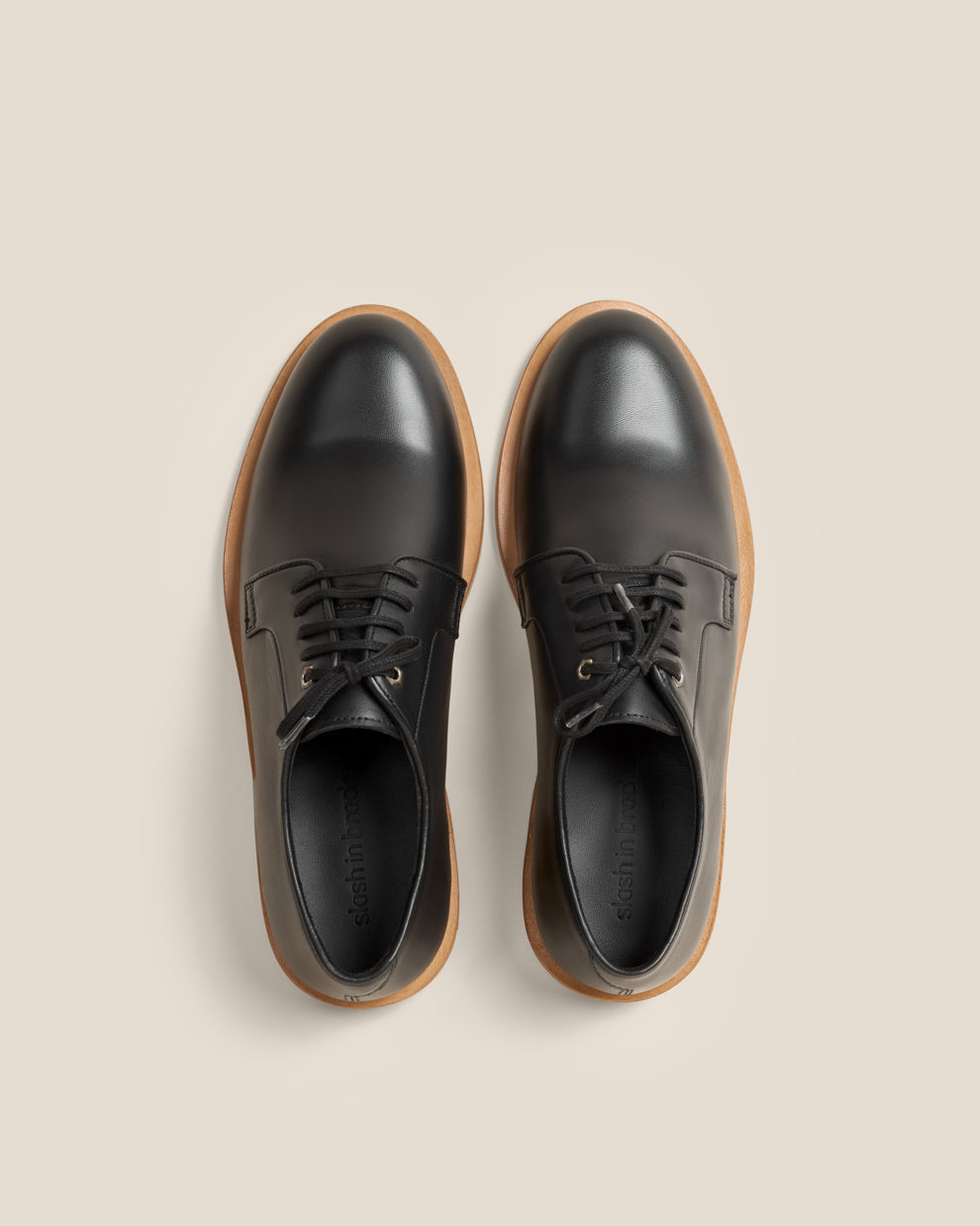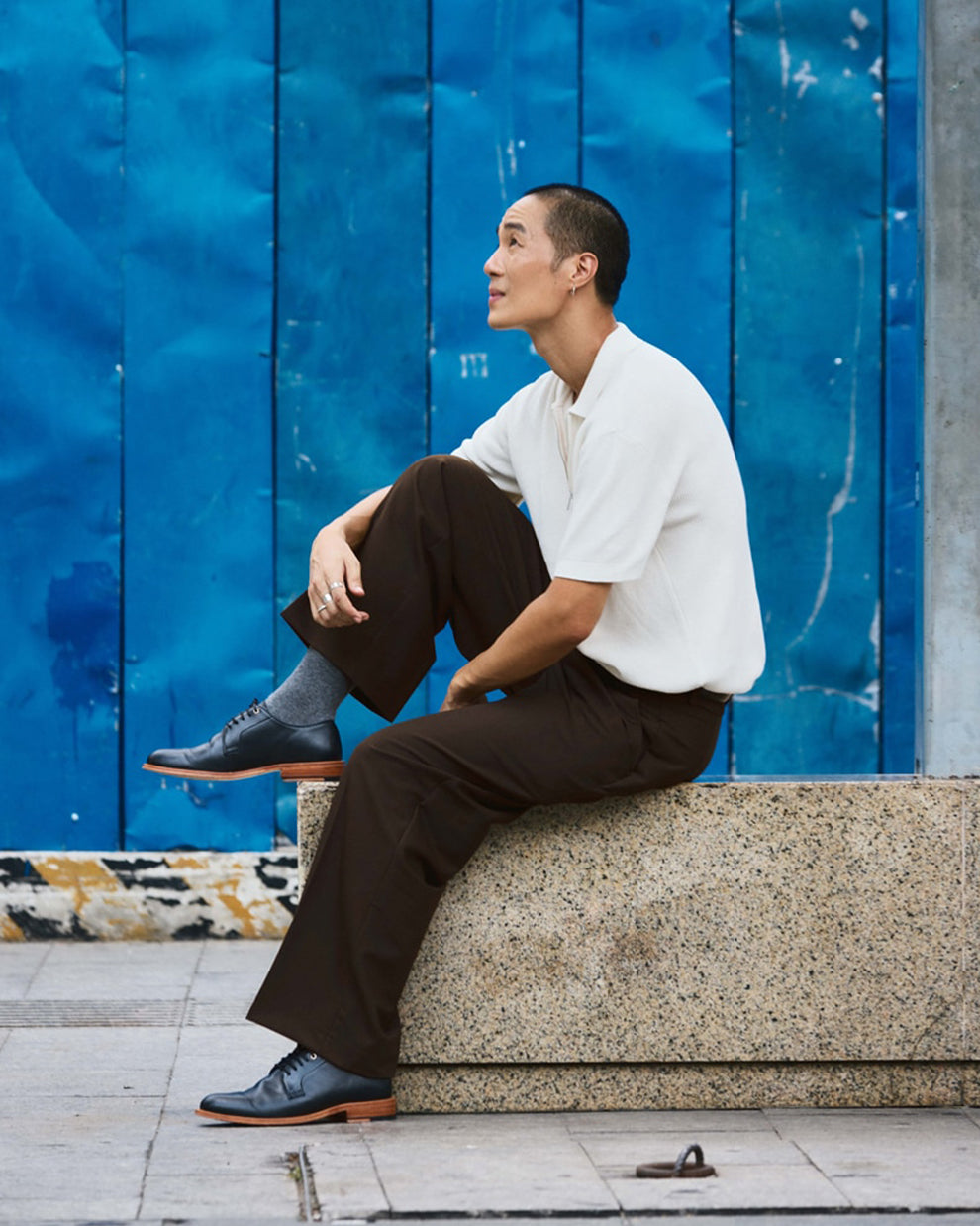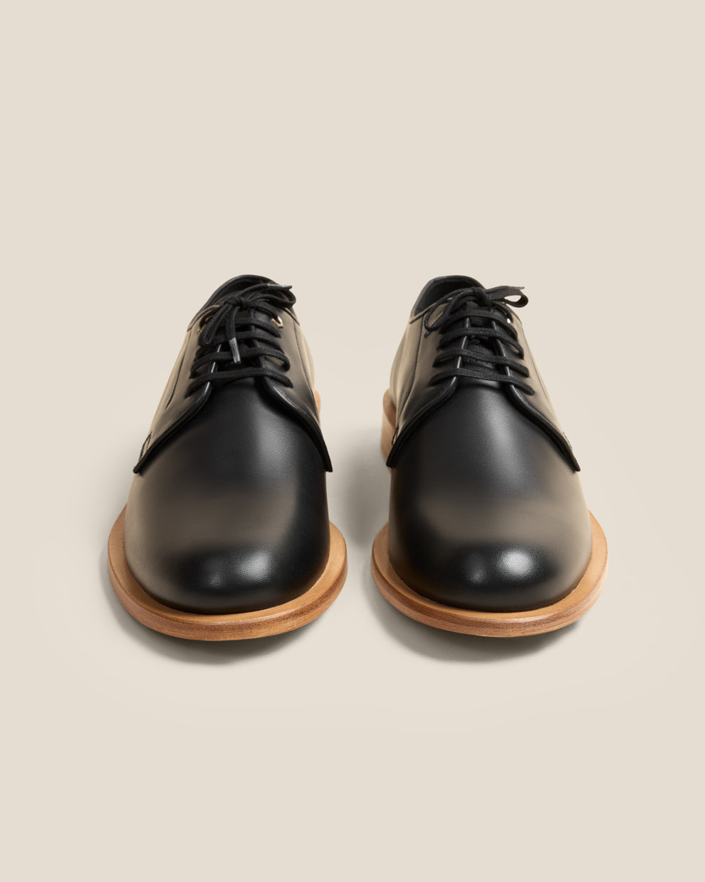 Xan takes the derby off-script. A rounded toe and thick welt keep it grounded, while a single set of pyramid eyelets flips tradition on its head. It’s the kind of shoe that holds its own with wide, washed-out jeans and a boxy lapel-collar shirt. Classic at first glance, subversive on closer look.