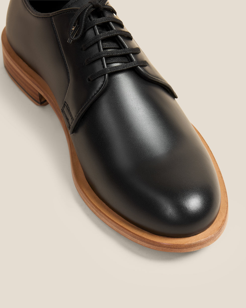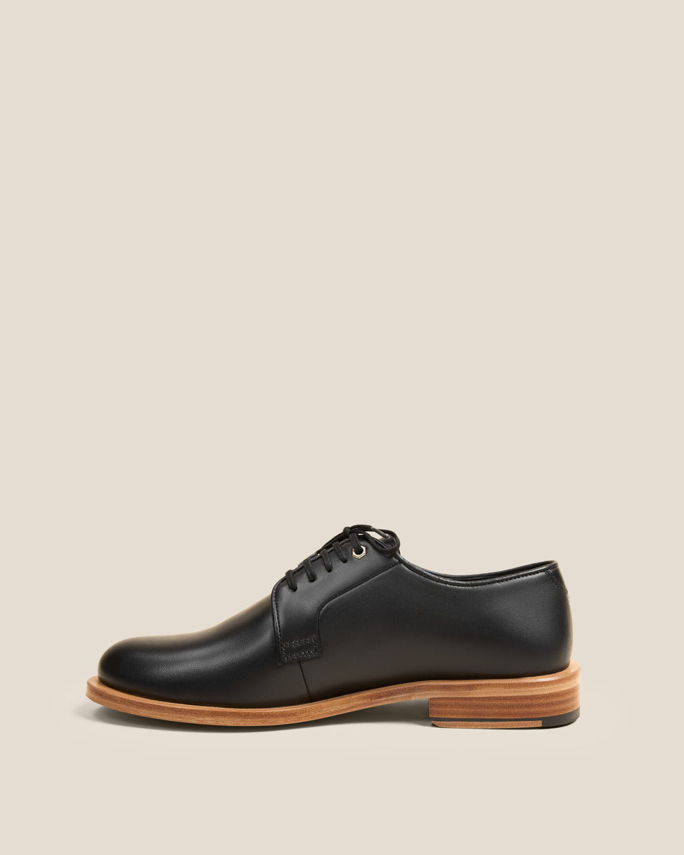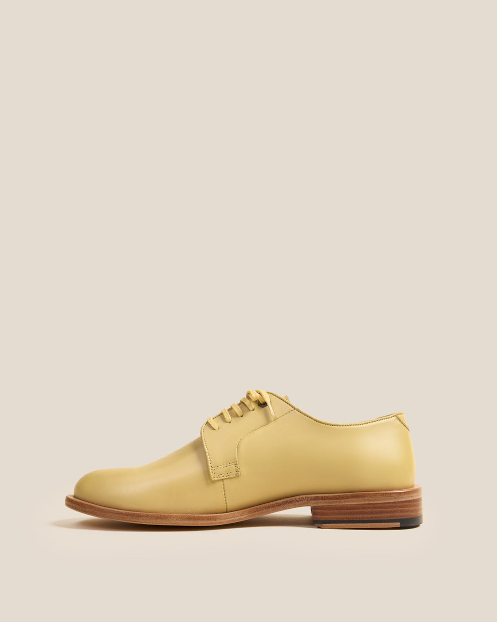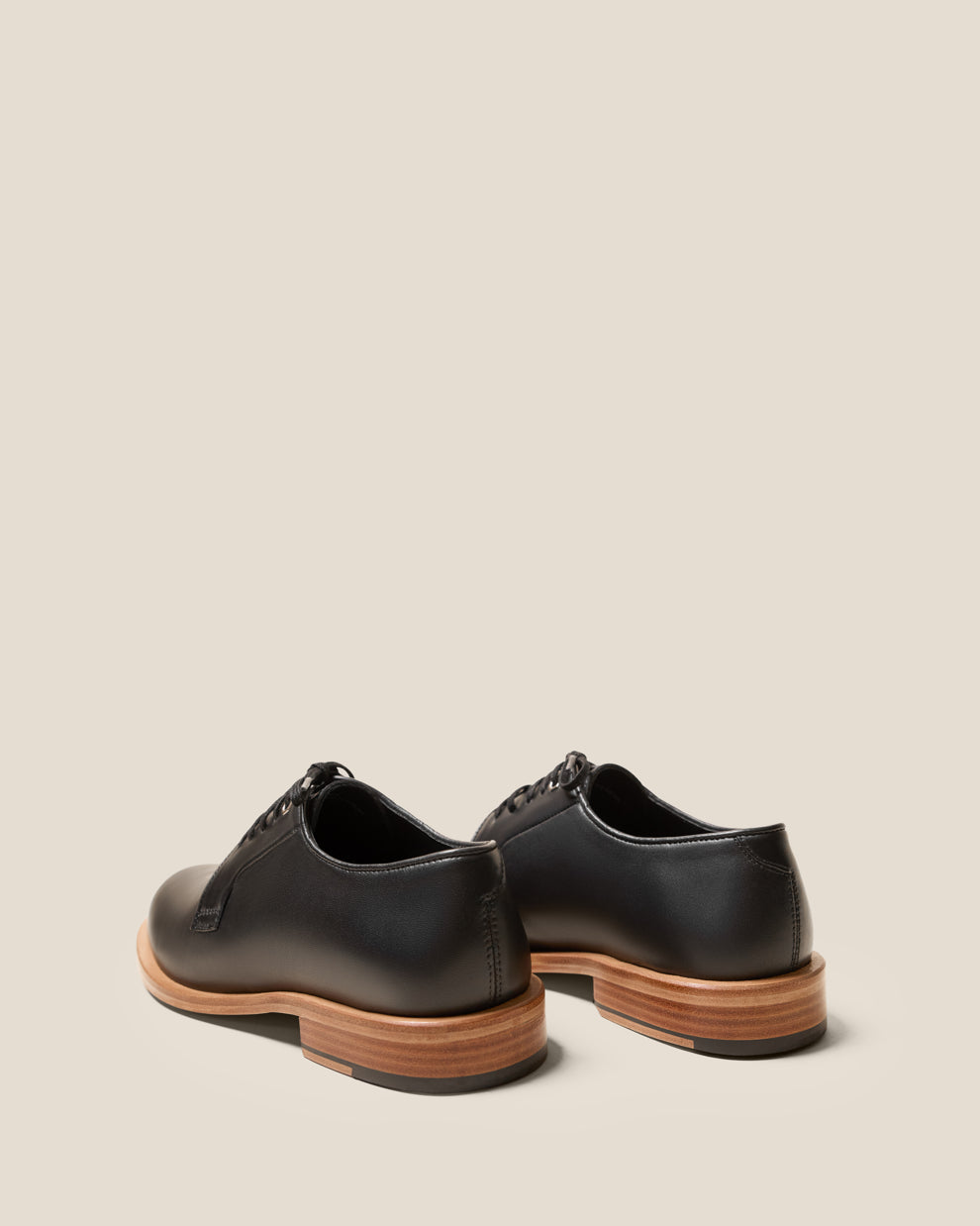 Xan takes the derby off-script. A rounded toe and thick welt keep it grounded, while a single set of pyramid eyelets flips tradition on its head. It’s the kind of shoe that holds its own with wide, washed-out jeans and a boxy lapel-collar shirt. Classic at first glance, subversive on closer look.